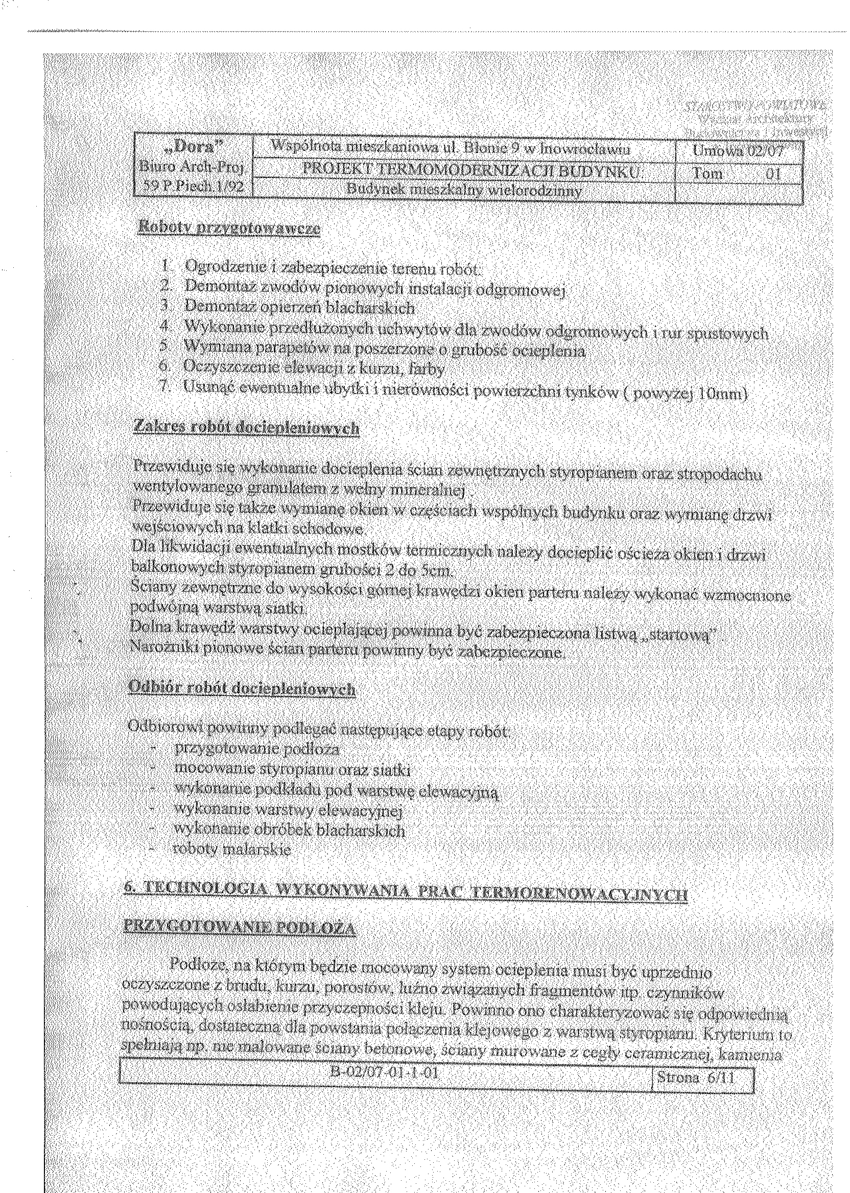 4. Nie dopuszcza si臋 sk艂adania ofert cz臋艣ciowych. 5. Nie dopuszcza si臋 sk艂adania ofert wariantowych. 6. Nie b臋dzie prowadzona aukcja elektroniczna. 7. Numer og艂oszenia w BZP: 120792. – 2007; data zamieszczenia 17.07.2007 r. 8. Opis przedmiotu zam贸wienia. Zam贸wienie obejmuje: dociepelenie i kolorystyk臋聽 艣cian zewn臋trznych, wymian臋 obr贸bek blacharskich, wymian臋 drzwi zewn臋trznych, wymian臋 okien klatek schodowych i piwnic, 聽pokrycie dachu pap膮 termozgrzewaln膮, modernizacja centralnego ogrzewania. 9. Osobami uprawnionymi do kontakt贸w z wykonawcami s膮: 聽聽聽 a) Krystyna Glonek, tel. 052 35 64聽304, 聽聽聽 b) Maria Sarnowska, tel. 052 35 64聽320, 聽聽聽 c) Anna Nawrocka, tel. 052 35 64聽325. 10. Termin (okres) realizacji zam贸wienia: wymagany do 30.06.2008 r. 11. Adres strony internetowej, na kt贸rej dost臋pna jest specyfikacja istotnych warunk贸w zam贸wienia: http://pgkim-inowroclaw.samorzady.pl 12. Op艂ata za otrzymanie specyfikacji istotnych warunk贸w zam贸wienia b臋dzie pokrywa膰 jedynie koszty jej druku oraz聽 przekazania. 13.Wykonawca zainteresowany post臋powaniem powinien z艂o偶y膰 wniosek u zamawiaj膮cego z podaniem wszystkich danych firmy -聽 niezb臋dnych do przekazywania zmian i zapyta艅 dotycz膮cych powy偶szego post臋powania. 14. O udzielenie zam贸wienia mog膮 ubiega膰 si臋 wy艂膮cznie Wykonawcy, kt贸rzy: 1) posiadaj膮 uprawnienia do wykonywania okre艣lonej dzia艂alno艣ci lub czynno艣ci, je偶eli ustawy nak艂adaj膮 obowi膮zek posiadania takich uprawnie艅, 2) posiadaj膮 niezb臋dn膮 wiedz臋 i do艣wiadczenie oraz potencja艂 techniczny, a tak偶e dysponuj膮 osobami zdolnymi do wykonania zam贸wienia, 3) znajduj膮 si臋 w sytuacji ekonomicznej i finansowej zapewniaj膮cej wykonanie zam贸wienia, 4) nie podlegaj膮 wykluczeniu z post臋powania o udzielenie zam贸wienia. Zamawiaj膮cy oceni spe艂nienie warunk贸w wymienionych w niniejszym rozdziale na podstawie z艂o偶onych przez Wykonawc臋 do oferty, o艣wiadcze艅 i dokument贸w. Ocena spe艂niania warunk贸w dokonana zostanie na zasadzie: 聽聽聽聽聽聽聽聽聽聽聽聽聽聽聽聽聽聽聽聽聽聽聽聽聽聽聽聽聽聽聽聽聽聽聽聽聽聽聽聽聽聽 spe艂nia/ nie spe艂nia