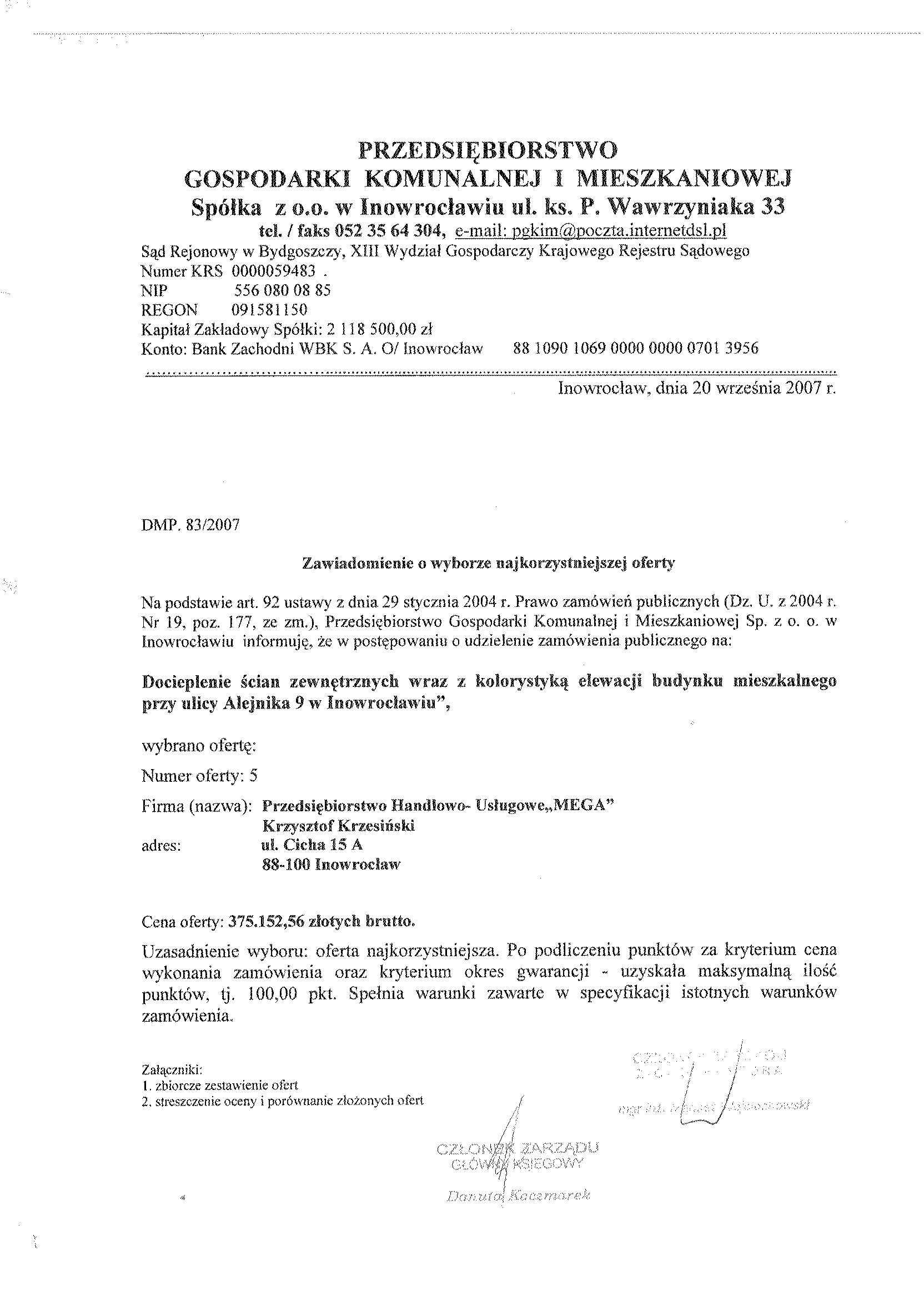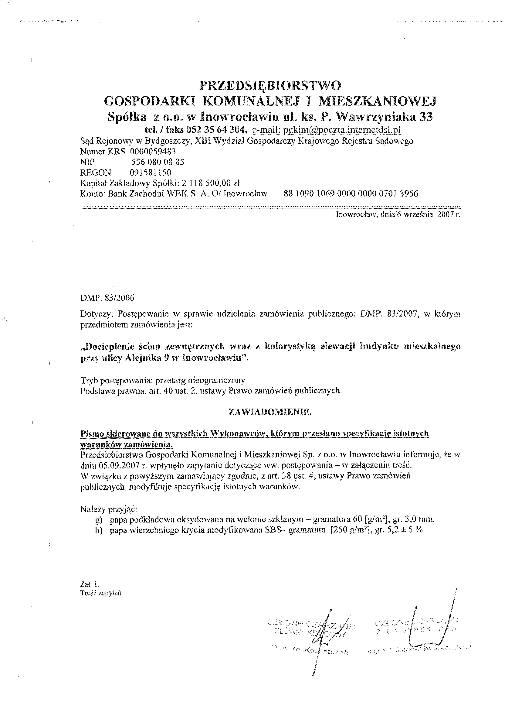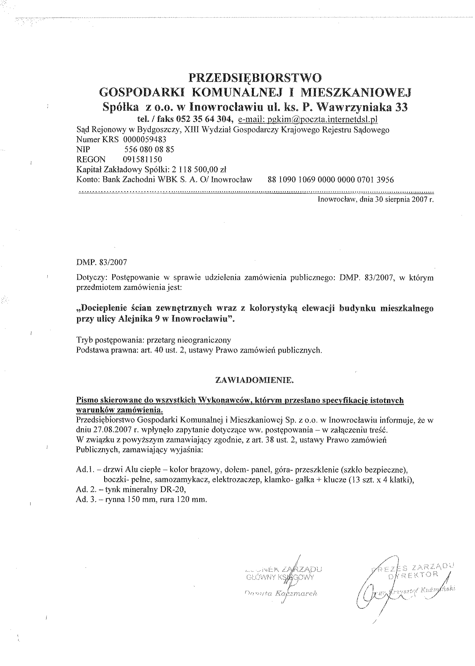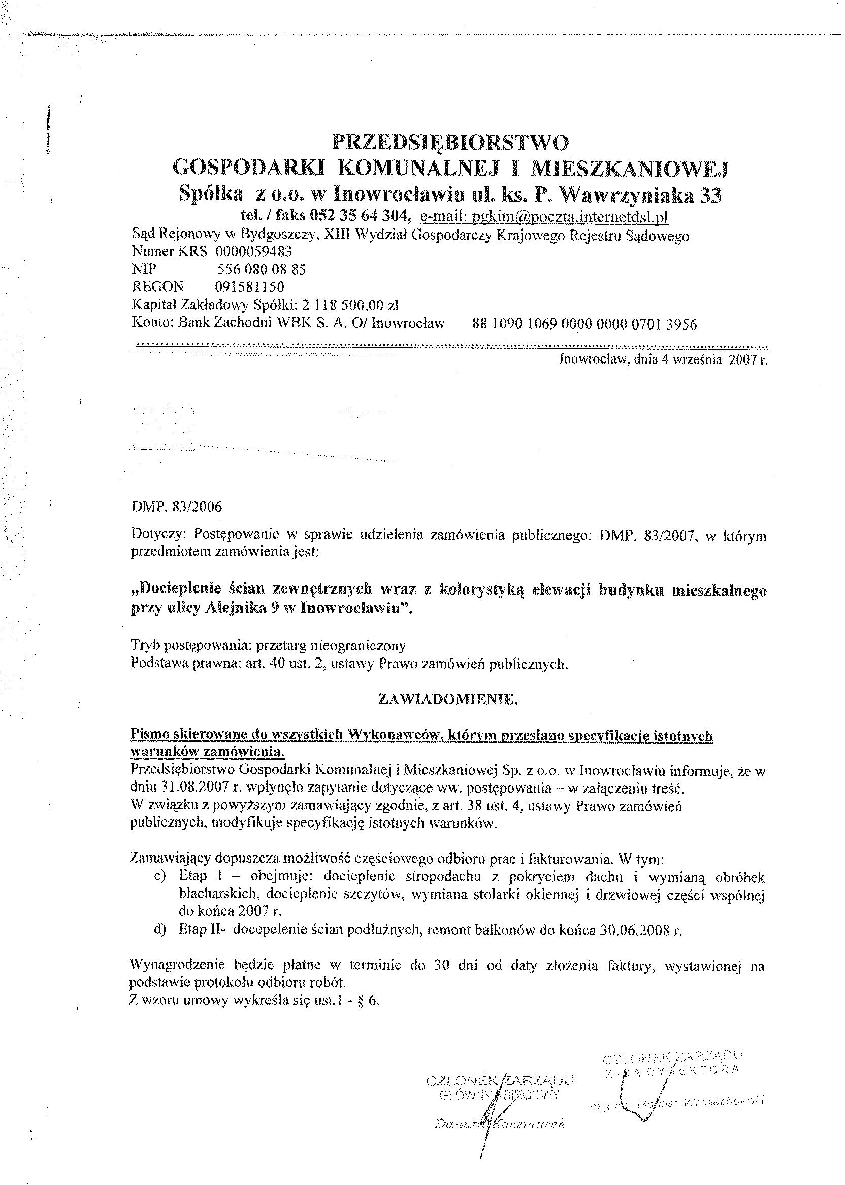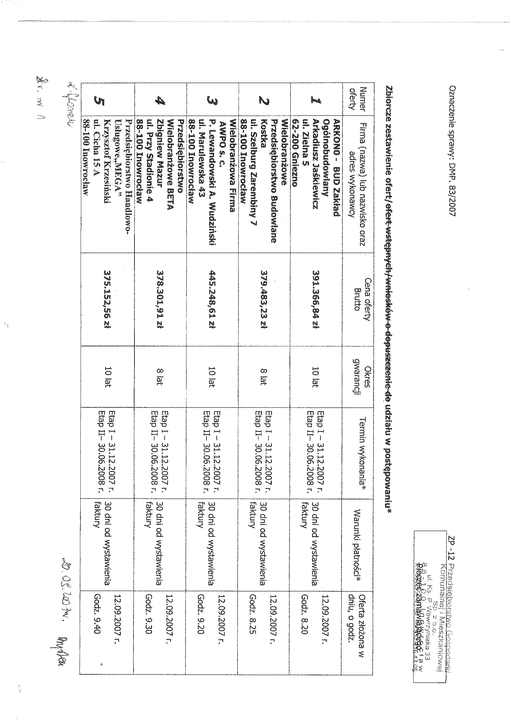 Numer sprawy: DMP. 83/2007聽聽聽聽聽聽聽聽聽聽聽聽聽聽聽聽聽聽聽聽聽聽聽聽聽聽聽聽聽聽聽聽聽聽聽聽 Inowroc艂aw, dnia 21 sierpnia 2007 r.聽聽 聽