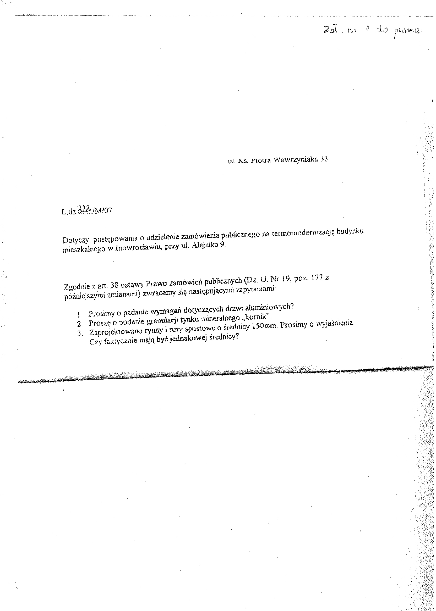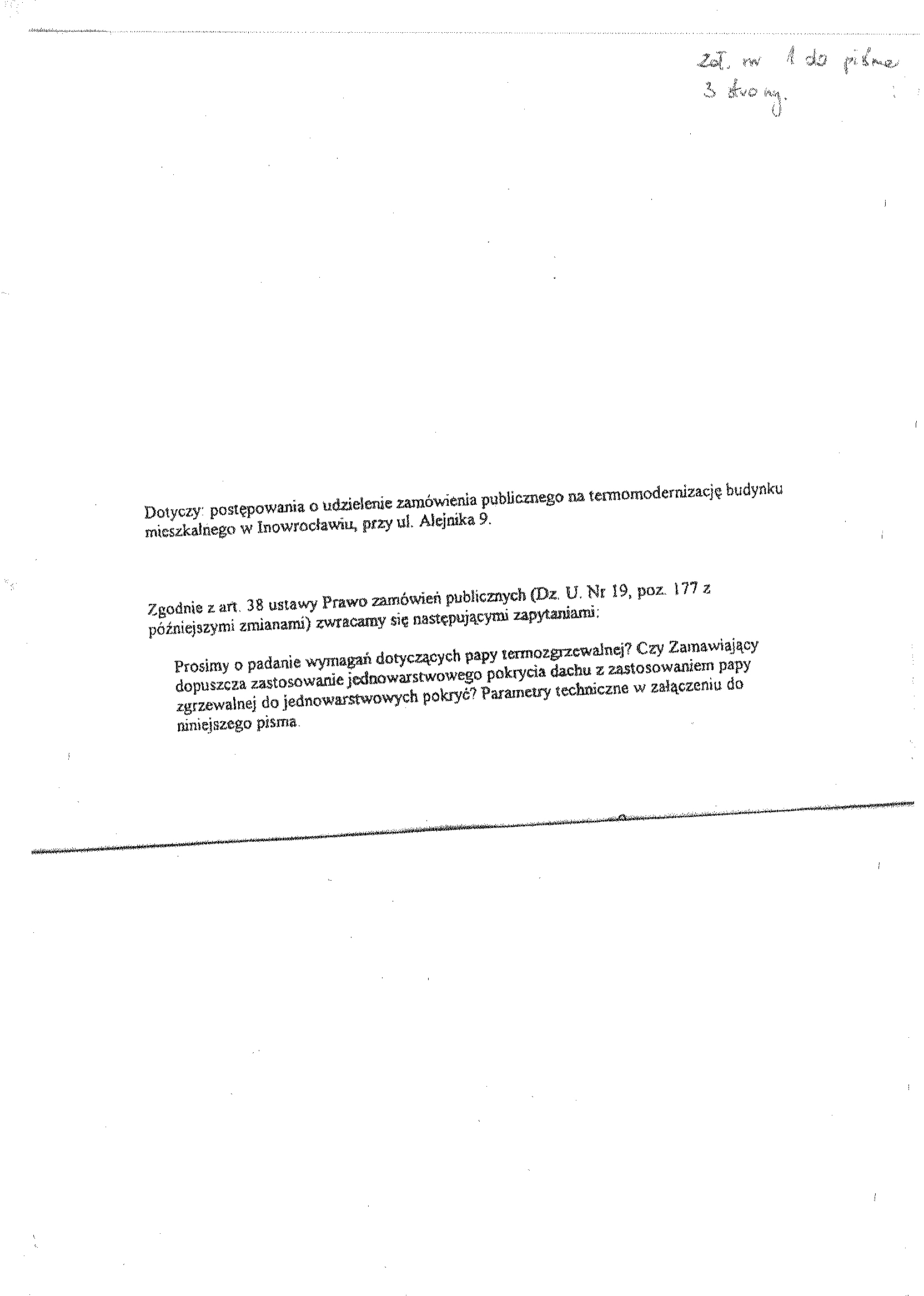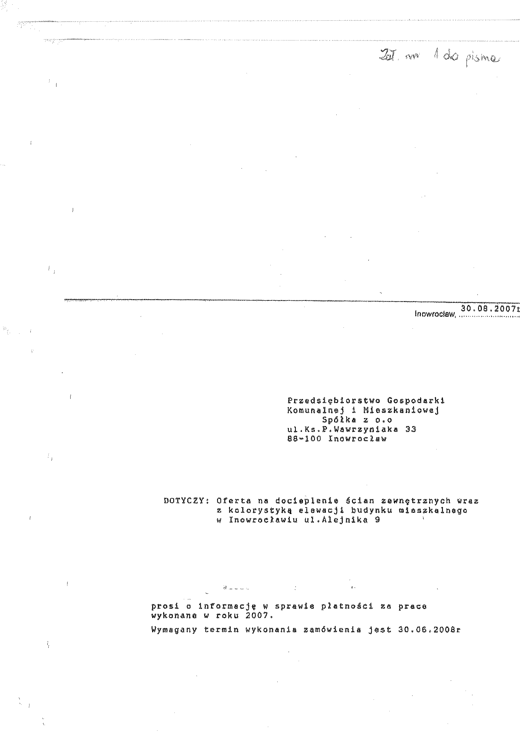 2. Przedmiot zam贸wienia: „Docieplenie 艣cian zewn臋trznych wraz z kolorystyk膮 elewacji budynku mieszkalnego przy ulicy Alejnika 9 w Inowroc艂awiu”. 聽