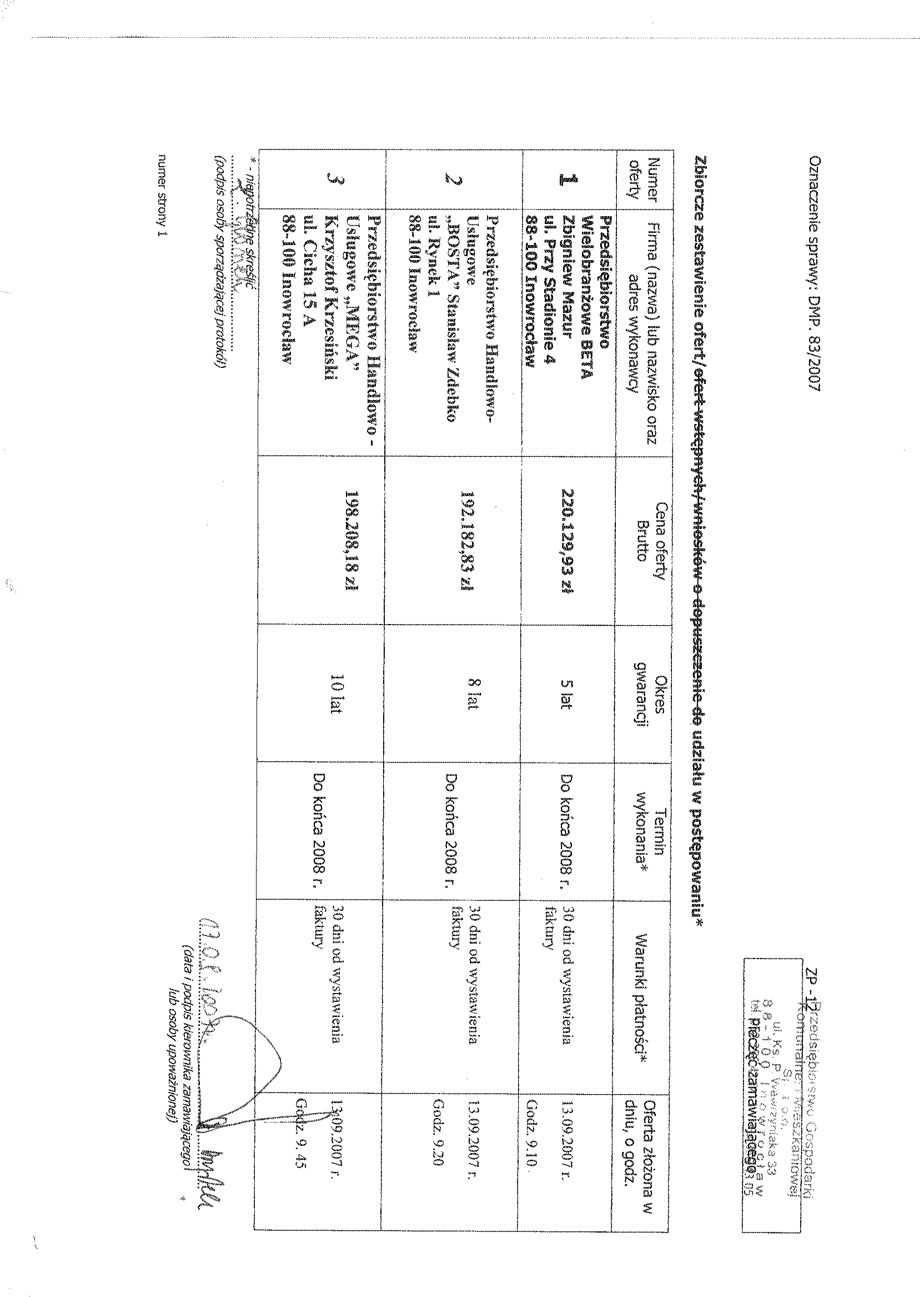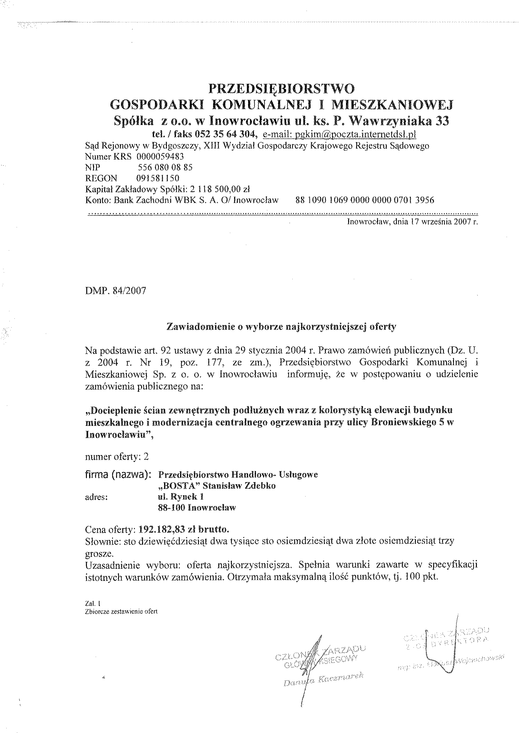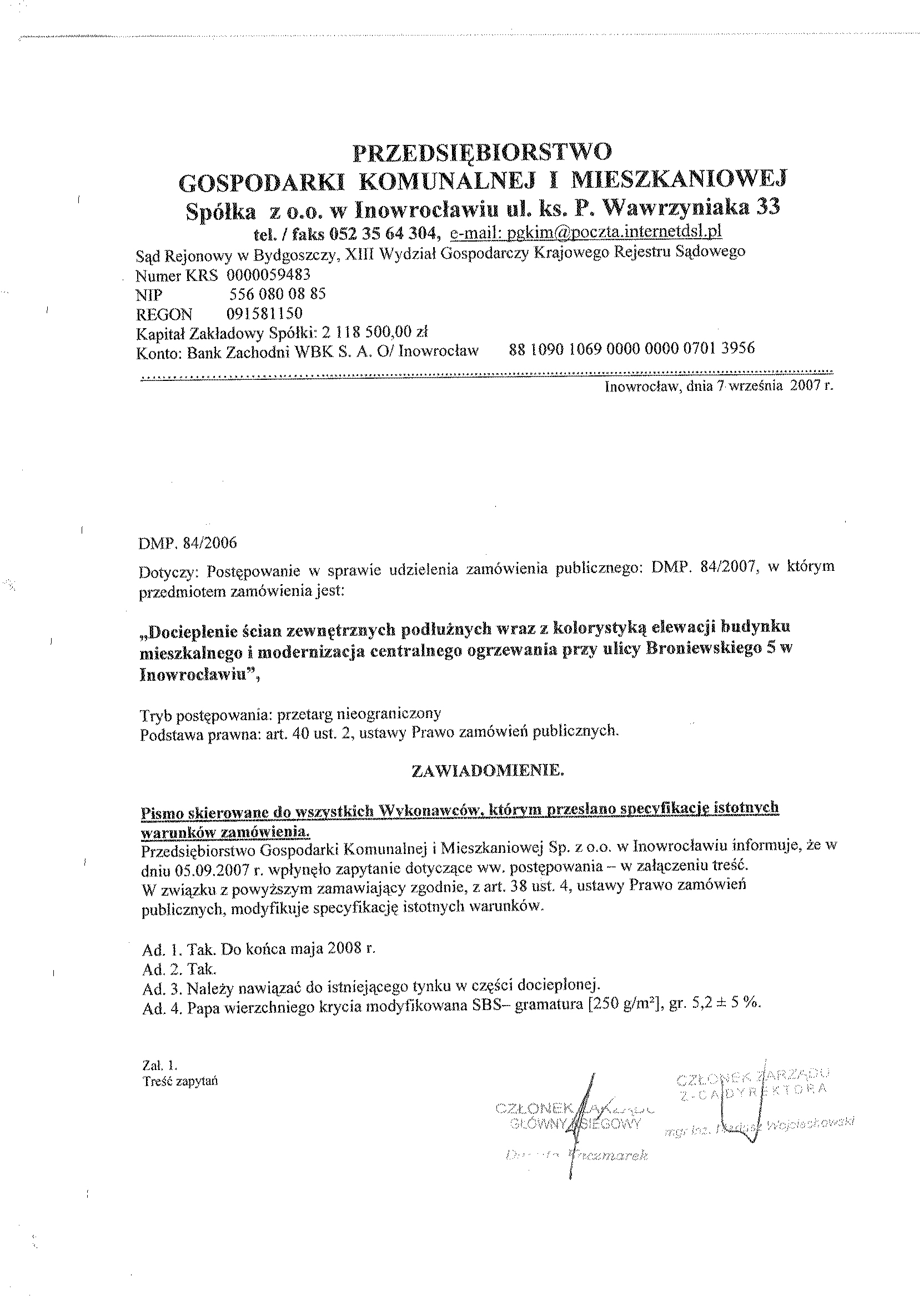 Numer sprawy: DMP. 84/2007聽聽聽聽聽聽聽聽聽聽聽聽聽聽聽聽聽聽聽聽聽聽聽聽聽聽聽聽聽聽聽聽聽聽聽Inowroc艂aw, dnia 23 sierpnia 2007 r.聽聽 聽