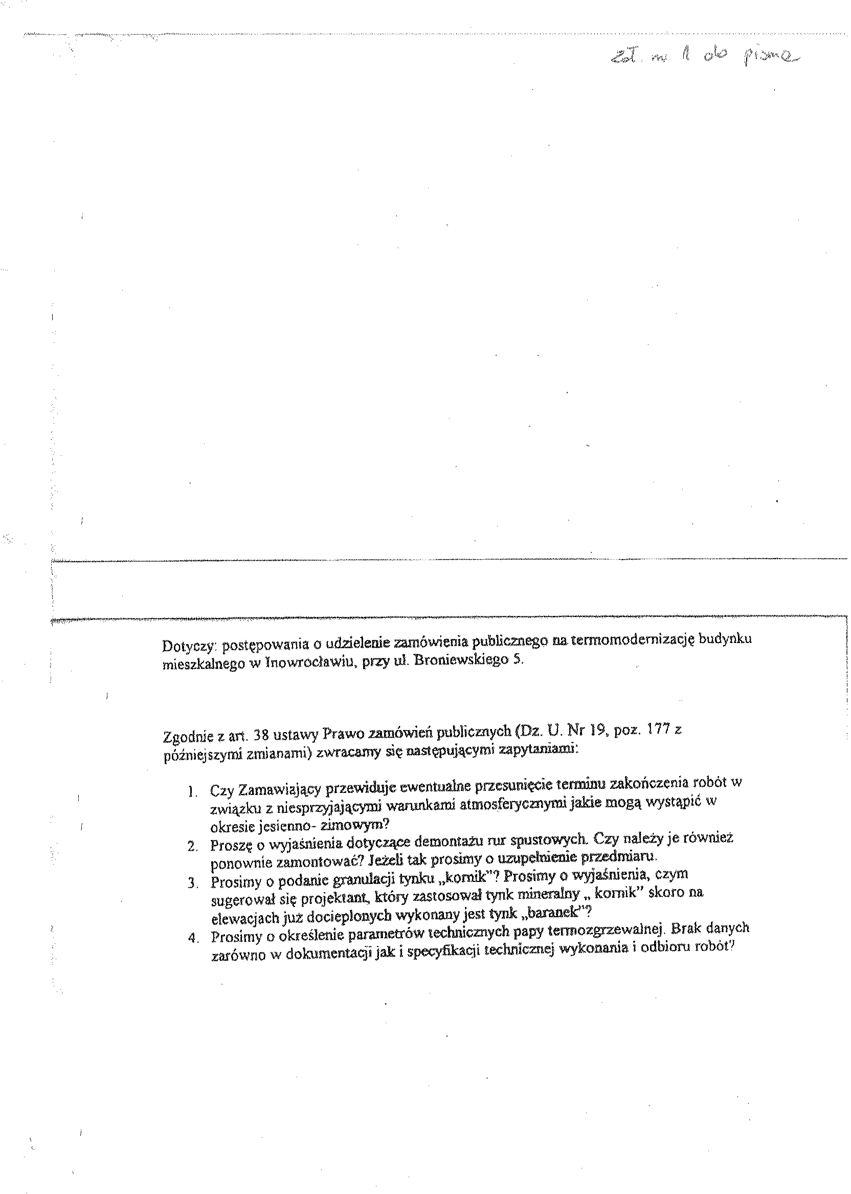 4. Nie dopuszcza si臋 sk艂adania ofert cz臋艣ciowych. 5. Nie dopuszcza si臋 sk艂adania ofert wariantowych. 6. Zamawiaj膮cy nie przewiduje zawarcia umowy ramowej, jak r贸wnie偶 nie dokona wyboru oferty najkorzystniejszej z zastosowaniem aukcji elektronicznej. 7. Numer og艂oszenia w BZP: 148832 – 2007; data zamieszczenia 23.08.2007 r. 8. Opis przedmiotu zam贸wienia. Zam贸wienie obejmuje: rozebranie i monta偶 obr贸bek blacharskich, ocieplenie budynku p艂ytami styropianowymi, mocowanie ko艂kami, ochrona naro偶nik贸w, malowanie farbami, obsadzenie kratek wentylacyjnych, wykucie z muru i wstawienie nowych okien, uzupe艂nienie 艣cian i tynk贸w, demonta偶 i monta偶 instalacji c. o., roboty malarskie i izolacje termiczne (uzupe艂nienie + izolacja na nowy ruroci膮g), przebicie otwor贸w w 艣ciankach i ich zamurowanie. 9. Osobami uprawnionymi do kontakt贸w z wykonawcami s膮: 聽聽聽 a) Krystyna Glonek, tel. 052 35 64聽304, 聽聽聽 b) Maria Sarnowska, tel. 052 35 64聽320, 聽聽聽 c)聽 Dorota Ma艂ek, tel. 052 35 64聽325. 10. Termin (okres) realizacji zam贸wienia: 4 miesi膮ce od podpisania umowy. 11. Adres strony internetowej, na kt贸rej dost臋pna jest specyfikacja istotnych warunk贸w zam贸wienia: http://pgkim-inowroclaw.samorzady.pl 12. Op艂ata za otrzymanie specyfikacji istotnych warunk贸w zam贸wienia b臋dzie pokrywa膰 jedynie koszty jej druku oraz聽 przekazania. 13.Wykonawca zainteresowany post臋powaniem powinien z艂o偶y膰 wniosek u zamawiaj膮cego z podaniem wszystkich danych firmy -聽 niezb臋dnych do przekazywania zmian i zapyta艅 dotycz膮cych powy偶szego post臋powania. 14. O udzielenie zam贸wienia mog膮 ubiega膰 si臋 wy艂膮cznie Wykonawcy, kt贸rzy: 1) posiadaj膮 uprawnienia do wykonywania okre艣lonej dzia艂alno艣ci lub czynno艣ci, je偶eli ustawy nak艂adaj膮 obowi膮zek posiadania takich uprawnie艅, 2) posiadaj膮 niezb臋dn膮 wiedz臋 i do艣wiadczenie oraz potencja艂 techniczny, a tak偶e dysponuj膮 osobami zdolnymi do wykonania zam贸wienia, 3) znajduj膮 si臋 w sytuacji ekonomicznej i finansowej zapewniaj膮cej wykonanie zam贸wienia, 4) nie podlegaj膮 wykluczeniu z post臋powania o udzielenie zam贸wienia. 聽