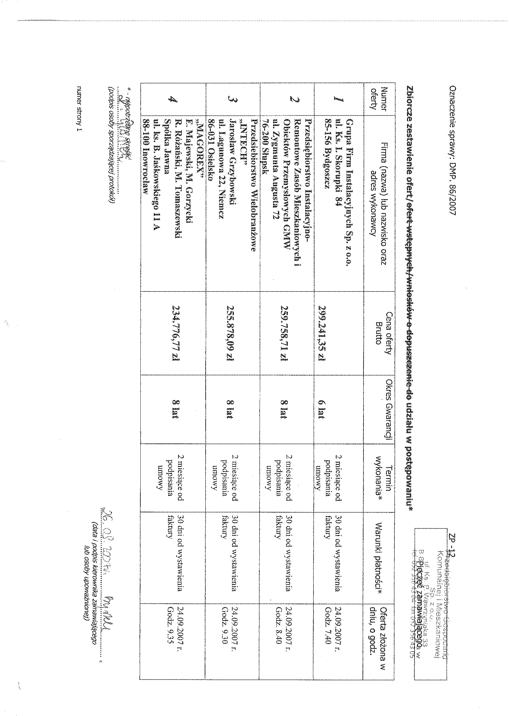 12. W celu potwierdzenia, 偶e wykonawca posiada uprawnienie do wykonywania okre艣lonej dzia艂alno艣ci lub czynno艣ci oraz nie podlega wykluczeniu na podstawie art. 24 ustawy z dnia 29 stycznia 2004 r. - Prawo zam贸wie艅 publicznych, zwanej dalej "ustaw膮", zamawiaj膮cy 偶膮da nast臋puj膮cych dokument贸w: a) aktualnego odpisu z w艂a艣ciwego rejestru albo aktualnego za艣wiadczenia o wpisie do ewidencji dzia艂alno艣ci gospodarczej, je偶eli odr臋bne przepisy wymagaj膮 wpisu do rejestru lub zg艂oszenia do ewidencji dzia艂alno艣ci gospodarczej, wystawionego nie wcze艣niej ni偶 6 miesi臋cy przed up艂ywem terminu sk艂adania ofert, b) o艣wiadczenie wykonawcy, 偶e nie posiada zaleg艂o艣ci podatkowej wobec Naczelnika Urz臋du Skarbowego, c) o艣wiadczenie wykonawcy, 偶e nie posiada zaleg艂o艣ci wobec Zak艂adu Ubezpiecze艅 Spo艂ecznych w op艂acaniu sk艂adek na ubezpieczenie spo艂eczne, zdrowotne oraz Fundusz Pracy. 12.1. W celu potwierdzenia posiadania przez wykonawc臋 niezb臋dnej wiedzy i do艣wiadczenia oraz os贸b zdolnych do wykonania zam贸wienia, zamawiaj膮cy 偶膮da nast臋puj膮cych dokument贸w: a) wykazu wykonanych rob贸t budowlanych w okresie ostatniego 1 roku, przed dniem wszcz臋cia post臋powania o udzielenie zam贸wienia, z podaniem ich warto艣ci oraz daty i miejsca wykonania oraz za艂膮czeniem dokument贸w potwierdzaj膮cych, 偶e roboty te zosta艂y wykonane nale偶ycie, z艂. nr 2 do siwz (minimum 1 referencja), b) zamawiaj膮cy 偶膮da za艂膮czenia kserokopii uprawnie艅 budowlanych w specjalno艣ciach obj臋tych przedmiotem zam贸wienia, c) aktualnego wpisu do w艂a艣ciwych Izb Zawodowych. 12.2. W celu potwierdzenia, 偶e wykonawca znajduje si臋 w sytuacji ekonomicznej i finansowej zapewniaj膮cej wykonanie zam贸wienia zamawiaj膮cy 偶膮da nast臋puj膮cych dokument贸w: a) polisy, a w przypadku jej braku innego dokumentu potwierdzaj膮cego, 偶e wykonawca jest ubezpieczony od odpowiedzialno艣ci cywilnej w zakresie prowadzonej dzia艂alno艣ci. 12.3. Wype艂nione nast臋puj膮ce za艂膮czniki: a) o艣wiadczenie w trybie art.22 ust.1 pkt.1-4聽 ustawy聽 Pzp (za艂. nr 3 do siwz). b) formularz ofertowy wykonawcy (za艂. nr 1 do swiz). 12.4.Kosztorys ofertowy, kt贸ry musi by膰 integraln膮 cz臋艣ci膮 z艂o偶onej oferty. Podstaw膮 do opracowania przez Wykonawc臋聽 kosztorysu ofertowego jest聽 przedmiar rob贸t, b臋d膮cy za艂膮cznikiem do siwz. Wykonawca mo偶e przyj膮膰 dowoln膮 form臋 i podstaw臋 wyceny rob贸t. 13. Kryteria oceny ofert: a) cena wykonania zam贸wienia, stanowi聽聽聽聽 -聽聽聽聽聽聽聽 80 % b) gwarancja, stanowi聽聽聽聽聽聽聽聽聽聽聽聽聽聽聽聽聽聽聽聽聽聽聽聽聽聽聽聽聽聽聽聽聽 -聽聽 20 % 14. Termin sk艂adania ofert: Data: 20.09.2007 r. godz. 9.50 -聽 otwarcie: 20.09.2007 r. godz. 10.00 15. Miejsce sk艂adania ofert: Przedsi臋biorstwo Gospodarki Komunalnej i Mieszkaniowej sp. z o.o. w Inowroc艂awiu, ul. ks. P. Wawrzyniaka 33, sekretariat 1 pi臋tro. 16. Zwi膮zanie ofert膮聽 30 dni. 17. Zabezpieczenie nale偶ytego wykonania umowy zamawiaj膮cy ustali艂 w wysoko艣ci 2 % od ustalonej warto艣ci zam贸wienia. 聽