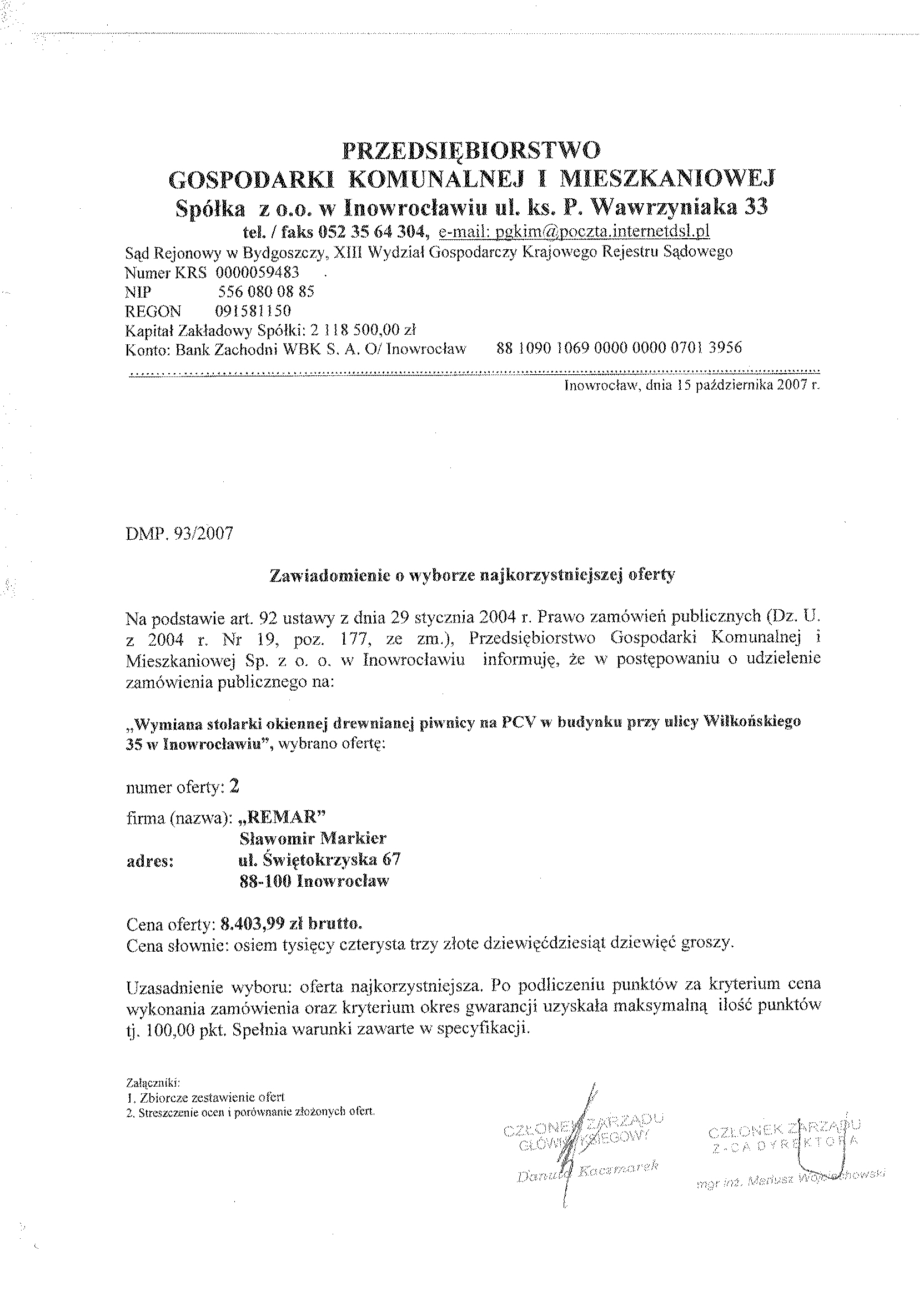 15. W celu potwierdzenia, 偶e Wykonawca posiada uprawnienie do wykonywania okre艣lonej dzia艂alno艣ci lub czynno艣ci oraz nie podlega wykluczeniu na podstawie art. 24 ustawy z dnia 29 stycznia 2004 r. - Prawo zam贸wie艅 publicznych, zamawiaj膮cy 偶膮da, nast臋puj膮cych dokument贸w: a) aktualnego odpisu z w艂a艣ciwego rejestru albo aktualnego za艣wiadczenia o wpisie do ewidencji dzia艂alno艣ci gospodarczej, je偶eli odr臋bne przepisy wymagaj膮 wpisu do rejestru lub zg艂oszenia do ewidencji dzia艂alno艣ci gospodarczej, wystawionego nie wcze艣niej ni偶 6 miesi臋cy przed up艂ywem聽 terminu sk艂adania ofert; b) o艣wiadczenie wykonawcy, 偶e nie posiada zaleg艂o艣ci podatkowej wobec Naczelnika Urz臋du Skarbowego, c) o艣wiadczenie wykonawcy, 偶e nie posiada zaleg艂o艣ci wobec Zak艂adu Ubezpiecze艅 Spo艂ecznych w op艂acaniu sk艂adek na ubezpieczenie spo艂eczne, zdrowotne oraz Fundusz Pracy. 15.1.W celu potwierdzenia posiadania przez wykonawc臋 niezb臋dnej wiedzy i do艣wiadczenia oraz os贸b zdolnych do wykonania zam贸wienia, zamawiaj膮cy 偶膮da nast臋puj膮cych dokument贸w: a) wykazu wykonanych rob贸t budowlanych w okresie ostatniego 1 roku, przed dniem wszcz臋cia post臋powania o udzielenie zam贸wienia, z podaniem ich warto艣ci oraz daty i miejsca wykonania oraz za艂膮czeniem dokument贸w potwierdzaj膮cych, 偶e roboty te zosta艂y wykonane nale偶ycie, z艂. nr 2 do siwz (minimum 1 referencja), 15.2. W celu potwierdzenia, 偶e wykonawca znajduje si臋 w sytuacji ekonomicznej i finansowej zapewniaj膮cej wykonanie zam贸wienia zamawiaj膮cy 偶膮da nast臋puj膮cych dokument贸w: a) polisy, a w przypadku jej braku innego dokumentu potwierdzaj膮cego, 偶e wykonawca jest聽聽聽 ubezpieczony od odpowiedzialno艣ci cywilnej w zakresie prowadzonej dzia艂alno艣ci. 15.3. Kalkulacja koszt贸w wymiany okien (za艂. nr 6 do siwz), kt贸ra musi by膰 integraln膮 cz臋艣ci膮 z艂o偶onej oferty. Wykonawca mo偶e przyj膮膰 dowoln膮 form臋 i聽 podstaw臋 wyceny rob贸t. 15.4. Kserokopi臋 atestu na okna, certyfikat (je艣li posiada) oraz atest na profile okienne. 15.5. Wype艂nione nast臋puj膮ce za艂膮czniki: a) o艣wiadczenie w trybie art.22 ust.1 pkt.1-4聽 ustawy聽 Pzp (za艂. nr 3 do siwz), b) formularz ofertowy wykonawcy (za艂. nr 1 do swiz), 聽聽聽 16. Miejsce i termin sk艂adania ofert: sekretariat Przedsi臋biorstwa Gospodarki Komunalnej i Mieszkaniowej Sp. z o.o., ul. ks. Piotra Wawrzyniaka 33, 88-100 Inowroc艂aw, do dnia 8 pa藕dziernika 2007 r. do godz. 9.50. 17. Kryteria wyboru oferty聽 (w % ): a) cena wykonania zam贸wienia - 80 % b) gwarancja - 20 %. 18. Zamawiaj膮cy nie wymaga wadium. 19.Miejsce i termin otwarcia ofert: Przedsi臋biorstwo Gospodarki Komunalnej i Mieszkaniowej Sp. z o.o., ul. ks. Piotra Wawrzyniaka 33, 88-100 Inowroc艂aw dnia 8 pa藕dziernika 2007聽 r.聽 o godz. 10.00 (salka konferencyjna). 20.Termin zwi膮zania聽 ofert膮: 30 dni . 21. Zamawiaj膮cy nie wymaga wniesienia zabezpieczenia nale偶ytego wykonania umowy. 聽聽聽聽聽聽聽聽聽聽聽聽聽聽聽聽聽聽聽聽聽聽聽聽聽聽聽聽聽聽聽聽聽聽聽聽聽聽聽聽聽聽聽聽聽聽聽聽聽聽聽聽聽聽聽聽聽聽 聽聽聽聽聽聽聽聽聽聽聽聽聽聽 聽聽聽聽聽聽聽聽聽聽聽聽聽聽聽聽聽聽聽聽聽聽聽聽聽聽聽聽聽聽聽聽聽聽聽聽聽聽聽聽聽聽聽聽聽聽聽聽聽聽聽聽聽聽聽聽聽聽聽聽聽聽聽聽聽聽聽Podpis: