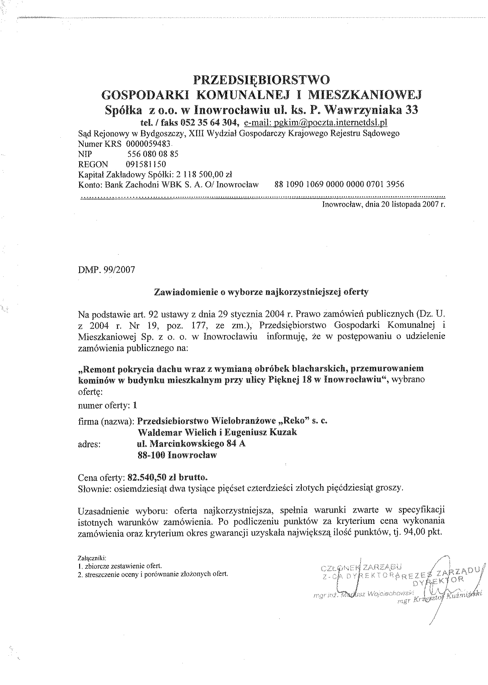Numer sprawy: DMP. 99/2007聽聽聽聽聽聽聽聽聽聽聽聽聽聽聽聽聽聽聽聽聽聽聽聽聽聽聽Inowroc艂aw, dnia 12 pa藕dziernika 2007 r.聽聽 聽