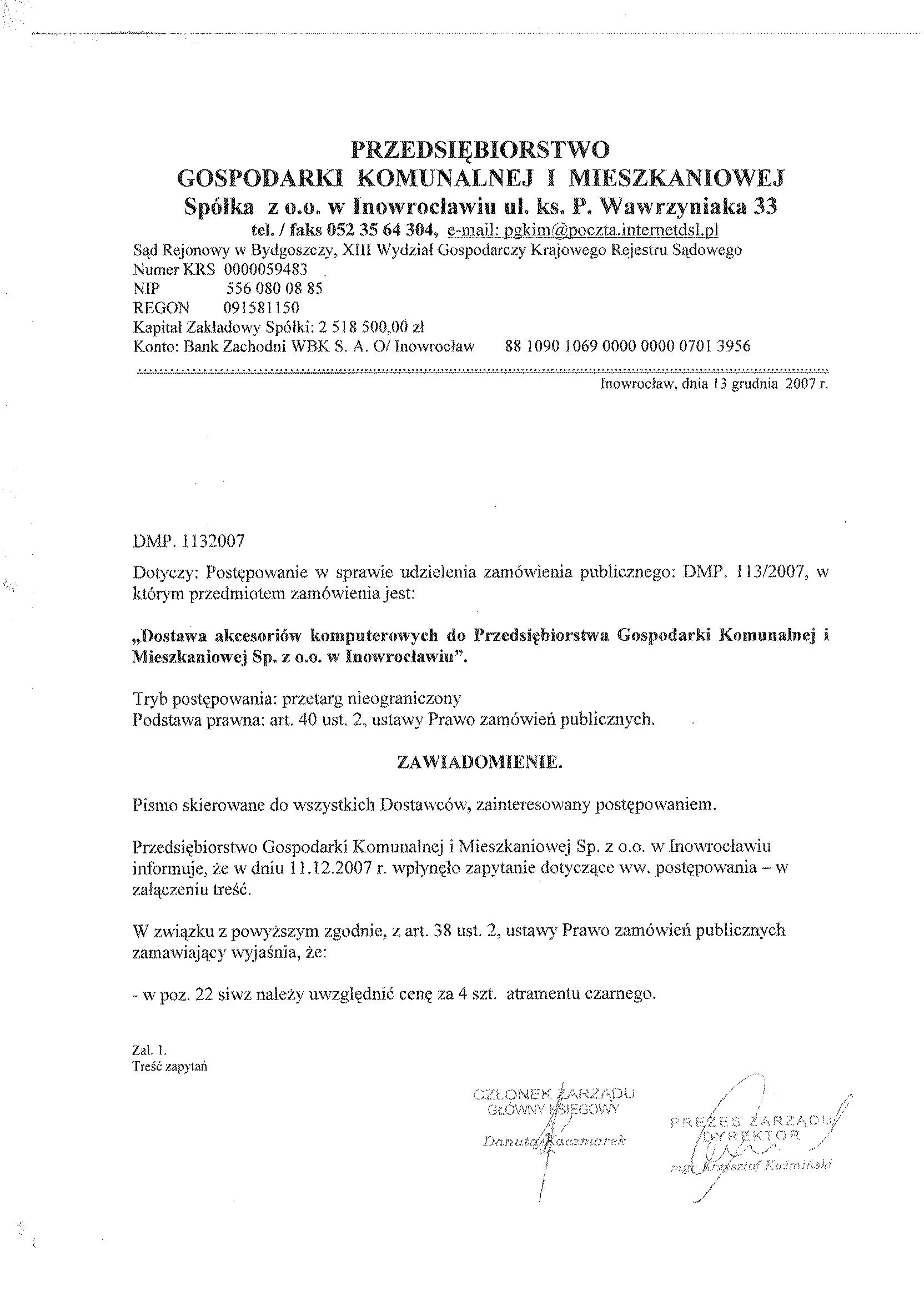 聽聽聽聽聽 S膮d Rejonowy w Bydgoszczy, XIII Wydzia艂 Gospodarczy Krajowego Rejestru S膮dowego 聽聽聽聽聽 Numer KRS 聽0000059483 聽聽聽聽聽 REGON: 091581150 聽NIP: 556-080-08-85 聽聽聽聽聽 Kapita艂 zak艂adowy Sp贸艂ki: 2聽118聽500, 00 z艂 聽聽聽聽聽 Konto: Bank Zachodni WBK S. A.O/ Inowroc艂aw聽聽聽聽聽 88 1090 1069 0000 0000 0701 3956 聽聽聽聽聽 聽聽聽聽聽 2. Przedmiot zam贸wienia. 2.1. Nazwa nadana zam贸wieniu: "Dostawa akcesori贸w komputerowych do Przedsi臋biorstwa Gospodarki Komunalnej i Mieszkaniowej Sp. z o.o. w Inowroc艂awiu".
