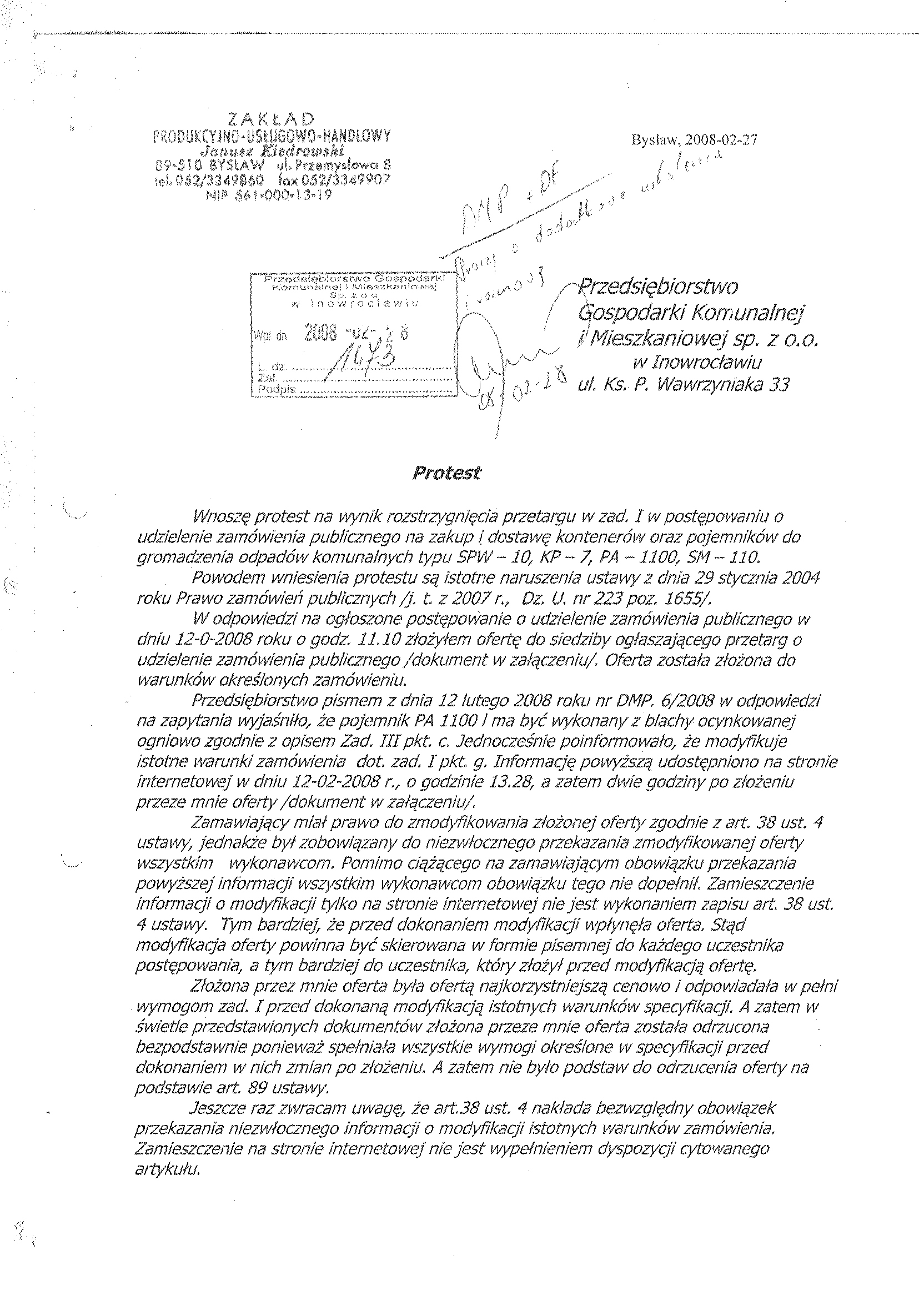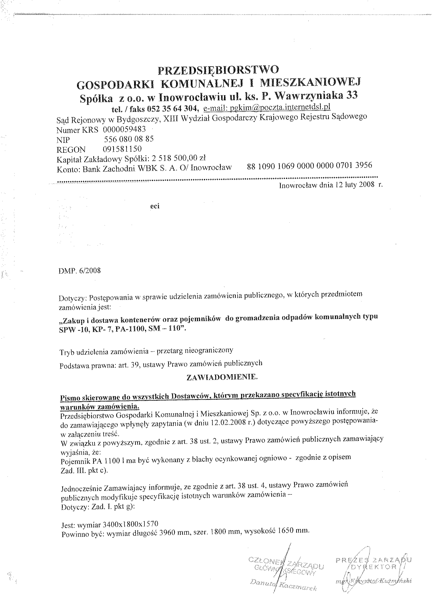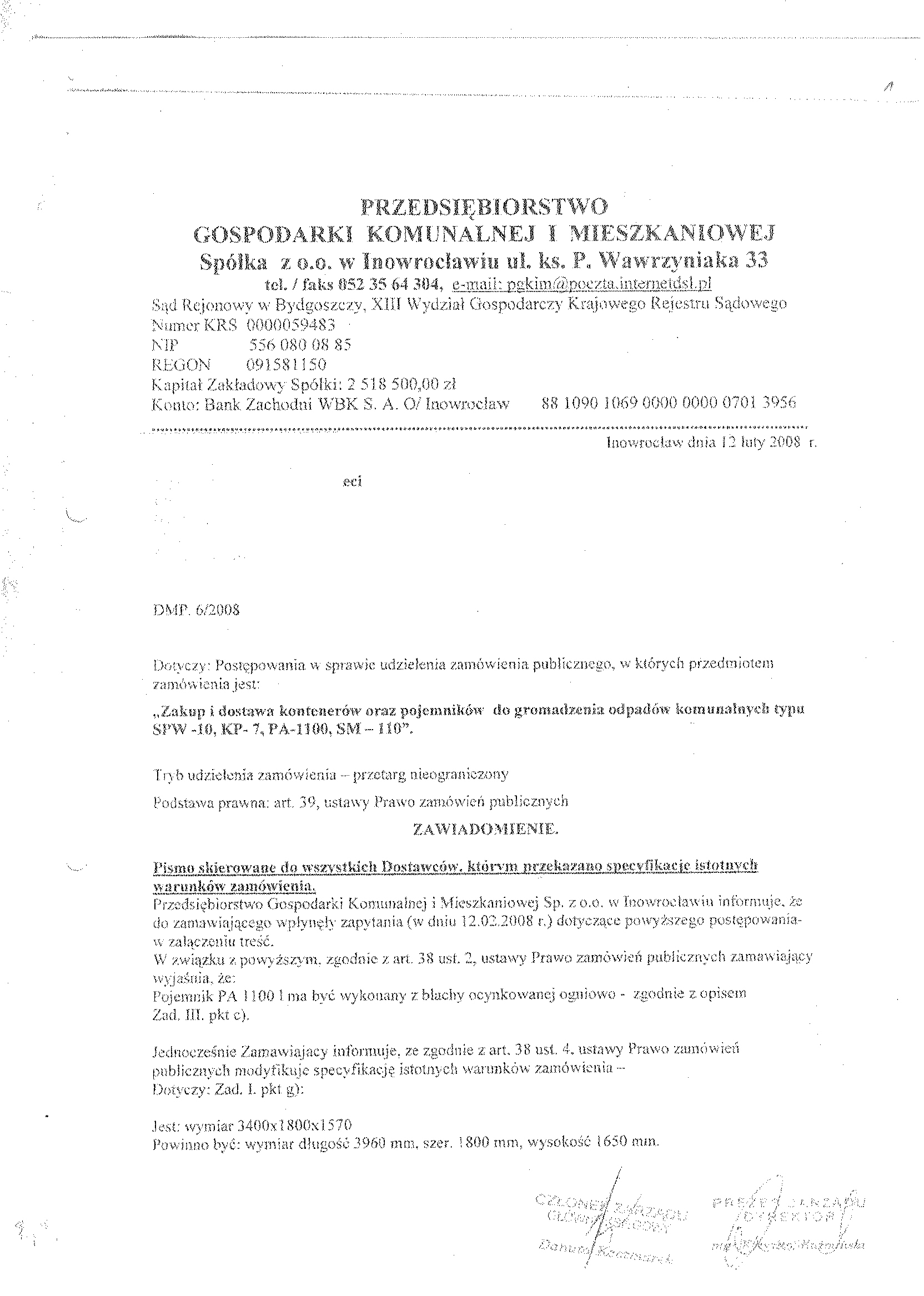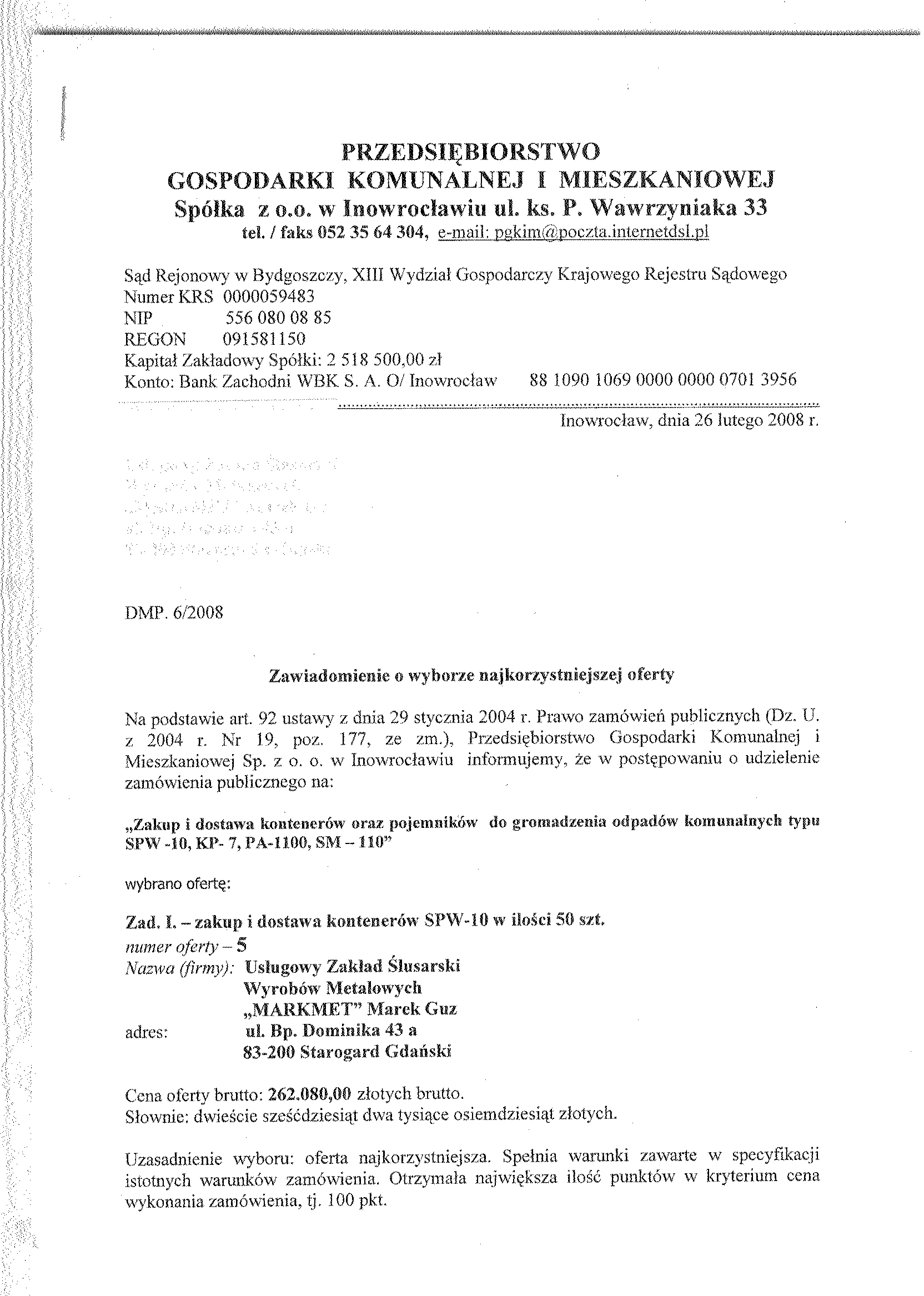 1. Nazwa i adres Zamawiaj膮cego: Przedsi臋biorstwo Gospodarki Komunalnej i Mieszkaniowej Sp. z o.o. w Inowroc艂awiu 聽