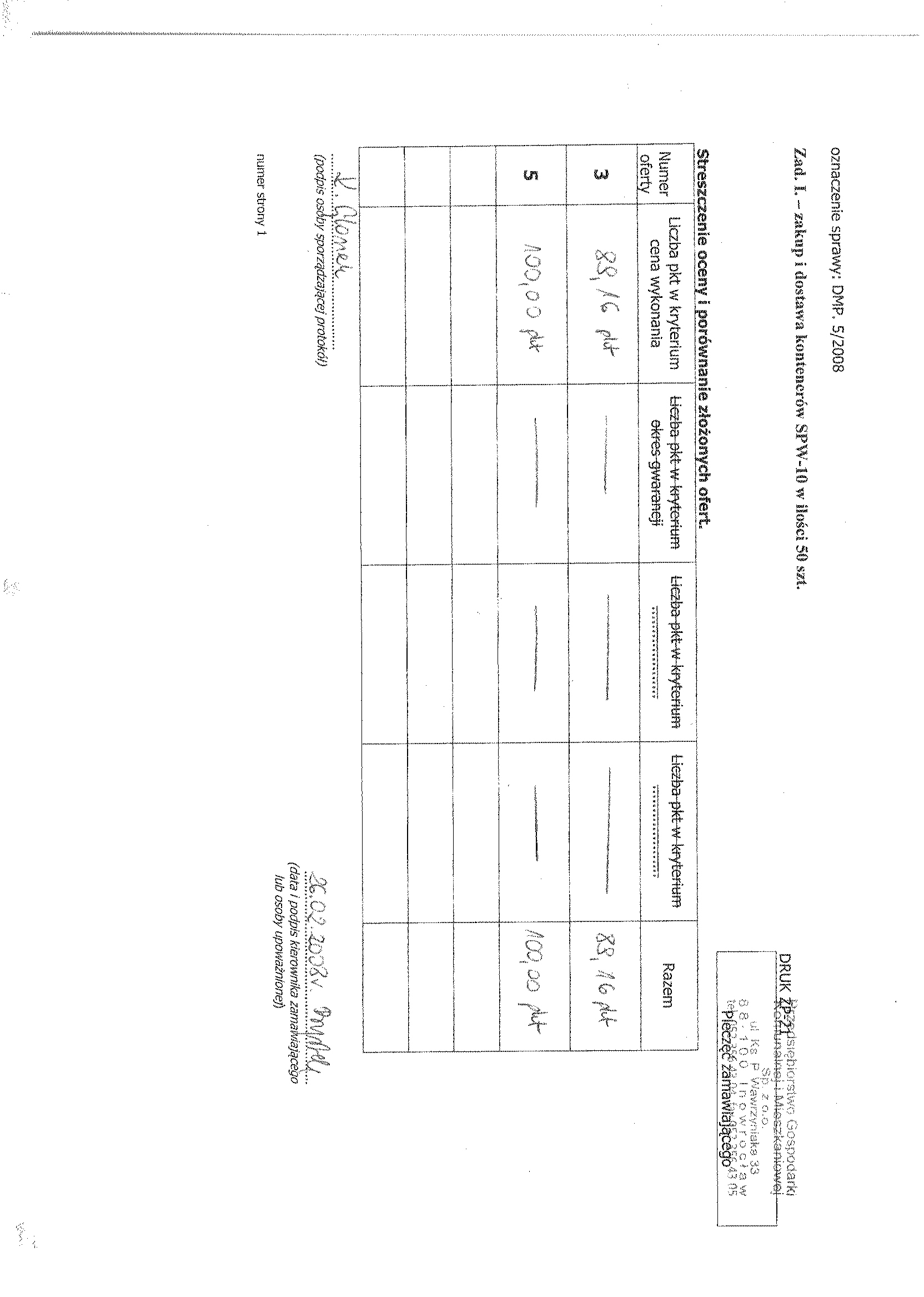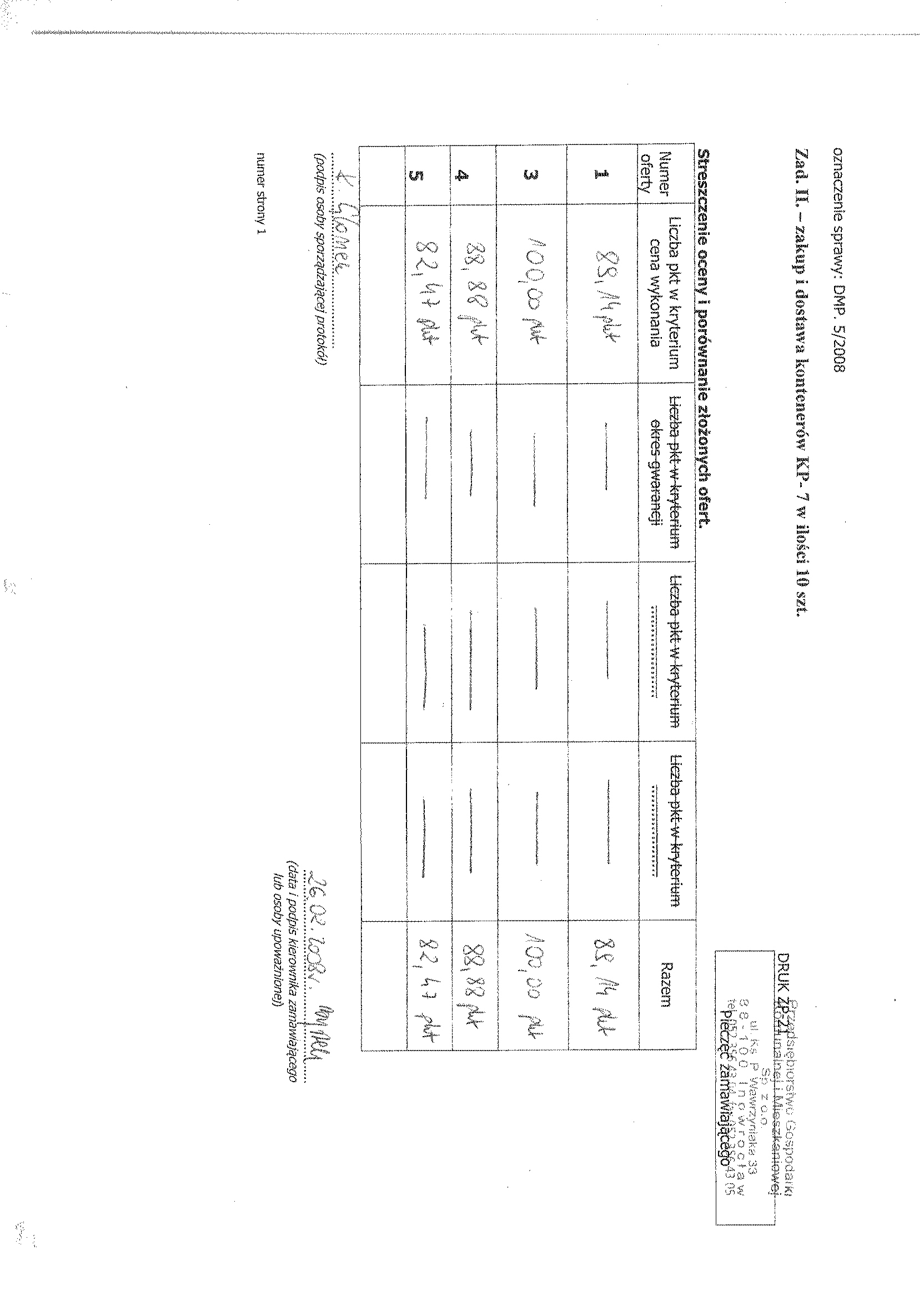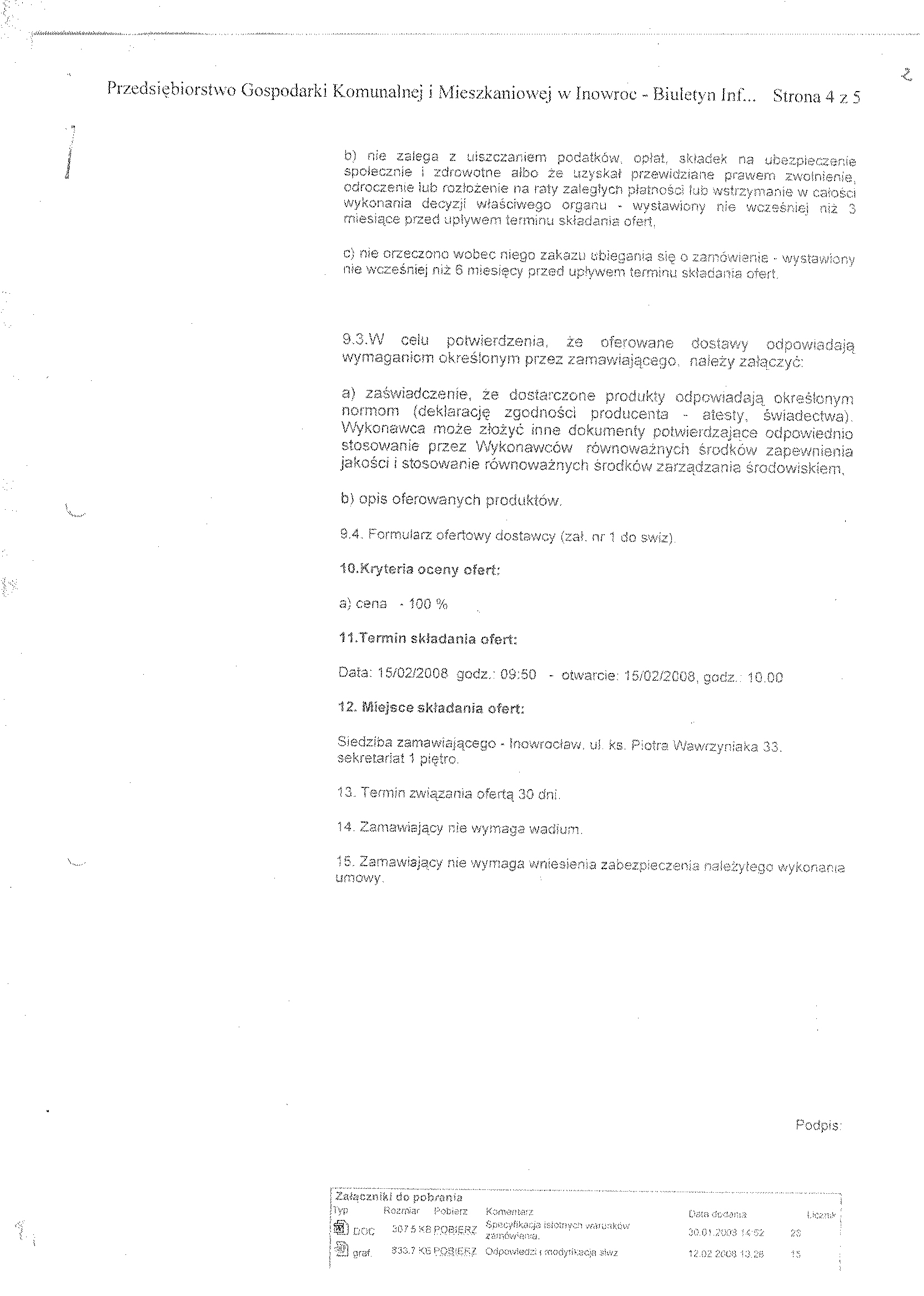 9.3.W celu potwierdzenia, 偶e oferowane dostawy odpowiadaj膮 wymaganiom okre艣lonym przez zamawiaj膮cego,聽 nale偶y za艂膮czy膰: a) za艣wiadczenie, 偶e dostarczone produkty odpowiadaj膮 okre艣lonym normom (deklaracj臋 zgodno艣ci producenta - atesty, 艣wiadectwa). Wykonawca mo偶e z艂o偶y膰 inne dokumenty potwierdzaj膮ce odpowiednio stosowanie przez Wykonawc贸w聽 r贸wnowa偶nych 艣rodk贸w zapewnienia jako艣ci i stosowanie r贸wnowa偶nych 艣rodk贸w zarz膮dzania 艣rodowiskiem, b) opis oferowanych produkt贸w. 9.4. Formularz ofertowy dostawcy (za艂. nr 1 do swiz). 10.Kryteria oceny ofert: a) cena聽聽 - 100 %聽聽聽聽聽聽聽聽聽聽聽聽聽聽聽聽聽 聽聽聽聽聽聽聽聽聽聽聽聽聽聽聽聽聽聽聽聽聽聽聽聽聽聽 11.Termin sk艂adania ofert: Data: 15/02/2008聽 godz.: 09:50聽聽 -聽 otwarcie: 15/02/2008, godz.: 10.00 12. Miejsce sk艂adania ofert: Siedziba zamawiaj膮cego - Inowroc艂aw, ul. ks. Piotra Wawrzyniaka 33, sekretariat 1 pi臋tro. 13. Termin zwi膮zania ofert膮 30 dni. 14. Zamawiaj膮cy nie wymaga wadium. 15. Zamawiaj膮cy nie wymaga wniesienia zabezpieczenia nale偶ytego wykonania umowy. 聽