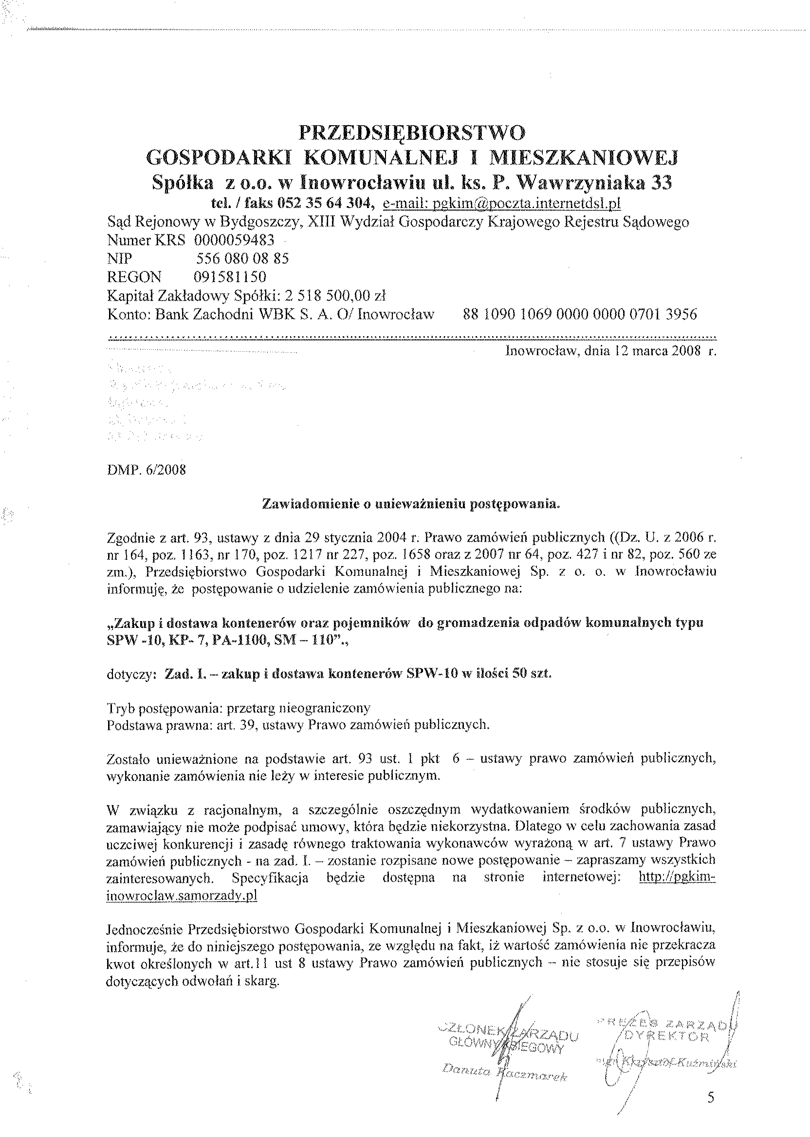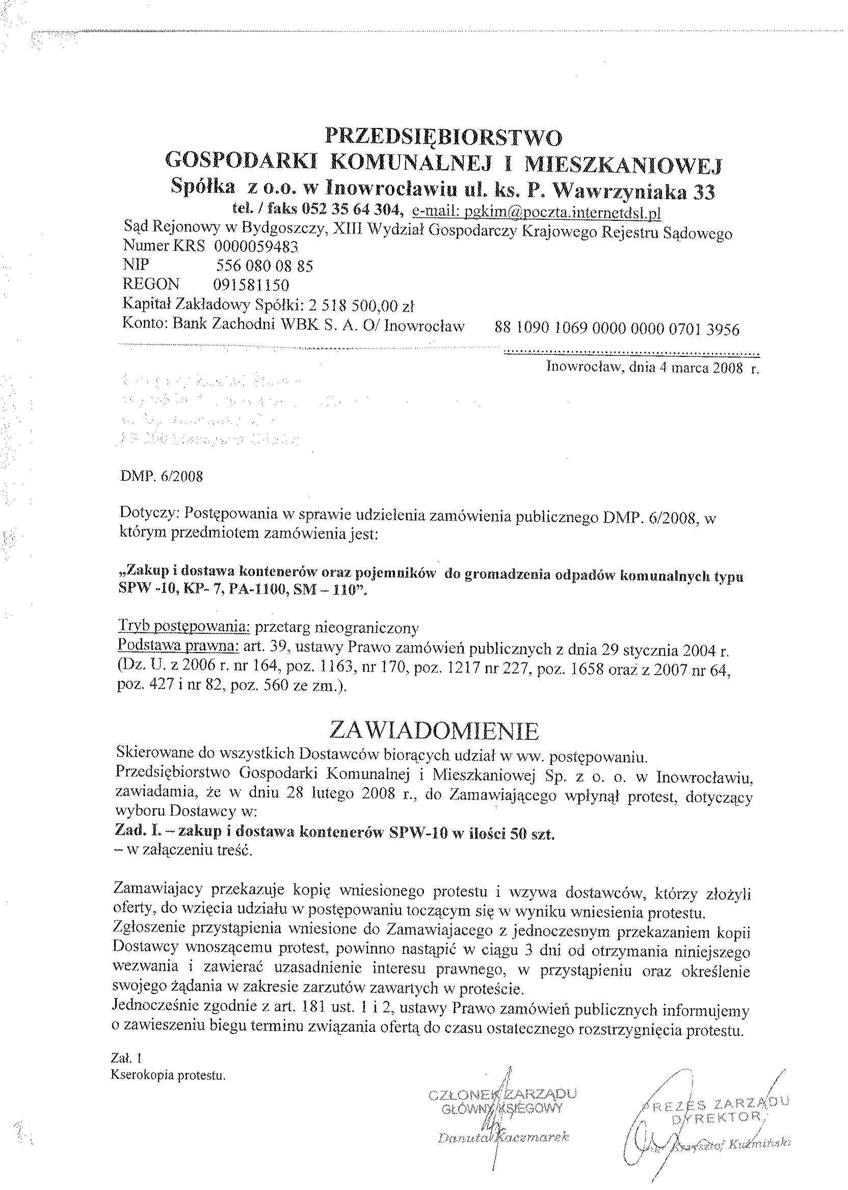 Numer sprawy: DMP. 6/2008聽聽聽聽聽聽聽聽聽聽聽聽聽聽聽聽聽聽聽聽聽聽聽聽聽聽聽聽聽聽聽 Inowroc艂aw, dnia 30 stycznia 2008 r.聽聽 聽