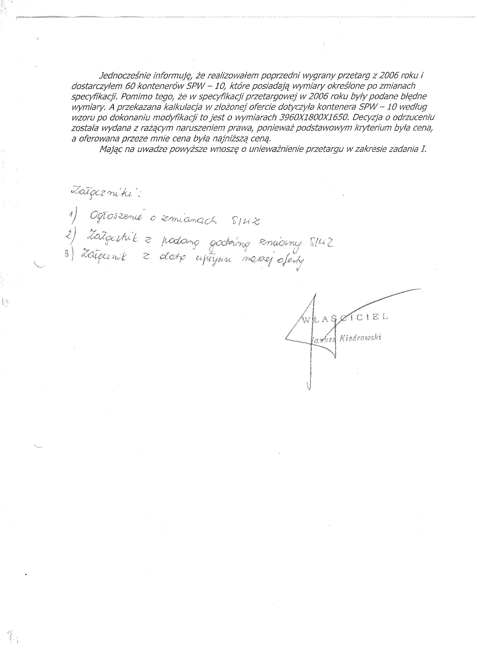 Op艂ata za otrzymanie specyfikacji istotnych warunk贸w zam贸wienia b臋dzie pokrywa膰 jedynie koszty jej druku oraz聽 przekazania. Wykonawca zainteresowany post臋powaniem powinien z艂o偶y膰 wniosek u zamawiaj膮cego z podaniem wszystkich danych firmy -聽 niezb臋dnych do przekazywania zmian i zapyta艅 dotycz膮cych powy偶szego post臋powania. 聽