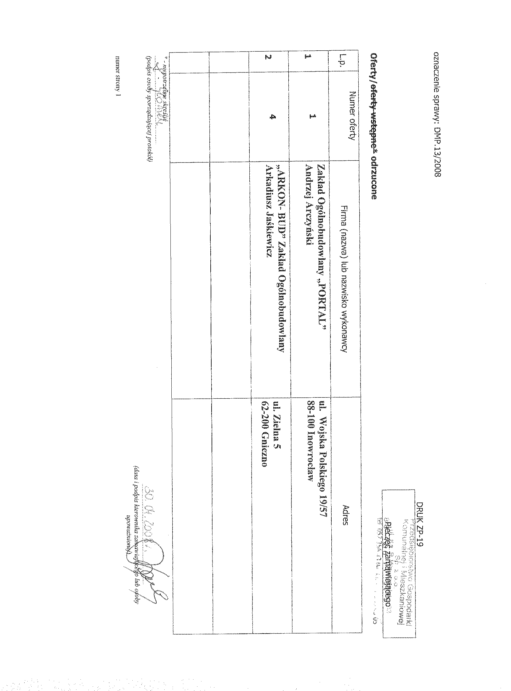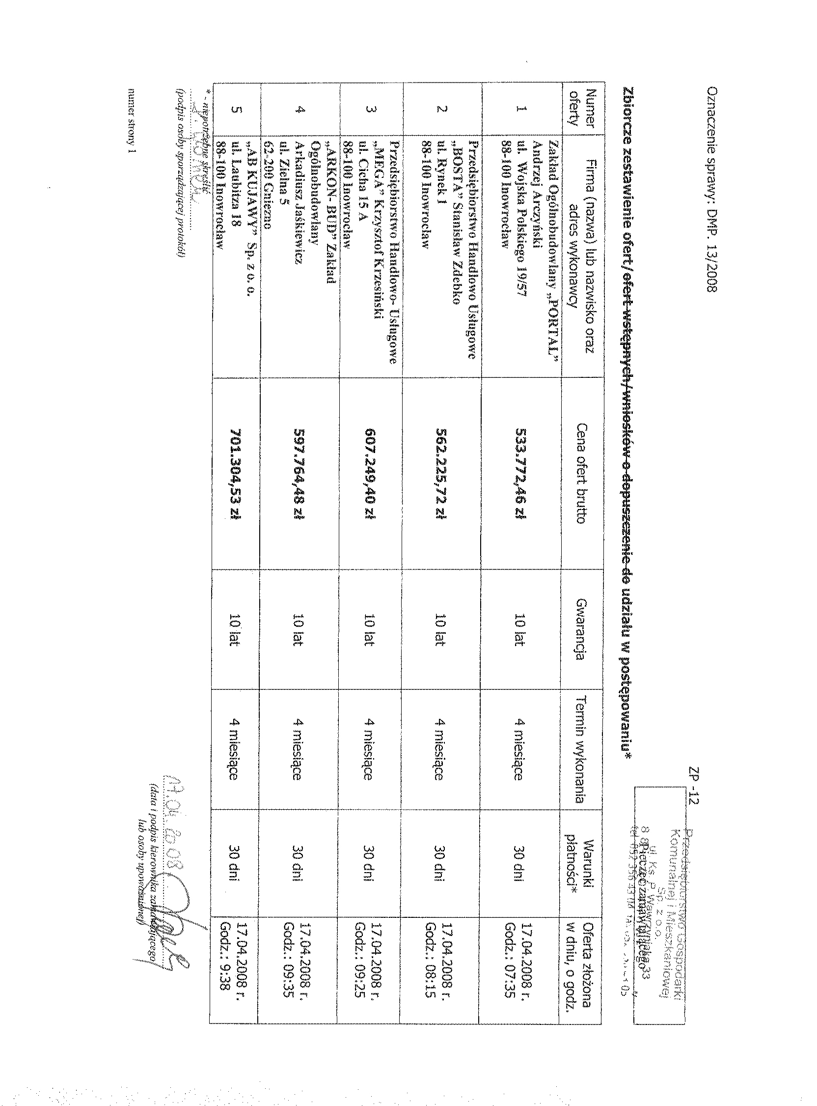 7. Miejsce i termin sk艂adania ofert: oferty nale偶y z艂o偶y膰 w sekretariacie Przedsi臋biorstwa Gospodarki Komunalnej i Mieszkaniowej Sp. z o.o., ul. ks. Piotra Wawrzyniaka 33, 88-100 Inowroc艂aw,聽 do dnia 9 kwietnia 2008 r. do godziny 9.50. 聽