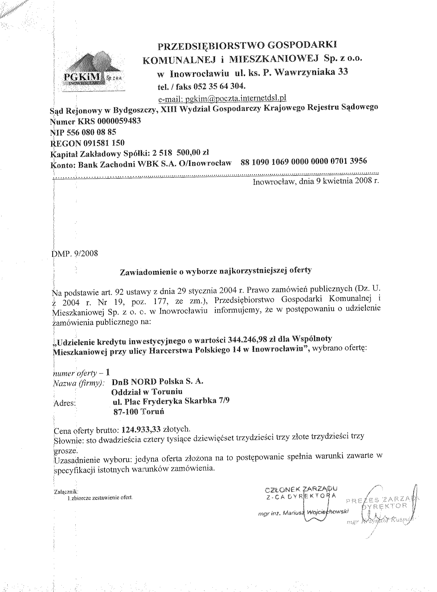 "Udzielenie kredytu inwestycyjnego o warto艣ci 344.246,98 z艂 dla Wsp贸lnoty Mieszkaniowej przy ulicy Harcerstwa Polskiego 14 w Inowroc艂awiu". 聽