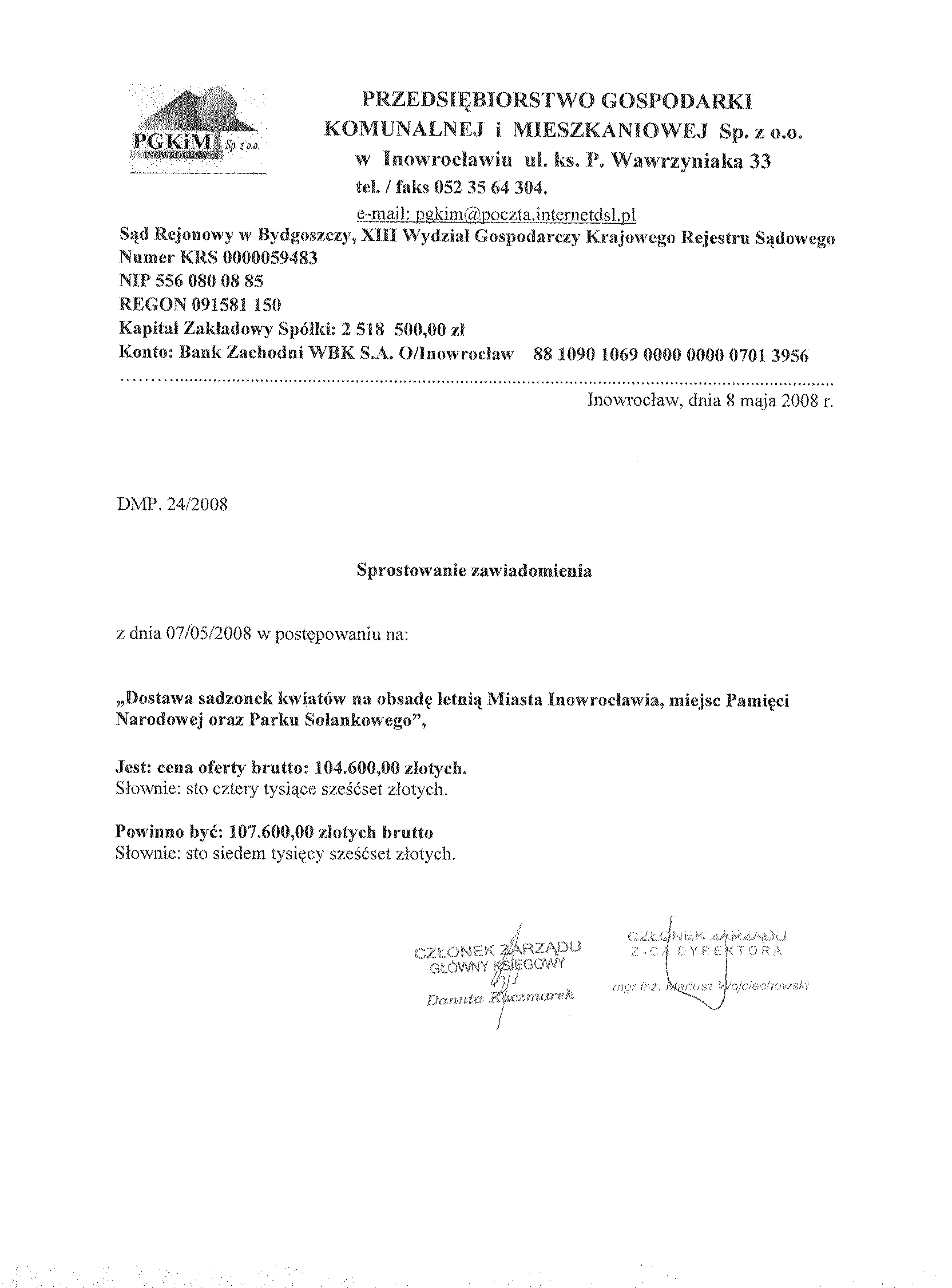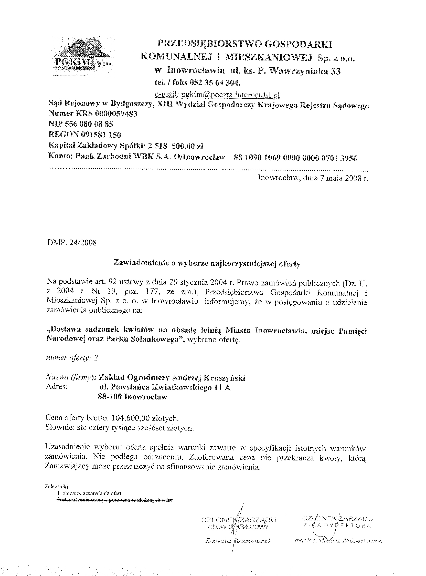9. Osobami uprawnionymi do kontakt贸w z dostawcami s膮: 聽聽聽聽聽 a) K. Glonek, tel. 052 35 64聽304, 聽聽聽聽聽 b) G. Kruk, tel. 052 357- 58-87. 10. Przewidywany termin realizacji zam贸wienia: 聽sukcesywnie od 15 maja 2008 r. 11. Adres strony internetowej, na kt贸rej dost臋pna jest specyfikacja istotnych warunk贸w zam贸wienia: http://pgkim-inowroclaw.samorzady.pl 12. Op艂ata za otrzymanie specyfikacji istotnych warunk贸w zam贸wienia b臋dzie pokrywa膰 jedynie koszty jej druku oraz聽 przekazania. 13. Dostawca zainteresowany post臋powaniem powinien z艂o偶y膰 wniosek u zamawiaj膮cego z podaniem wszystkich danych firmy -聽 niezb臋dnych do przekazywania zmian i zapyta艅 dotycz膮cych powy偶szego post臋powania. 14. O udzielenie zam贸wienia mog膮 ubiega膰 si臋 Dostawcy, kt贸rzy: 1) posiadaj膮 uprawnienia do wykonywania okre艣lonej dzia艂alno艣ci lub czynno艣ci, je偶eli ustawy nak艂adaj膮 obowi膮zek posiadania takich uprawnie艅, 2) posiadaj膮 niezb臋dn膮 wiedz臋 i do艣wiadczenie oraz potencja艂 techniczny, a tak偶e dysponuj膮 osobami zdolnymi do wykonania zam贸wienia, 3) nie podlegaj膮 wykluczeniu z post臋powania o udzielenie zam贸wienia. 聽
