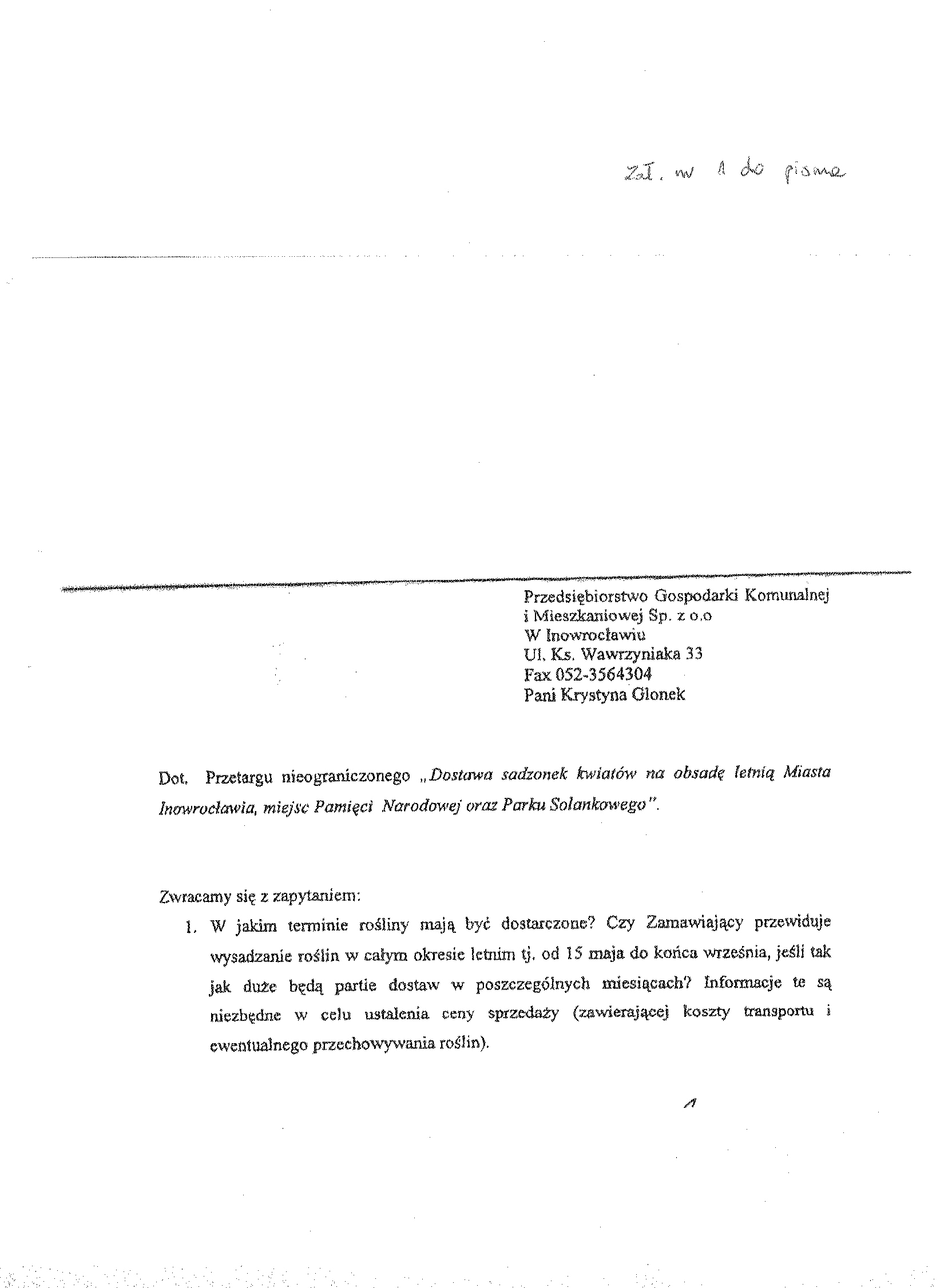 4.1. Dostawy odbywa膰 si臋 b臋d膮 sukcesywnie w przewidywanym terminie od 15.05.2008 r., w uzgodnieniu telefonicznym z Zak艂adem Zieleni PGKiM Sp. z o.o. w Inowroc艂awiu. 5. Opis warunk贸w wymaganych od dostawc贸w: 聽聽聽聽 a) dostawca dostarczy kwiaty, w艂asnym transportem,聽 na w艂asne ryzyko oraz na w艂asny聽 koszt, we wskazane miejsce miasta Inowroc艂awia, 聽聽聽聽 b) wyst臋puje na rynku handlu co najmniej 3 lata, 聽聽聽聽 c) dostarczy kwiaty zgodne z wymaganiami zamawiaj膮cego, 聽聽聽聽 d) terminy dostaw b臋d膮 uzgadniane telefonicznie. 聽