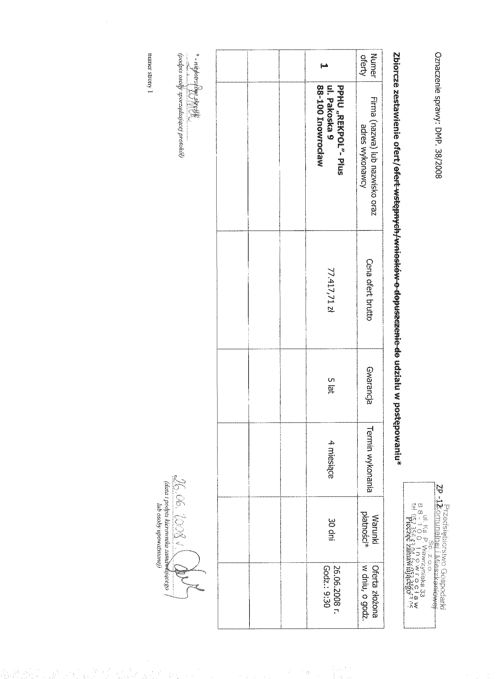 聽 5. Kryteria oceny ofert 聽聽聽 聽a)聽 cena wykonania zam贸wienia聽- 80 聽聽聽聽 b) gwarancja聽聽- 20 聽 6. Miejsce i termin sk艂adania ofert: oferty nale偶y z艂o偶y膰 w sekretariacie Przedsi臋biorstwa Gospodarki Komunalnej i Mieszkaniowej Sp. z o.o., ul. ks. Piotra Wawrzyniaka 33, 88-100 Inowroc艂aw,聽 do dnia 26 czerwca 2008 r. do godziny 10:50. 聽 7. Miejsce i termin otwarcia ofert: Przedsi臋biorstwo Gospodarki Komunalnej i Mieszkaniowej Sp. z o.o., ul. ks. Piotra Wawrzyniaka 33, 88-100 Inowroc艂aw, do dnia 26 czerwca 2008 r. o godzinie 11:00 8.Termin zwi膮zania ofert膮: 30 dni . 9. Zabezpieczenie nale偶ytego wykonania umowy (znwu) w wysoko艣ci 2 % od ustalonej warto艣ci zam贸wienia. 聽 聽 聽 聽 Podpis: 聽聽聽聽聽聽 |