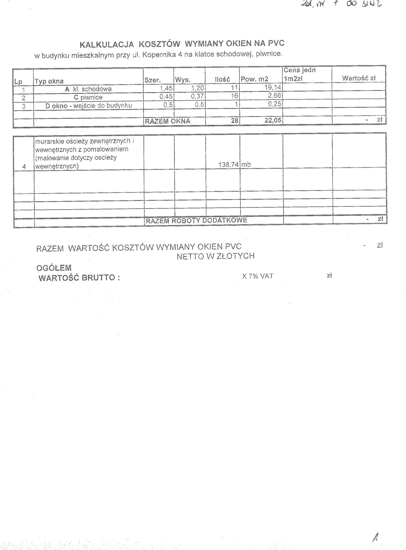 14. W celu potwierdzenia, 偶e Wykonawca posiada uprawnienie do wykonywania okre艣lonej dzia艂alno艣ci lub czynno艣ci oraz nie podlega wykluczeniu na podstawie art. 24 ustawy z dnia 29 stycznia 2004 r. - Prawo zam贸wie艅 publicznych, zamawiaj膮cy 偶膮da, nast臋puj膮cych dokument贸w: a) aktualnego odpisu z w艂a艣ciwego rejestru albo aktualnego za艣wiadczenia o wpisie do ewidencji dzia艂alno艣ci gospodarczej, je偶eli odr臋bne przepisy wymagaj膮 wpisu do rejestru lub zg艂oszenia do ewidencji dzia艂alno艣ci gospodarczej, wystawionego nie wcze艣niej ni偶 6 miesi臋cy przed up艂ywem terminu sk艂adania ofert; b) o艣wiadczenie wykonawcy, 偶e nie posiada zaleg艂o艣ci podatkowej wobec Naczelnika Urz臋du Skarbowego, c) o艣wiadczenie wykonawcy, 偶e nie posiada zaleg艂o艣ci wobec Zak艂adu Ubezpiecze艅 Spo艂ecznych w op艂acaniu sk艂adek na ubezpieczenie spo艂eczne, zdrowotne oraz Fundusz Pracy. 14.1.W celu potwierdzenia posiadania przez wykonawc臋 niezb臋dnej wiedzy i do艣wiadczenia oraz os贸b zdolnych do wykonania zam贸wienia, zamawiaj膮cy 偶膮da nast臋puj膮cych dokument贸w: a) wykazu wykonanych rob贸t budowlanych w okresie ostatniego 1 roku, przed dniem wszcz臋cia post臋powania o udzielenie zam贸wienia, z podaniem ich warto艣ci oraz daty i miejsca wykonania oraz za艂膮czeniem dokument贸w potwierdzaj膮cych, 偶e roboty te zosta艂y wykonane nale偶ycie, z艂. nr 2 do siwz (minimum 1 referencja), b) zamawiaj膮cy 偶膮da za艂膮czenia kserokopii uprawnie艅 budowlanych w specjalno艣ciach obj臋tych przedmiotem zam贸wienia, w zakresie rob贸t budowlanych i instalacji elektrycznych, c) 艣wiadectwa kwalifikacyjnego "E"- eksp instalacji elektrycznej do 1 kV, d) aktualnego wpisu do w艂a艣ciwych Izb Zawodowych. 14.2. W celu potwierdzenia, 偶e wykonawca znajduje si臋 w sytuacji ekonomicznej i finansowej zapewniaj膮cej wykonanie zam贸wienia zamawiaj膮cy 偶膮da nast臋puj膮cych dokument贸w: a) polisy, a w przypadku jej braku innego dokumentu potwierdzaj膮cego, 偶e wykonawca jest ubezpieczony od odpowiedzialno艣ci cywilnej w zakresie prowadzonej dzia艂alno艣ci. 14.3.Wype艂nione nast臋puj膮ce za艂膮czniki: a) formularz ofertowy wykonawcy (za艂. nr 1 do swiz). b) wykaz podobnych rob贸t (za艂. nr 2 do siwz), c) o艣wiadczenie w trybie art.22 ust.1 pkt.1-4 ustawy聽 Pzp (za艂. nr 3 do siwz). 14.4.Kosztorys ofertowy, kt贸ry musi by膰 integraln膮 cz臋艣ci膮 z艂o偶onej oferty. Podstaw膮 do opracowania przez Wykonawc臋 kosztorysu ofertowego jest przedmiar rob贸t, b臋d膮cy za艂膮cznikiem do siwz. Wykonawca mo偶e przyj膮膰 dowoln膮 form臋 i podstaw臋 wyceny rob贸t. Do oferty nale偶y doliczy膰 kalkulacj臋 wymiany okien i do艂膮czy膰 j膮 do oferty. 15. Miejsce i termin sk艂adania ofert: oferty nale偶y z艂o偶y膰 w sekretariacie Przedsi臋biorstwa Gospodarki Komunalnej i Mieszkaniowej Sp. z o.o., ul. ks. Piotra Wawrzyniaka 33, 88-100 Inowroc艂aw, do dnia 8 pa藕dziernika 2008 r. godzina 9:50 聽