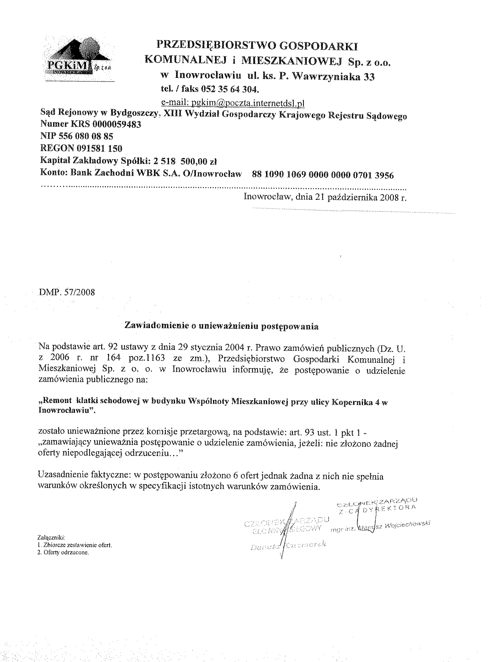 1. Zamawiaj膮cy: Wsp贸lnota Mieszkaniowa przy ulicy Kopernika 4 w Inowroc艂awiu, w imieniu i na rzecz 聽kt贸rej dzia艂a na mocy umowy o administrowanie, Przedsi臋biorstwo Gospodarki Komunalnej i Mieszkaniowej Sp. z o.o. w Inowroc艂awiu 聽 Ulica: ks. Piotra Wawrzyniaka 33 Kod: 88-100, Miejscowo艣膰: Inowroc艂aw Telefon / faks 052 35 64聽304 e-mail: pgkim@poczta.internetdsl.pl聽 http://pgkim-inowroclaw.samorzady.pl 聽