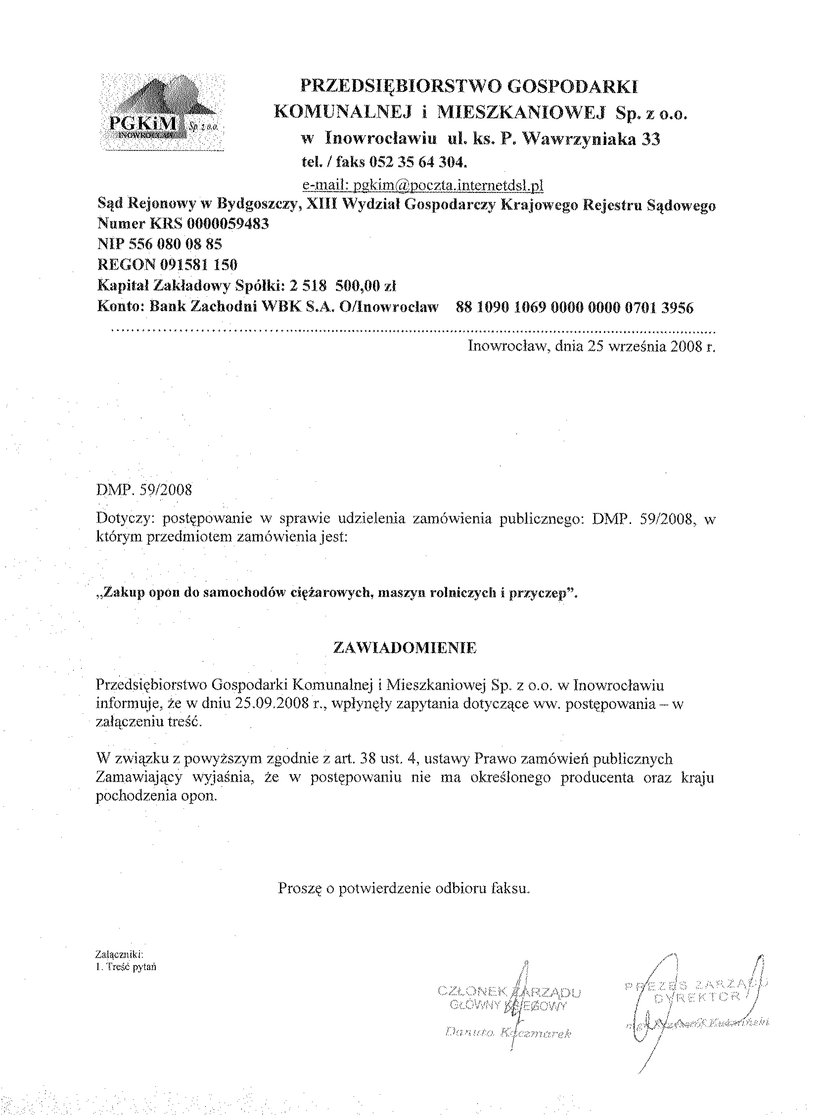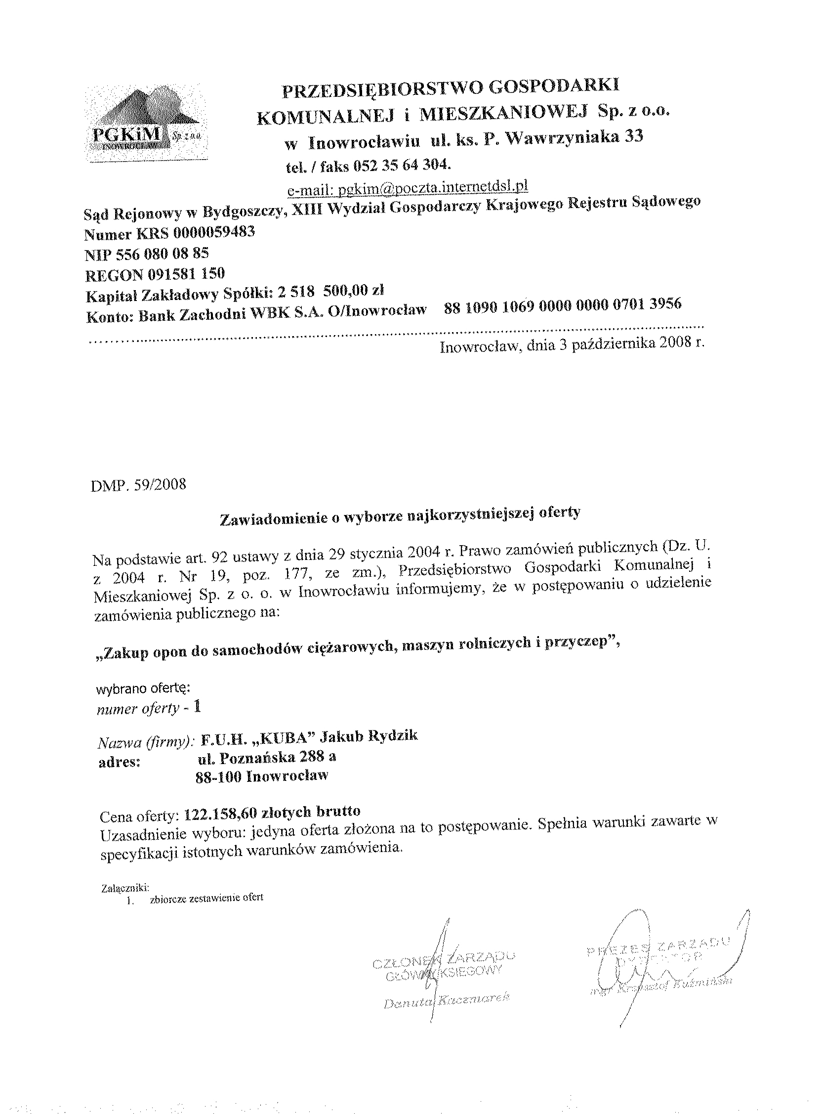 1.聽聽聽聽聽聽 Zamawiaj膮cy: Przedsi臋biorstwo Gospodarki Komunalnej i Mieszkaniowej Sp. z o.o. w Inowroc艂awiu Ulica: ks. Piotra Wawrzyniaka 33 Kod: 88-100, Miejscowo艣膰: Inowroc艂aw Telefon / faks 052 35 64聽304 e-mail: pgkim@poczta.internetdsl.pl聽 S膮d Rejonowy w Bydgoszczy, XIII Wydzia艂 Gospodarczy Krajowego Rejestru S膮dowego Numer KRS 0000059483 REGON: 091581150 NIP: 556-080-08-85 Kapita艂 zak艂adowy Sp贸艂ki: 2聽518聽500, 00 z艂 Konto: Bank Zachodni WBK S. A.O/ Inowroc艂aw聽聽聽聽聽 88 1090 1069 0000 0000 0701 3956 聽