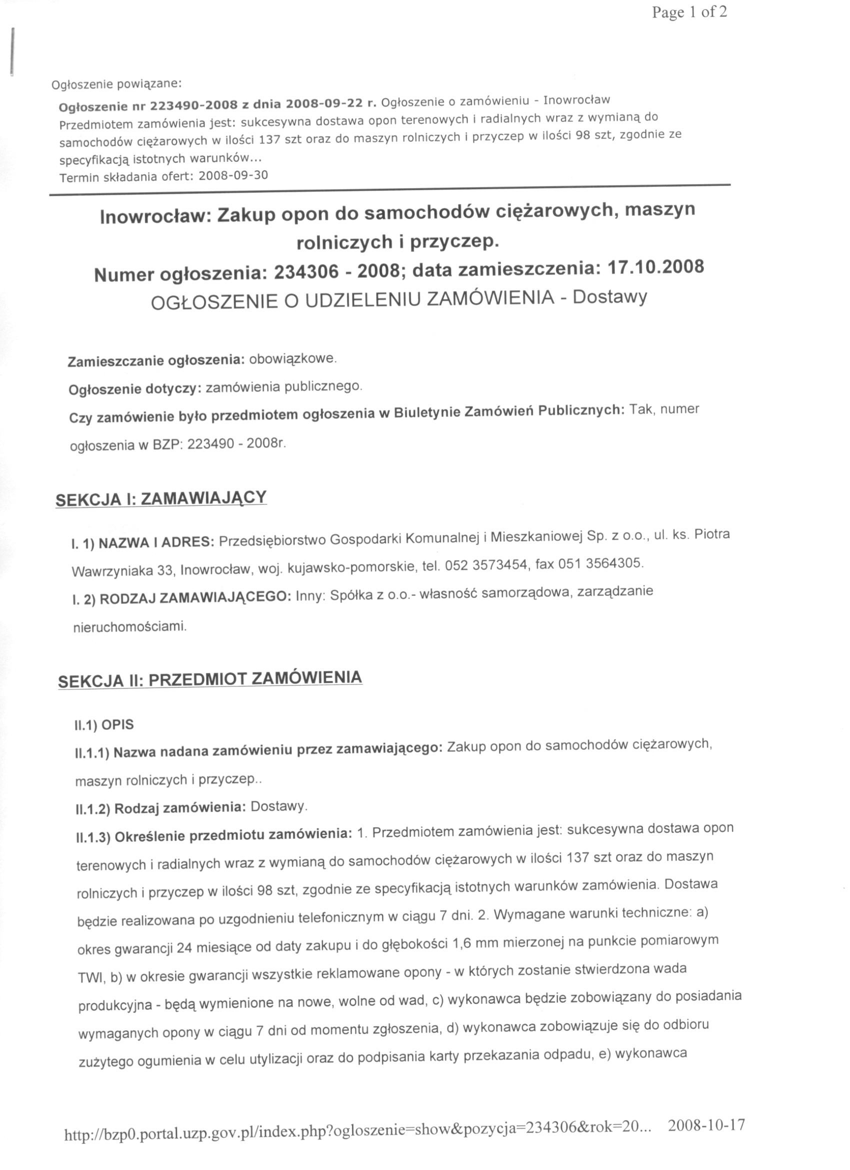 Numer og艂oszenia w BZP: 223490 - 2008; data zamieszczenia 22/09//2008 Na stronie internetowej: 22/09/2008 聽