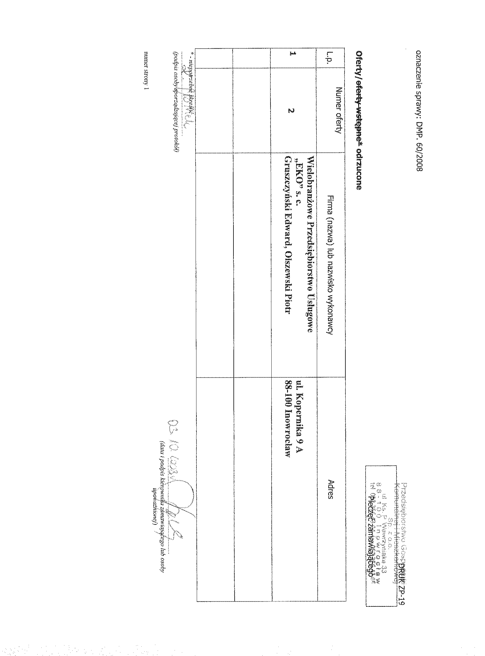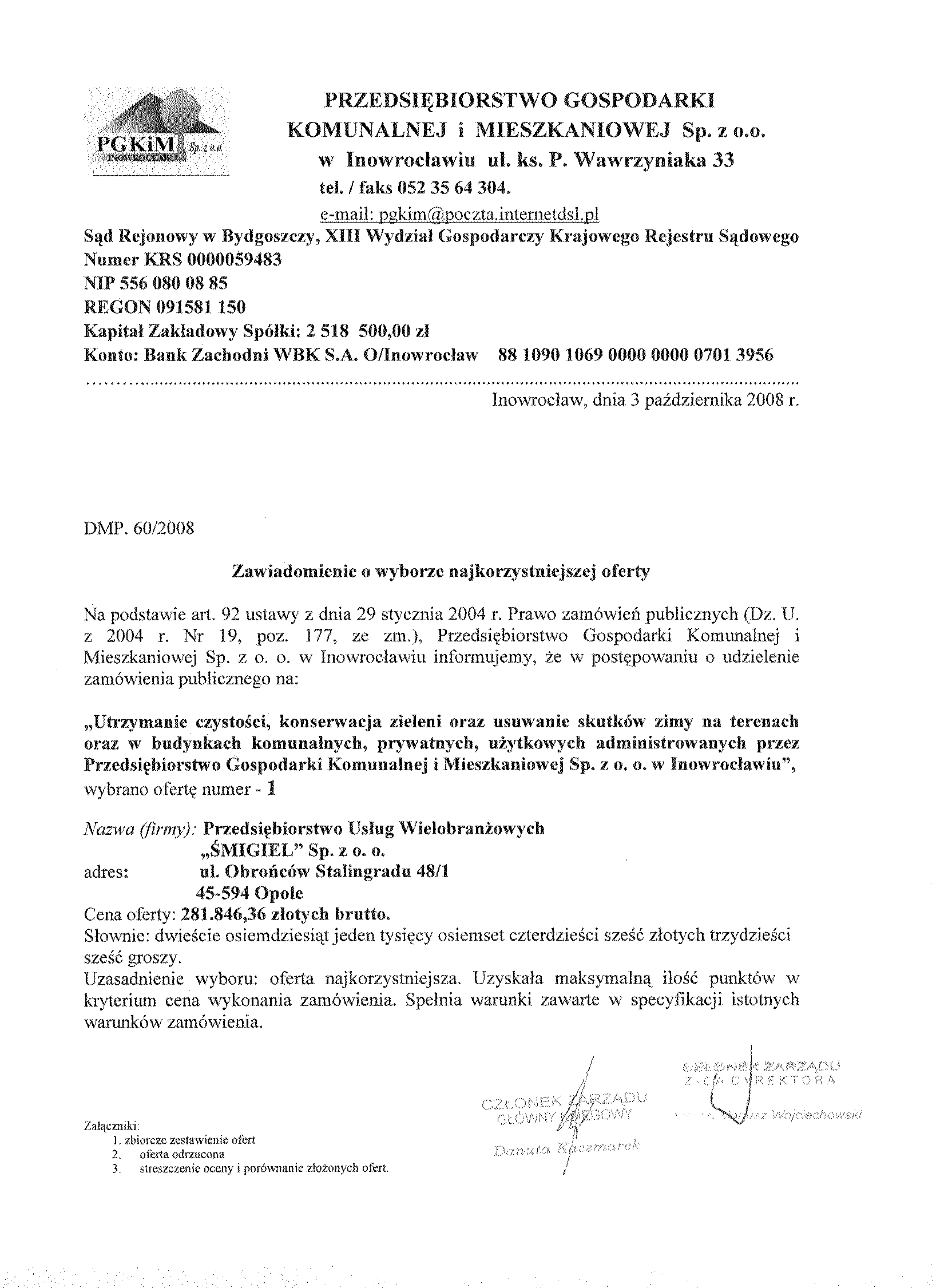 Numer sprawy: DMP. 60/2008聽聽聽聽聽聽聽聽聽聽聽聽聽聽聽聽聽聽聽聽聽聽聽聽聽聽聽聽聽聽聽聽 聽Inowroc艂aw, dnia 23 wrze艣nia 2008 r.聽聽 聽OG艁OSZENIE聽 O聽 WSZCZ臉CIU聽 POST臉POWANIA 聽 Numer og艂oszenia w BZP: 223976 - 2008, z dnia 23/09/2008 聽 Na stronie internetowej: 23/09/2008 Zamieszczenie obowi膮zkowe Zam贸wienia publiczne 1. Zamawiaj膮cy: Przedsi臋biorstwo Gospodarki Komunalnej i Mieszkaniowej Sp. z o.o. w Inowroc艂awiu, 聽 S膮d Rejonowy w Bydgoszczy, XIII Wydzia艂 Gospodarczy Krajowego Rejestru S膮dowego Numer KRS 0000059483 REGON: 091581150 NIP: 556-080-08-85 Kapita艂 Zak艂adowy Sp贸艂ki: 2聽518聽500, 00 z艂 Konto: Bank Zachodni WBK S. A.O/ Inowroc艂aw聽聽聽聽聽 88 1090 1069 0000 0000 0701 3956 Adres pocztowy: Ulica: ks. Piotra Wawrzyniaka 33 Kod: 88-100, Miejscowo艣膰: Inowroc艂aw Telefon / faks 052 35 64聽304 Adres strony internetowej: http://pgkim-inowroclaw.samorzady.pl e-mail: pgkim@poczta.internetdsl.pl聽 Rodzaj zamawiaj膮cego: Sp贸艂ka z o. o. - w艂asno艣膰 samorz膮dowa, zarz膮dzanie nieruchomo艣ciami 1.1. Osobami uprawnionymi do kontakt贸w z wykonawcami s膮: a) w cz臋艣ci formalnej zam贸wienia -聽 Krystyna Glonek, tel.052 35 64 304, b) w cz臋艣ci merytorycznej zam贸wienia - Zdzis艂awa Molenda, tel. 052聽357 42 78. 1.2. Op艂ata za otrzymanie specyfikacji istotnych warunk贸w zam贸wienia b臋dzie pokrywa膰 jedynie koszty jej druku oraz przekazania. 1.3. Wykonawca zainteresowany post臋powaniem powinien z艂o偶y膰 wniosek u zamawiaj膮cego z podaniem wszystkich danych firmy - niezb臋dnych do przekazywania zmian i zapyta艅 dotycz膮cych powy偶szego post臋powania. 2. Nazwa nadana zam贸wieniu: "Utrzymanie czysto艣ci, konserwacja zieleni oraz usuwanie skutk贸w zimy na terenach oraz w budynkach komunalnych, prywatnych, u偶ytkowych administrowanych przez Przedsi臋biorstwo Gospodarki Komunalnej i Mieszkaniowej Sp. z o. o. w Inowroc艂awiu". Rodzaj zam贸wienia: us艂uga 2.1. Przedmiotem zam贸wienia jest: sprz膮tanie powierzchni wewn臋trznych budynk贸w: tj. klatek schodowych, piwnic, strych贸w - z pomieszcze艅 i urz膮dze艅 budynk贸w wielolokalowych przeznaczonych do wsp贸lnego u偶ytku. Sprz膮tanie powierzchni zewn臋trznych: tj. chodnik贸w, wjazd贸w, podw贸rek, piel臋gnacja ziele艅c贸w na terenie nieruchomo艣ci, sprz膮tanie podjazd贸w dla os贸b niepe艂nosprawnych, sprz膮tanie miejsc wok贸艂 urz膮dze艅 do zbierania odpad贸w lub os艂on 艣mietnikowych. Sprz膮tanie biur.聽Sprz膮tanie (wygrabienie) wiosenne teren贸w z li艣ci, a tak偶e w okresie jesiennym usuwanie na bie偶膮co opad艂ych li艣ci. Od艣nie偶anie w okresie zimowym: chodnik贸w wzd艂u偶 budynk贸w, wjazd贸w, dojazd贸w i doj艣膰 do 艣mietnik贸w, podjazd贸w dla os贸b niepe艂nosprawnych, na posesjach i nieruchomo艣ciach, usuwanie nawis贸w (sopli) z okap贸w, rynien i innych cz臋艣ci elewacji budynku.聽Powierzchnie obj臋te zam贸wieniem to ok. 150.000 m |