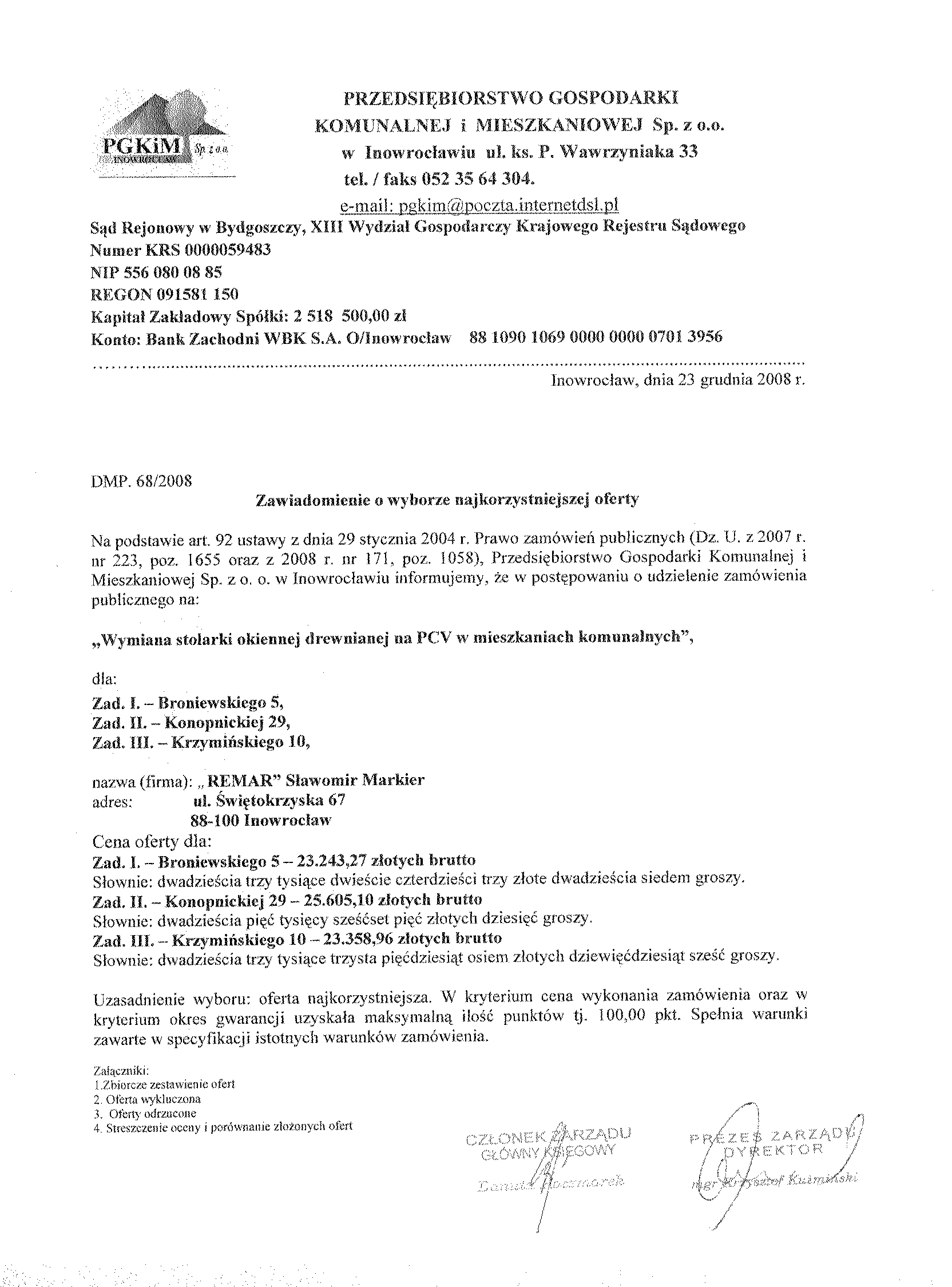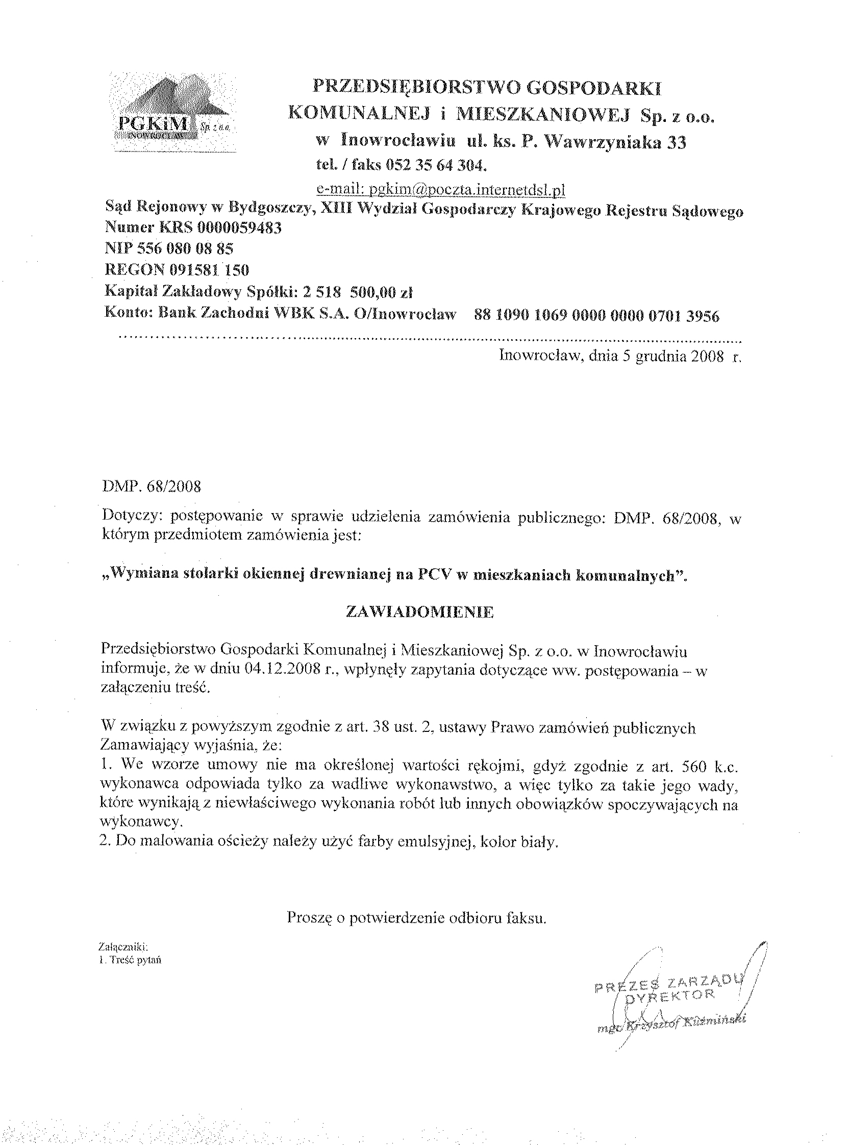 1. Zamawiaj膮cy: Przedsi臋biorstwo Gospodarki Komunalnej i Mieszkaniowej Sp. z o.o. w Inowroc艂awiu Ulica: ks. Piotra Wawrzyniaka 33 Kod: 88-100, Miejscowo艣膰: Inowroc艂aw Telefon / faks 052 35 64聽304 e-mail: pgkim@poczta.internetdsl.pl聽
