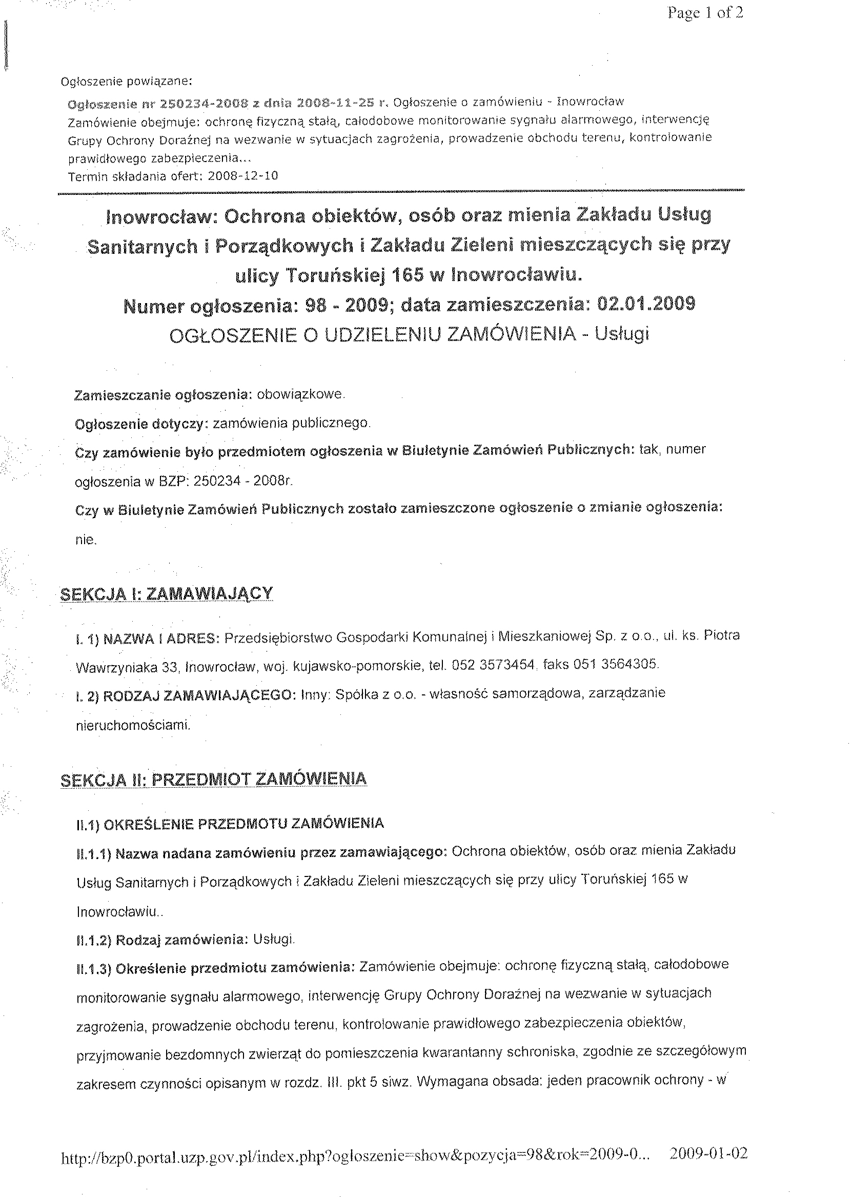 聽 Nazwa nadana zam贸wieniu: "Ochrona obiekt贸w, os贸b oraz mienia Zak艂adu Us艂ug Sanitarnych i Porz膮dkowych i Zak艂adu Zieleni mieszcz膮cych si臋 przy ulicy Toru艅skiej 165 w Inowroc艂awiu". 聽 Zam贸wienie obejmuje: ochron臋 fizyczn膮 sta艂膮, ca艂odobowe monitorowanie sygna艂u alarmowego, interwencj臋 Grupy Ochrony Dora藕nej na wezwanie w sytuacjach zagro偶enia, prowadzenie obchodu terenu, kontrolowanie prawid艂owego zabezpieczenia obiekt贸w, przyjmowanie bezdomnych zwierz膮t do pomieszczenia kwarantanny schroniska, zgodnie ze szczeg贸艂owym zakresem czynno艣ci opisanym w rozdz. III. pkt 5 siwz. Wymagana obsada: jeden pracownik ochrony - w godz. od 1430 - 630od poniedzia艂ku do pi膮tku. Ca艂odobowo w soboty, niedziele i 艣wi臋ta- od godz. 15.00 - 6:30 rano dnia nast臋pnego. We wszystkie dni tygodnia przyjmowanie bezdomnych zwierz膮t do pomieszczenia kwarantanny schroniska. Wymagany sprz臋t i wyposa偶enie pracownik贸w: umundurowanie zgodne z wymogami, identyfikator zgodny z wymogami ustawy o ochronie os贸b i mienia z dnia 22 sierpnia 1997 r. (Dz. U. z dnia 26 wrze艣nia 1997 r., ze zm.), 艣rodki przymusu bezpo艣redniego: kajdanki, pa艂ka, telefon kom贸rkowy, latarka elektryczna, indywidualny pakiet opatrunkowy. 聽 5. Nie dopuszcza si臋 sk艂adania ofert cz臋艣ciowych. 6. Nie dopuszcza si臋 sk艂adania ofert wariantowych. 7. Zamawiaj膮cy nie przewiduje zawarcia umowy ramowej, jak r贸wnie偶 nie dokona wyboru oferty najkorzystniejszej z zastosowaniem aukcji elektronicznej. 8. Zamawiaj膮cy nie przewiduje mo偶liwo艣ci ustanowienia dynamicznego systemu zakup贸w. 聽 9. Osobami uprawnionymi do kontakt贸w z wykonawcami s膮: a) w cz臋艣ci formalnej zam贸wienia - Krystyna Glonek, tel./ faks 052 35 64 304, b) w cz臋艣ci merytorycznej zam贸wienia - Marcin Kwiecie艅, tel. 052聽357 60 62. 聽 10. Termin (okres) realizacji zam贸wienia: 24 miesi膮ce.