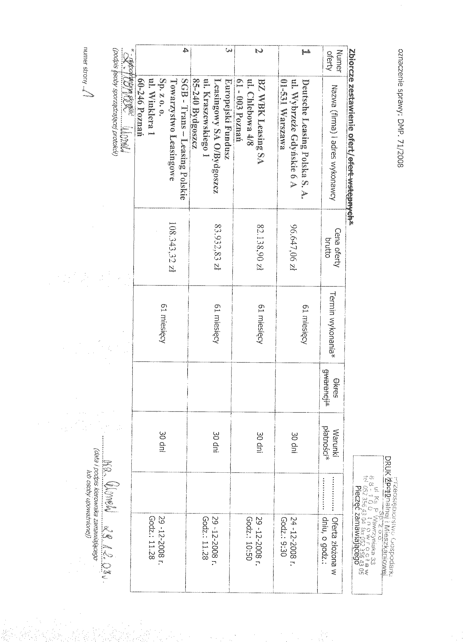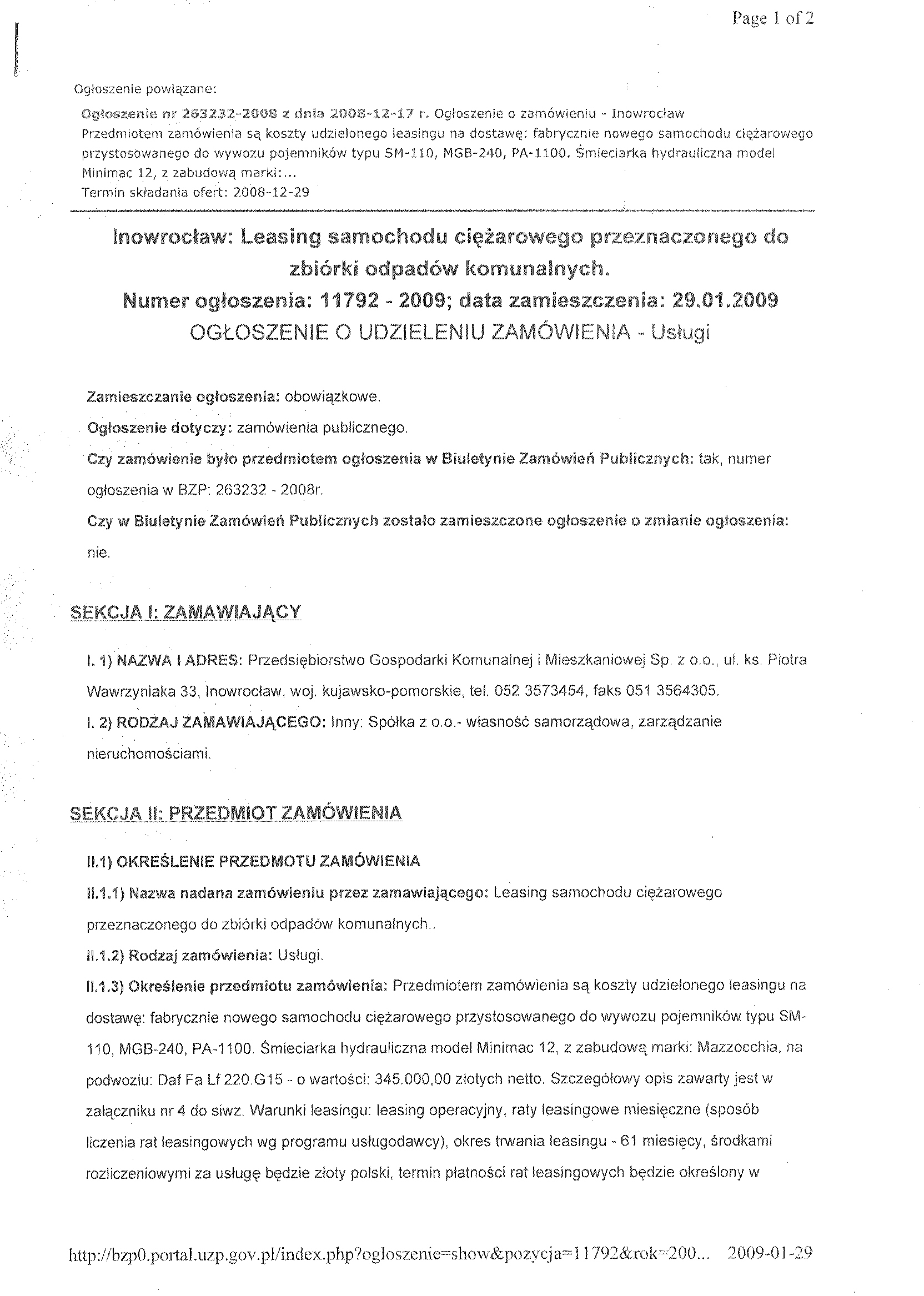 14. Kryteria oceny ofert: suma op艂at leasingowych - 100 % 15. Zamawiaj膮cy nie wymaga wadium. 16. Miejsce i termin otwarcia ofert: Przedsi臋biorstwo Gospodarki Komunalnej i Mieszkaniowej Sp. z o.o., ul. ks. Piotra Wawrzyniaka 33, 88-100 Inowroc艂aw dnia 29 grudnia 2008 r. o godz. 12.00 (salka konferencyjna).