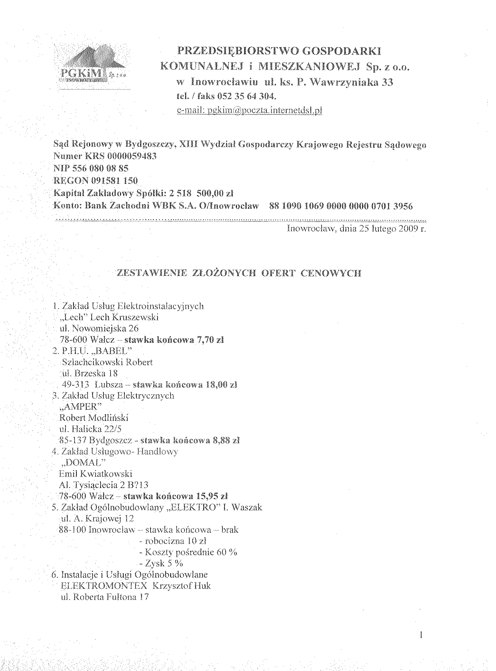 PRZEDSIĘBIORSTWO GOSPODARKI          KOMUNALNEJ i MIESZKANIOWEJ Sp. z o.o.                     w Inowrocławiu ul. ks. P. Wawrzyniaka 33                         tel. / faks 052 35 64 304                        e-mail: pgkim@poczta.internetdsl.pl