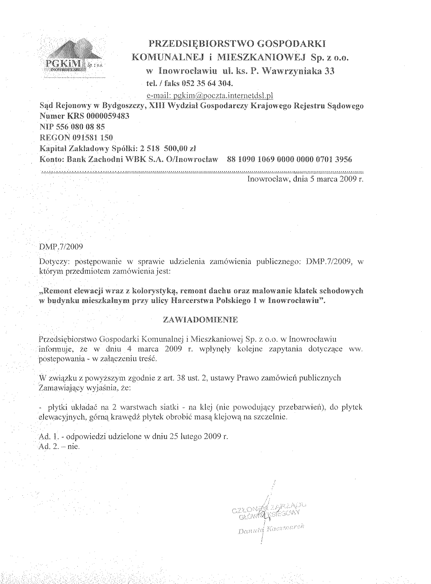 聽 Nazwa: Wsp贸lnota Mieszkaniowa przy ulicy Harcerstwa Polskiego 1 w Inowroc艂awiu w imieniu i na rzecz, kt贸rej dzia艂a na mocy powierzenia, Przedsi臋biorstwo Gospodarki Komunalnej i Mieszkaniowej Sp. z o.o. w Inowroc艂awiu