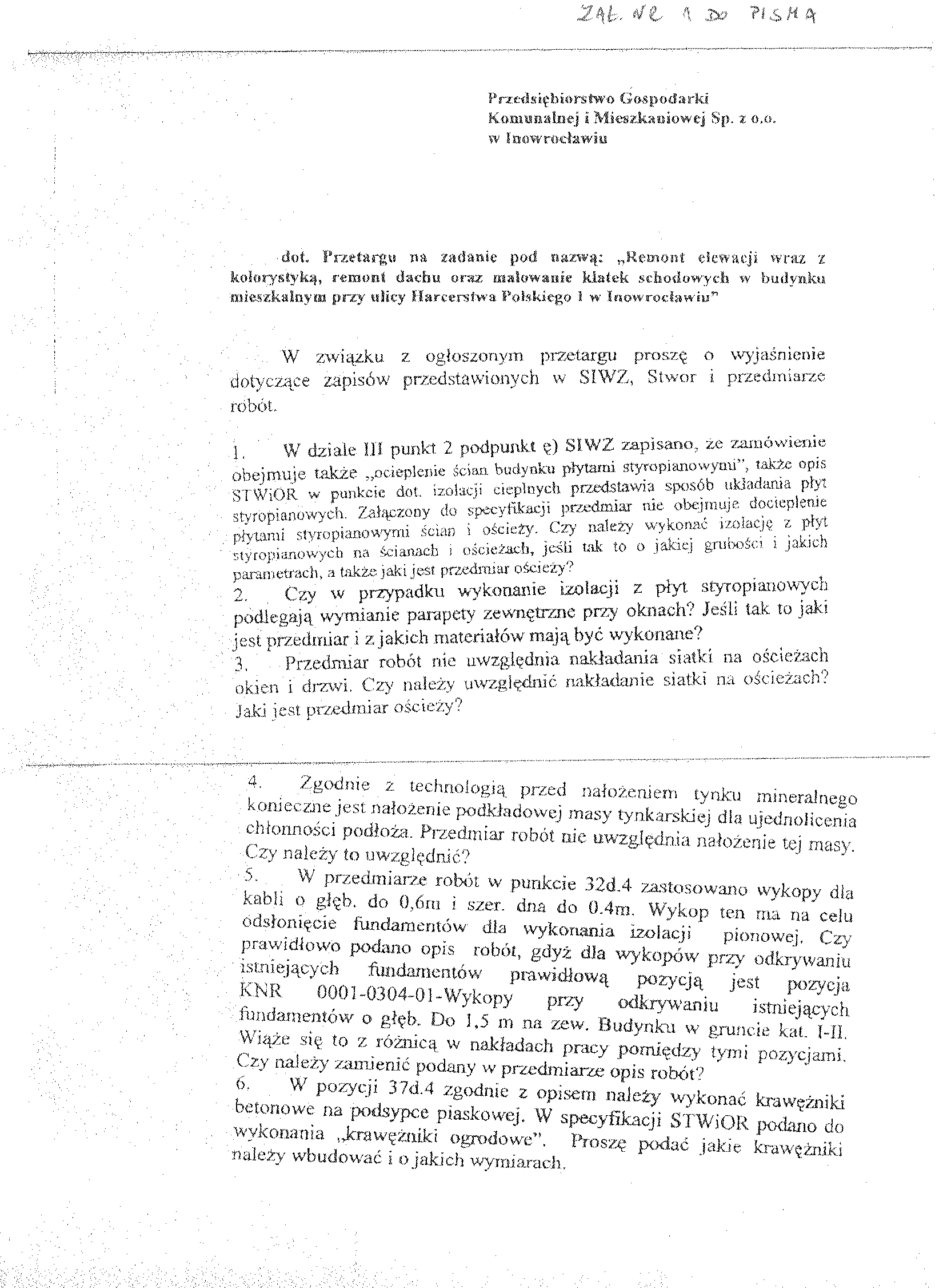 4. Okre艣lenie przedmiotu zam贸wienia Nazwa nadana zam贸wieniu: "Remont elewacji wraz z kolorystyk膮, remont dachu oraz malowanie klatek schodowych w budynku mieszkalnym przy ulicy Harcerstwa Polskiego 1 w Inowroc艂awiu". 聽 Zam贸wienie obejmuje: postawienie rusztowa艅, wywiezienie gruzu, wykonanie daszk贸w ochronnych nad przej艣ciami, odgrzybianie 艣cian, uzupe艂nienie tynk贸w, przyklejenie siatki, malowanie elewacji, ocieplenie 艣cian budynku p艂ytami styropianowymi, rozebranie rur spustowych, licowanie p艂ytkami klinkierowymi, ochron臋 naro偶nik贸w, rozbi贸rk臋 pokrycia dachu, wymian臋 艂acenia dachu, pokrycie dachu dach贸wk膮, wymian臋 w艂az贸w kominowych, wymian臋 pokrycia mur贸w ogniowych, wykonanie rynien dachowych, wykonanie izolacji cieplnej, przeciwd藕wi臋kowej i przeciwwilgociowej, mechaniczn膮 rozbi贸rk臋 nawierzchni bitumicznej, r臋czne rozebranie podbudowy betonowej, r臋czne kopanie row贸w, wykonanie podsypki piaskowej, wykonanie opaski betonowej, rozbi贸rk臋 czapek kominowych, przemurowanie komin贸w, wykonanie tynk贸w, uzupe艂nienie czapek kominowych i 艂aw kominiarskich, wykonanie pomost贸w na dachu, zeskrobanie i zmycie starej farby, malowanie farbami emulsyjnymi 艣cian klatek schodowych, wykucie z muru o艣cie偶nic, wstawienie okien w pralni i suszarni. 聽 5. Nie dopuszcza si臋 sk艂adania ofert cz臋艣ciowych. 6. Nie dopuszcza si臋 sk艂adania ofert wariantowych. 7. Zamawiaj膮cy nie przewiduje zawarcia umowy ramowej, jak r贸wnie偶 nie dokona wyboru oferty najkorzystniejszej z zastosowaniem aukcji elektronicznej. 8. Zamawiajacy nie przewiduje mo偶liwo艣ci ustanowienia dynamicznego systemu zakup贸w. 聽 9. Osobami uprawnionymi do kontakt贸w z wykonawcami s膮: a) w cz臋艣ci formalnej zam贸wienia - Krystyna Glonek, tel.052 35 - 64 - 304, b) w cz臋艣ci merytorycznej zam贸wienia - Anna Nawrocka, tel. 052 35 64聽325. 聽 10. Po偶膮dany termin realizacji zam贸wienia: 4 miesi膮ce od podpisania umowy. 聽