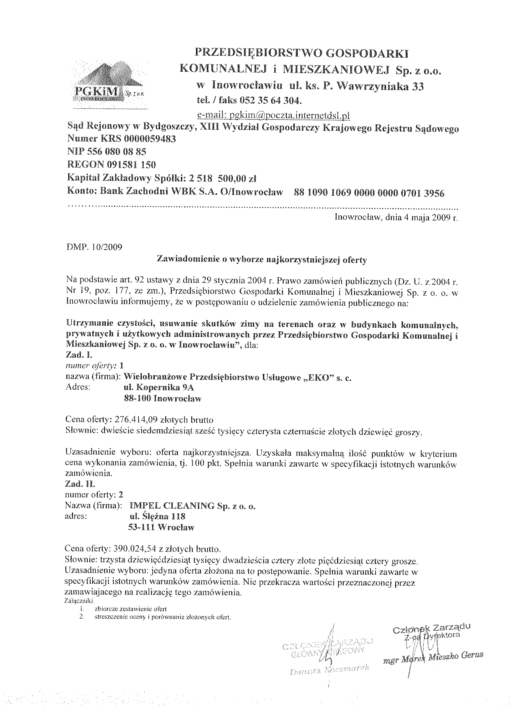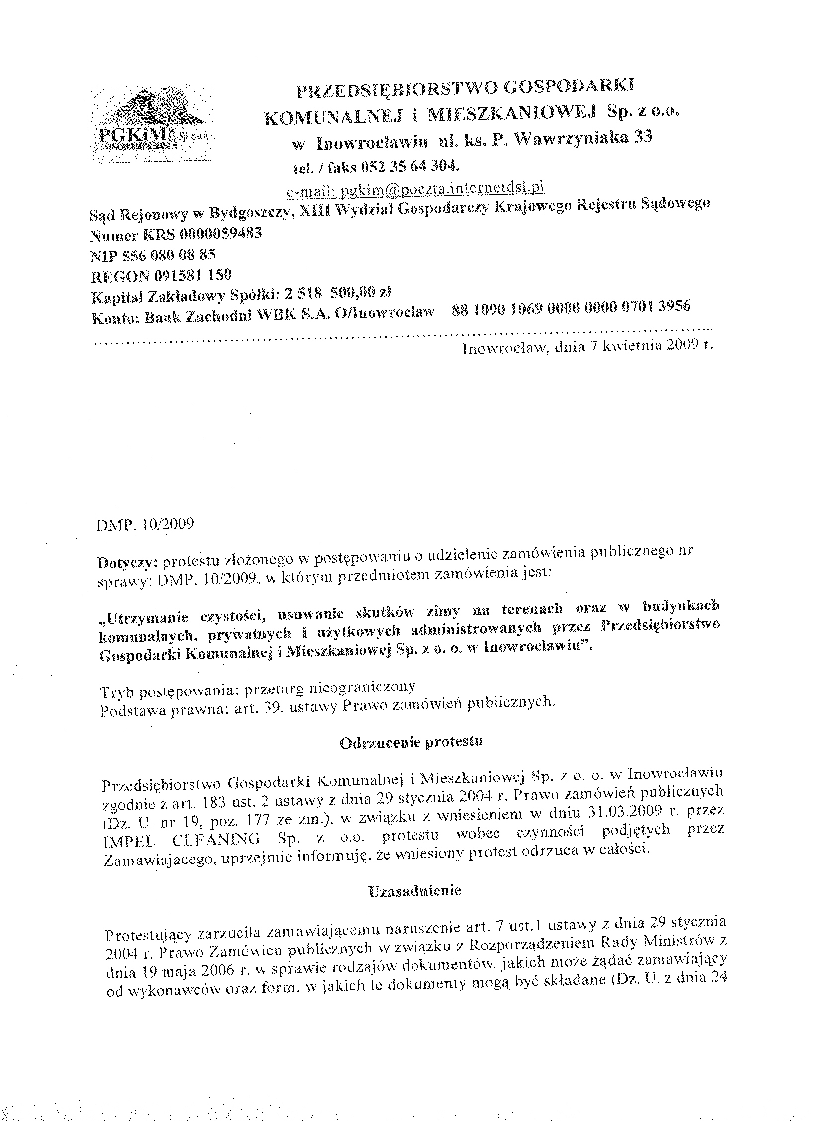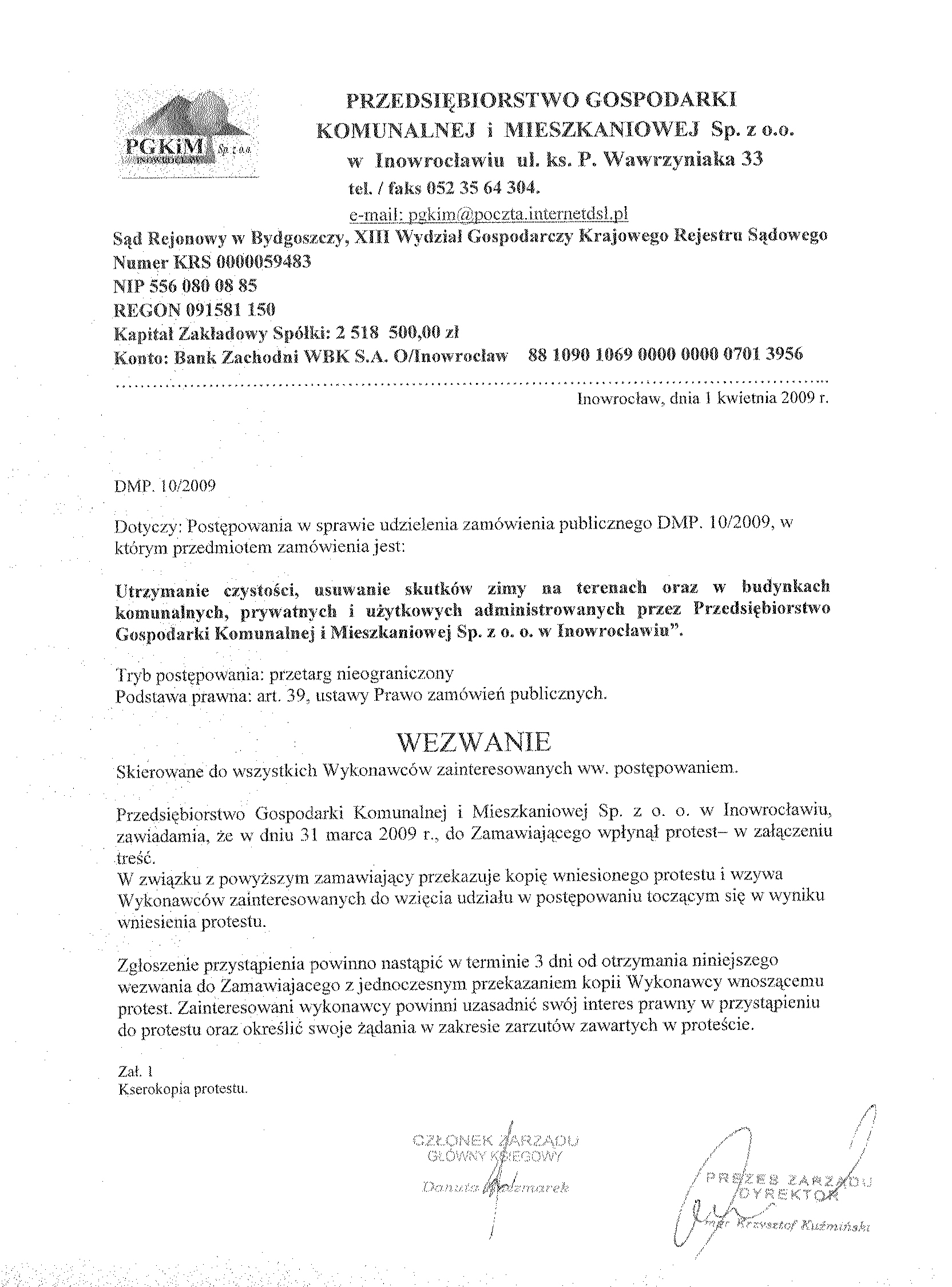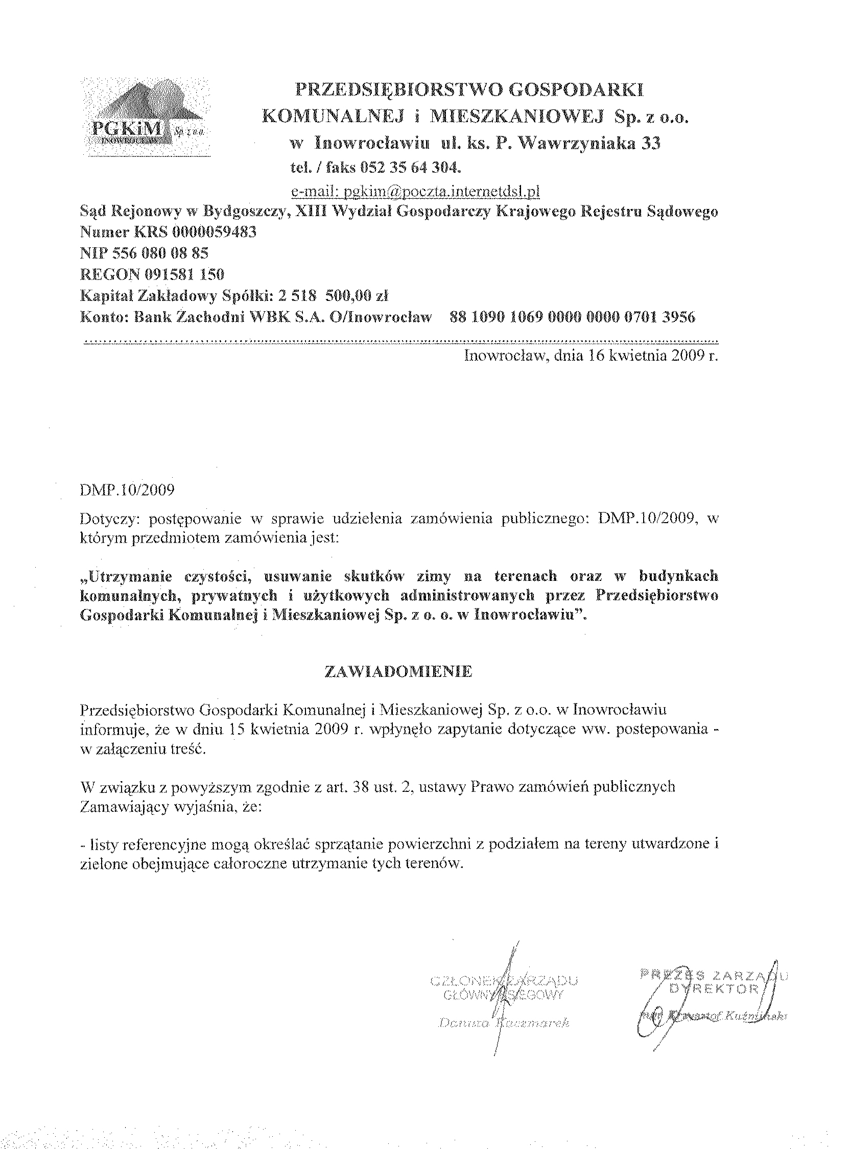 Numer og艂oszenia w WE: S 52- 075253 - 2009, z dnia 17.03.2009 r. W BZP pod numerem 50957- 2009, z dnia 17.03.2009 r. Na stronie internetowej: 17.03.2009 r. Przys艂uguje odwo艂anie 聽 1. Zamawiaj膮cy: Przedsi臋biorstwo Gospodarki Komunalnej i Mieszkaniowej Sp. z o.o. w Inowroc艂awiu, S膮d Rejonowy w Bydgoszczy, XIII Wydzia艂 Gospodarczy Krajowego Rejestru S膮dowego Numer KRS 0000059483 REGON: 091581150 NIP: 556-080-08-85 Kapita艂 Zak艂adowy Sp贸艂ki: 2聽518聽500, 00 z艂 Konto: Bank Zachodni WBK S. A.O/ Inowroc艂aw聽聽聽聽聽 88 1090 1069 0000 0000 0701 3956