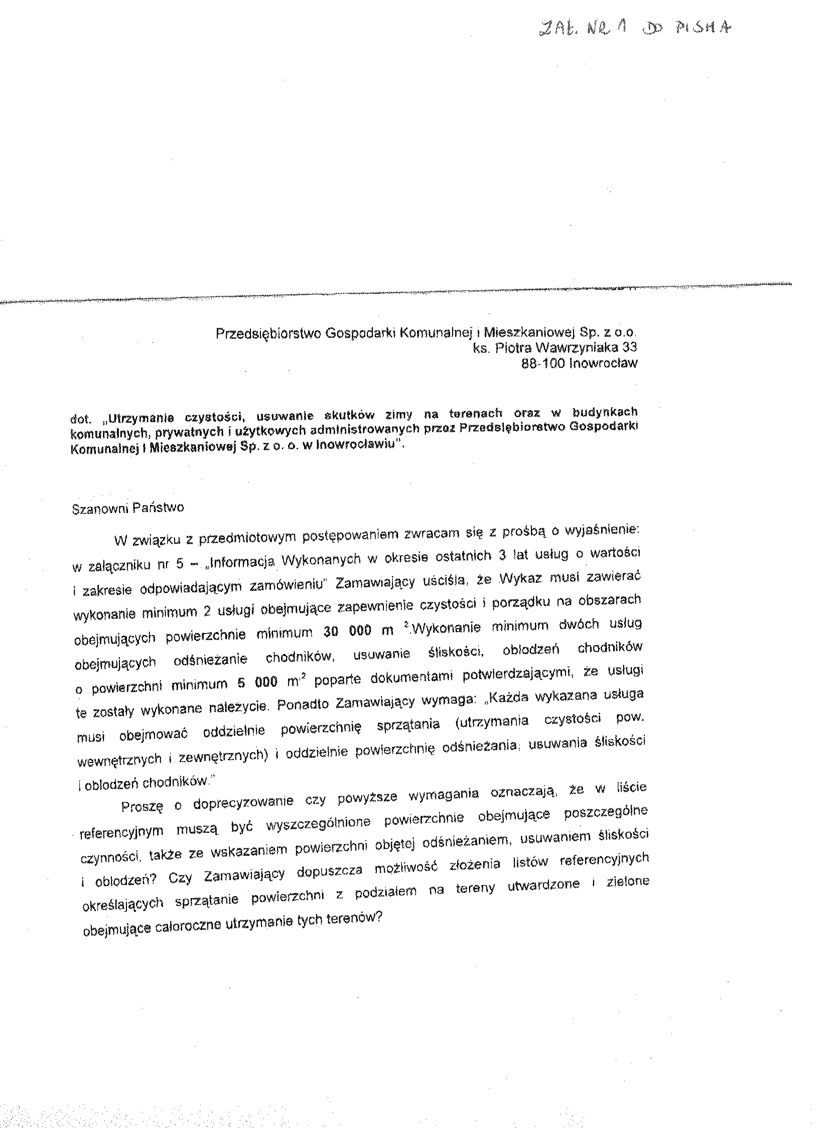 1.1. Osobami uprawnionymi do kontakt贸w z wykonawcami s膮: a) w cz臋艣ci formalnej zam贸wienia - Krystyna Glonek, tel.052 35 64 304, b) w cz臋艣ci merytorycznej zam贸wienia - Zdzis艂awa Molenda, tel. 052聽357 42 78. 聽 1.2. Op艂ata za otrzymanie specyfikacji istotnych warunk贸w zam贸wienia b臋dzie pokrywa膰 jedynie koszty jej druku oraz przekazania. 1.3. Wykonawca zainteresowany post臋powaniem powinien z艂o偶y膰 wniosek u zamawiaj膮cego z podaniem wszystkich danych firmy - niezb臋dnych do przekazywania zmian i zapyta艅 dotycz膮cych powy偶szego post臋powania. 聽 2. Nazwa nadana zam贸wieniu: "Utrzymanie czysto艣ci, usuwanie skutk贸w zimy na terenach oraz w budynkach komunalnych, prywatnych i u偶ytkowych administrowanych przez Przedsi臋biorstwo Gospodarki Komunalnej i Mieszkaniowej Sp. z o. o. w Inowroc艂awiu".