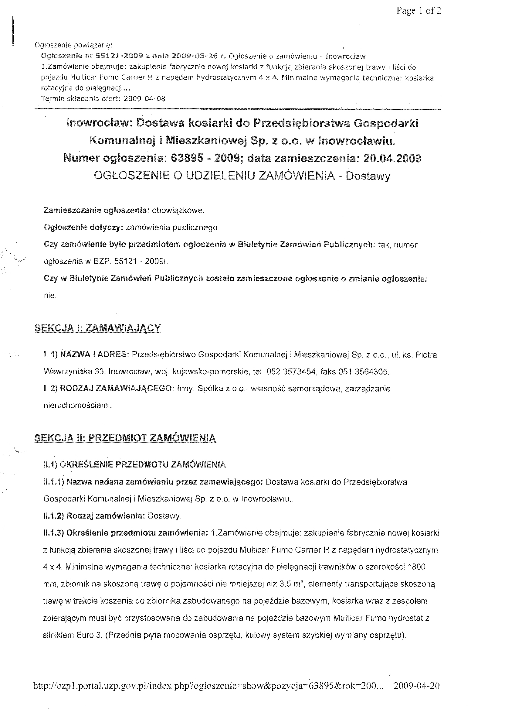 Nazwa nadana zam贸wieniu: "Dostawa kosiarki do Przedsi臋biorstwa Gospodarki Komunalnej i Mieszkaniowej Sp. z聽 o.o. w Inowroc艂awiu". 聽