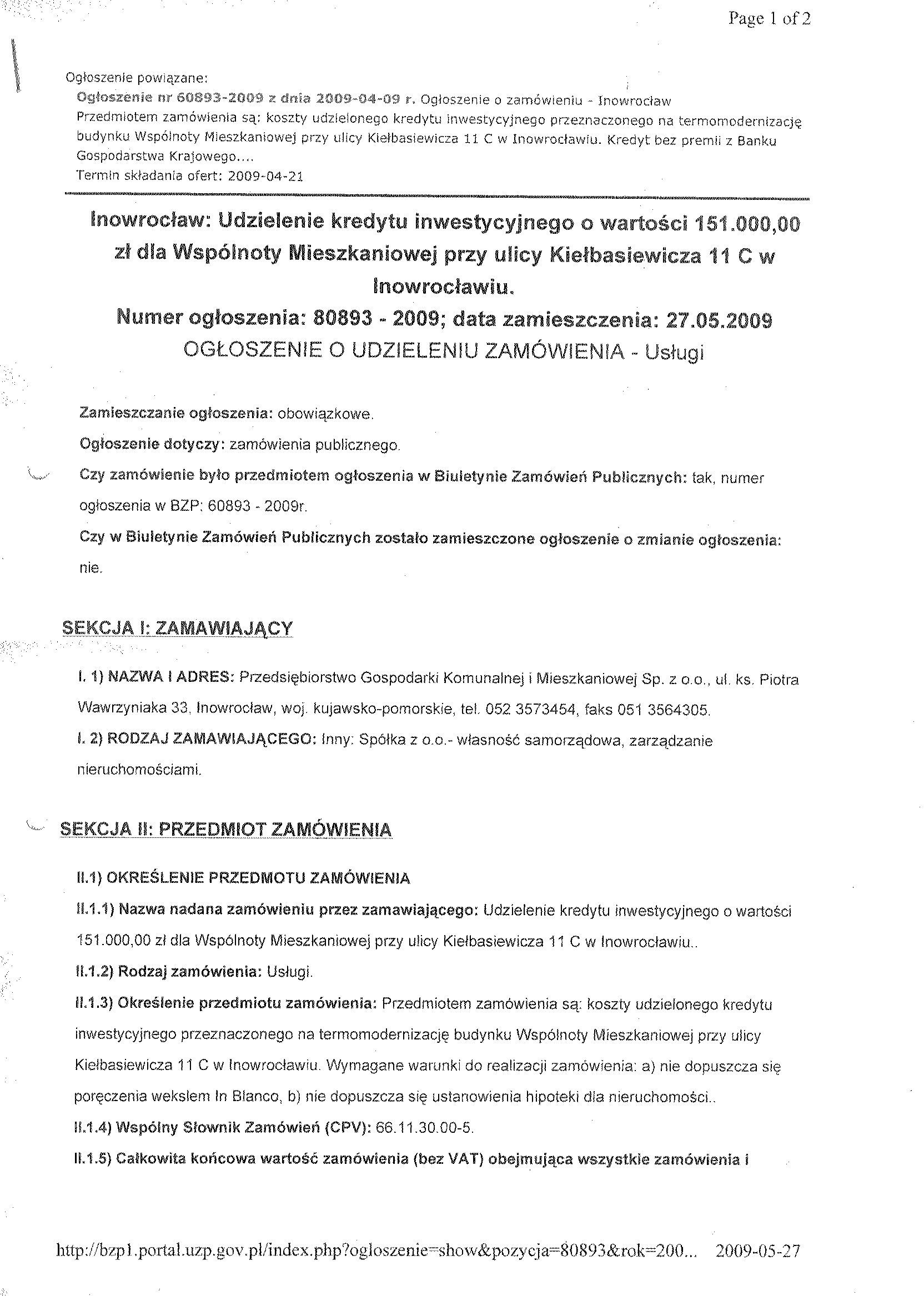 Numer og艂oszenia w BZP: 60893 - 2009; data zamieszczenia 09/04/2009 Na stronie internetowej: 09/04/2009 聽