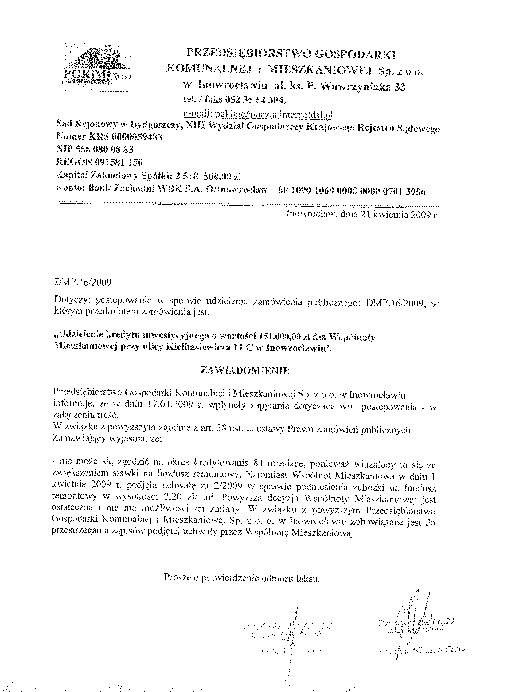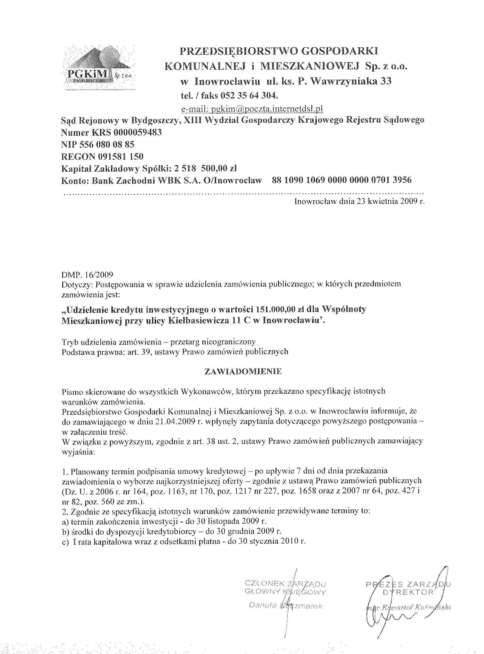 1. Nazwa i adres Zamawiaj膮cego Nazwa: Wsp贸lnota Mieszkaniowa przy ulicy Kie艂basiewicza 11 C w Inowroc艂awiu w imieniu i na rzecz, kt贸rej dzia艂a na mocy umowy powierzenia, Przedsi臋biorstwo Gospodarki Komunalnej i Mieszkaniowej Sp. z o.o. w Inowroc艂awiu