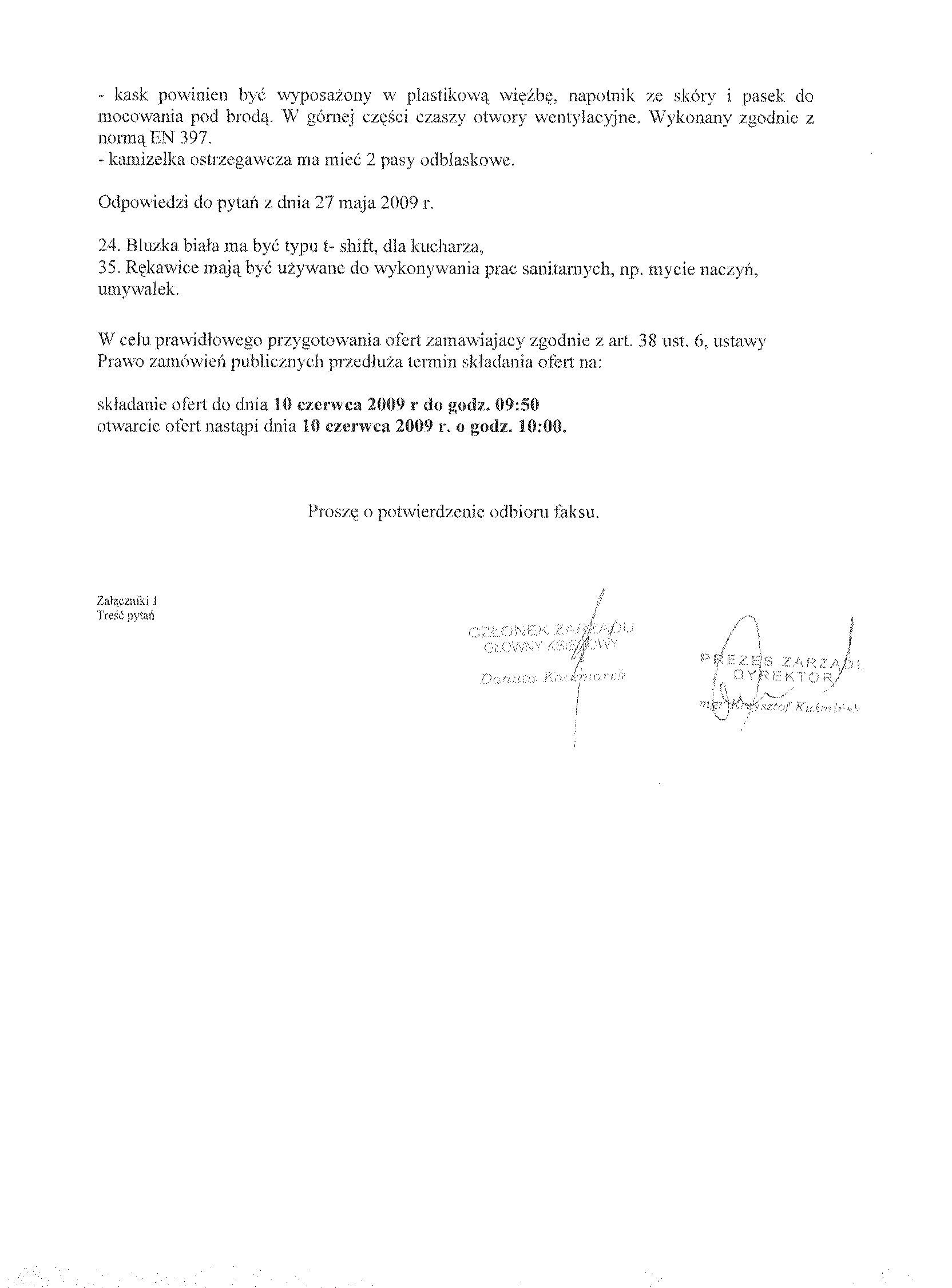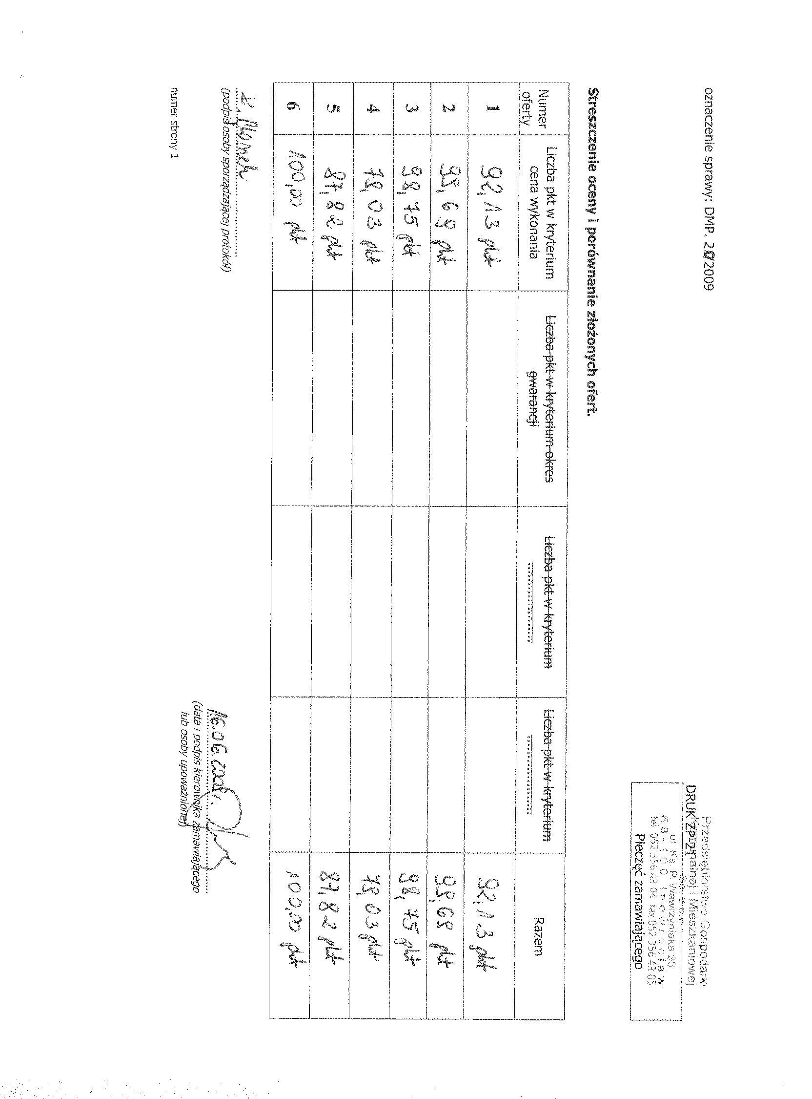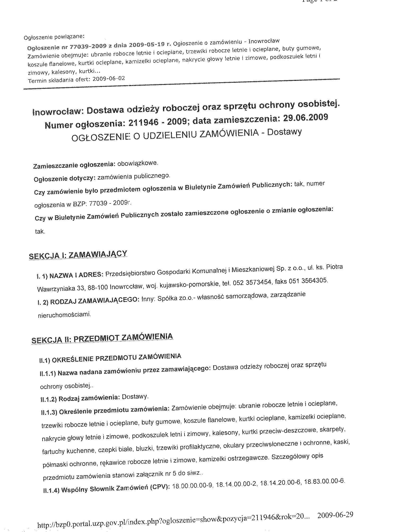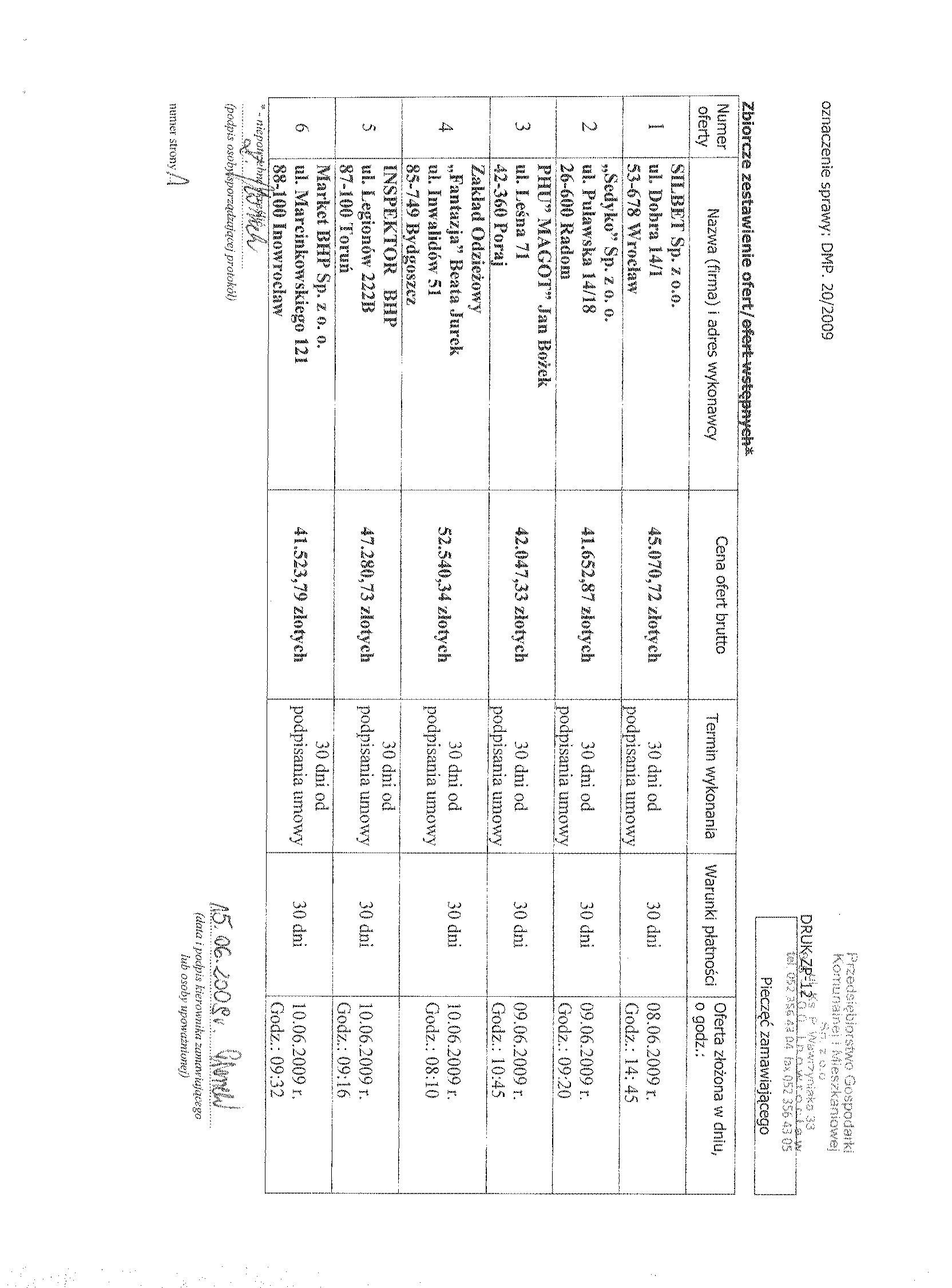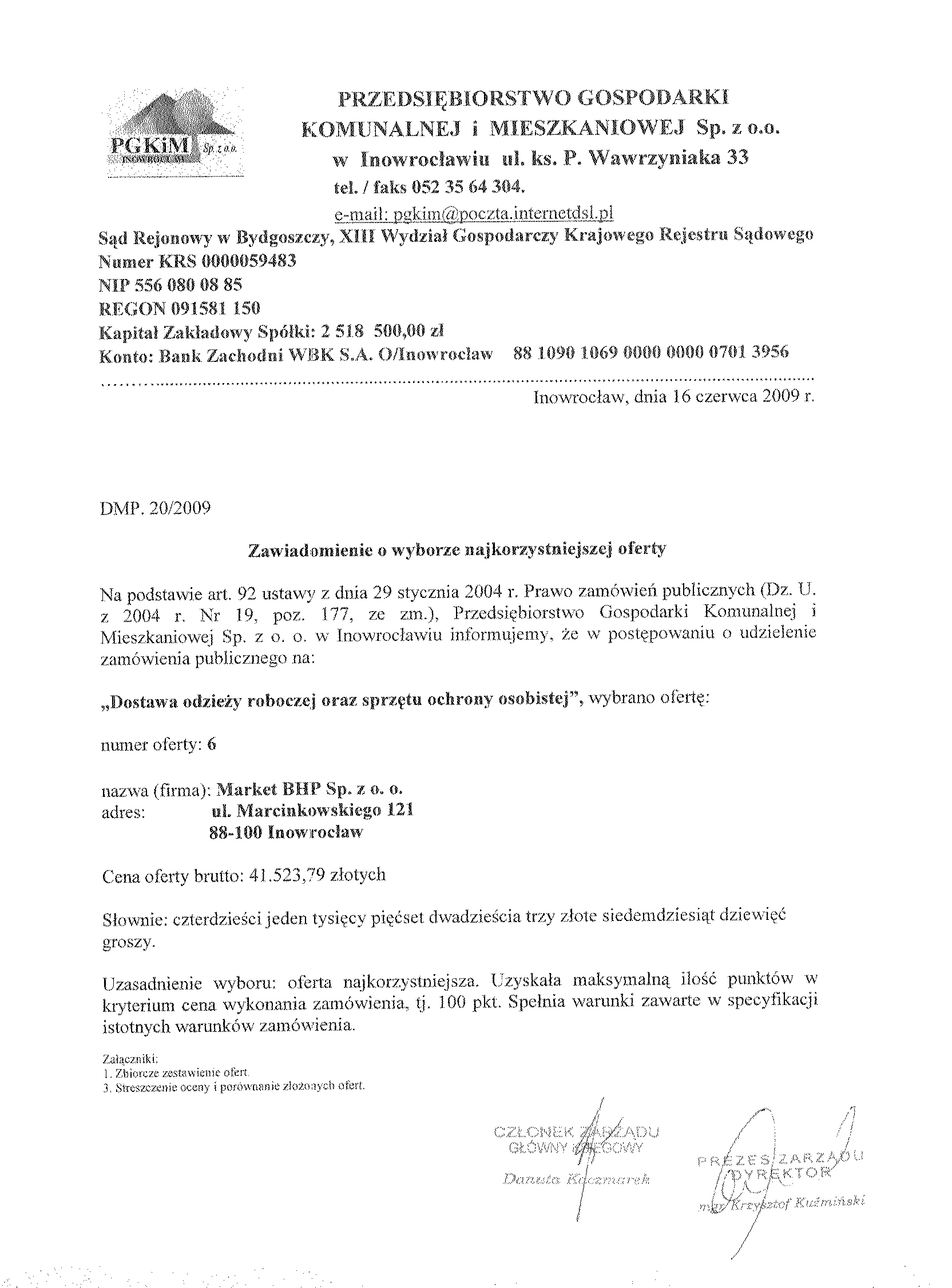 6. Kryteria oceny ofert i ich znaczenie: a) najni偶sza cena 聽 7. Miejsce i termin sk艂adania ofert: Przedsi臋biorstwo Gospodarki Komunalnej i Mieszkaniowej Sp. z o.o. w Inowroc艂awiu, ul. ks. Piotra Wawrzyniaka 33, sekretariat 1 pi臋tro do dnia 2 czerwca 2009 r. do godziny 9:50.