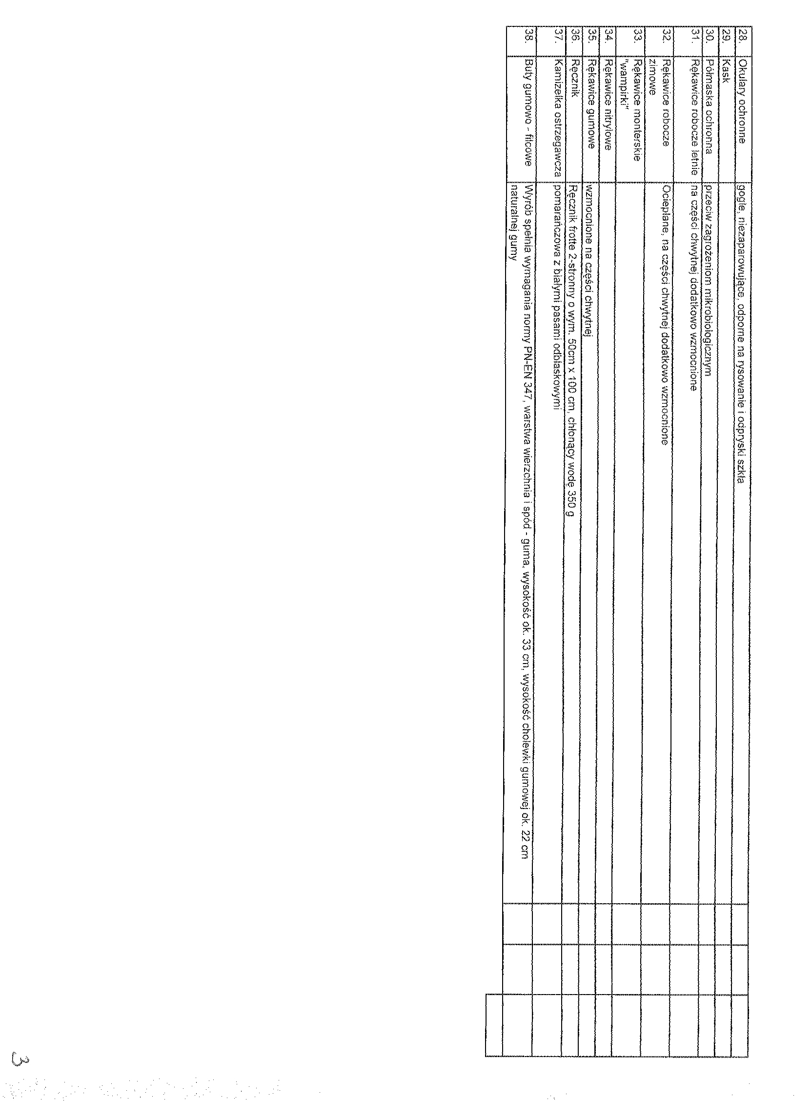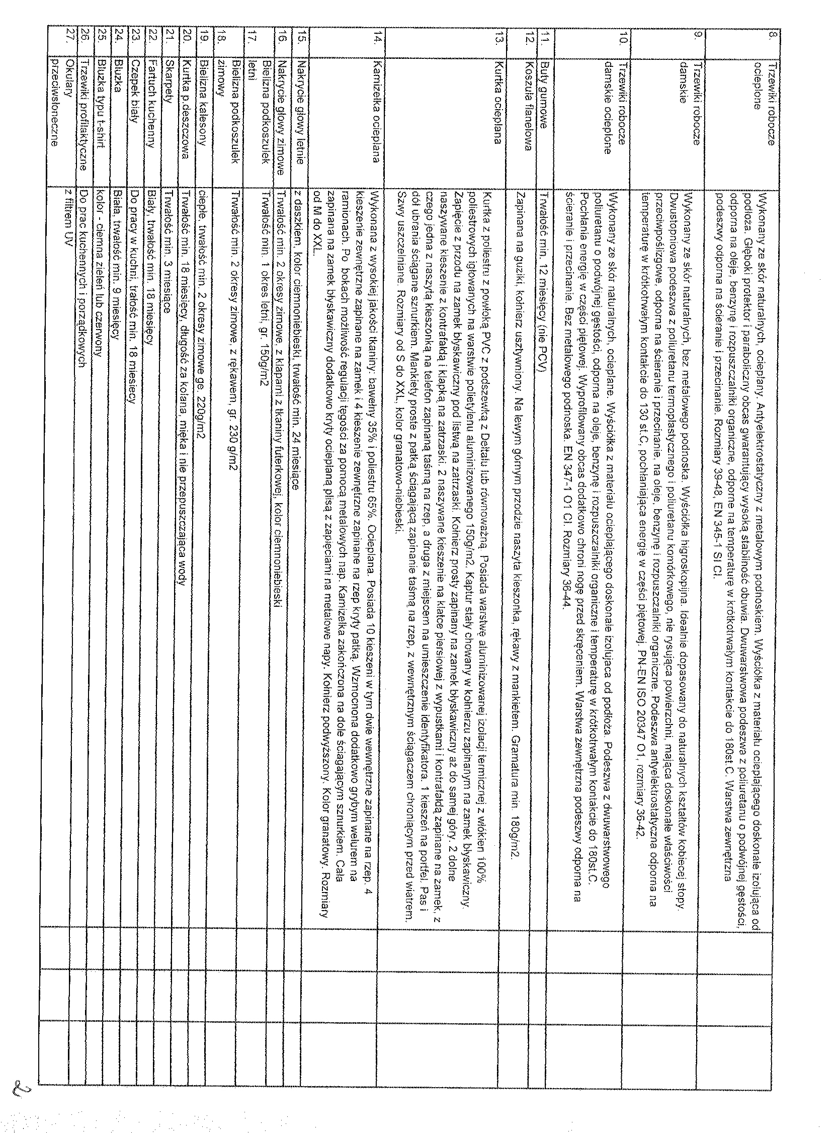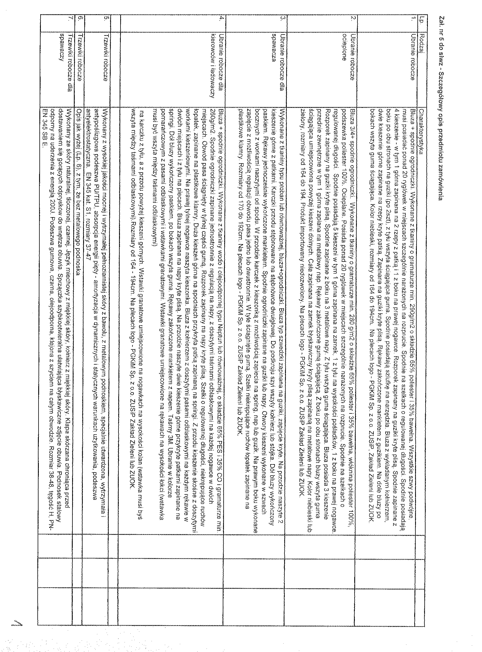 聽 Zam贸wienie obejmuje: ubranie robocze letnie i ocieplane, trzewiki robocze letnie i ocieplane, buty gumowe, koszule flanelowe, kurtki ocieplane, kamizelki ocieplane, nakrycie g艂owy letnie i zimowe, podkoszulek letni i zimowy, kalesony, kurtki przeciw-deszczowe, skarpety, fartuchy kuchenne, czepki bia艂e, bluzki, trzewiki profilaktyczne, okulary przeciws艂oneczne i ochronne, kaski, p贸艂maski ochronne, r臋kawice robocze letnie i zimowe, kamizelki ostrzegawcze. Szczeg贸艂owy opis przedmiotu zam贸wienia stanowi za艂膮cznik nr 5 do siwz. 聽 Wsp贸lny S艂ownik Zam贸wie艅 (CPV): 18.00.00.00 - 9, 18.14.00.00 - 2, 18.14.10.00 - 9, 18.14.20.00 - 6, 18.30.00.00 - 2, 18.83.00.00 - 6. 聽 Zamawiaj膮cy nie dopuszcza sk艂adania ofert cz臋艣ciowych. Zamawiaj膮cy nie dopuszcza sk艂adania ofert wariantowych. Zamawiajacy nie przewiduje zawarcia umowy ramowej, jak r贸wnie偶 nie dokona wyboru oferty najkorzystniejszej z zastosowaniem aukcji elektronicznej. Zamawiaj膮cy nie przewiduje mo偶liwo艣ci ustanowienia dynamicznego systemu zakup贸w. 聽 Miejsce realizacji dostaw: PGKiM Sp. z o.o. ul. Wawrzyniaka 33, 88-100 Inowroc艂aw. 聽 3. Termin wykonania zam贸wienia: od podpisania umowy na okres 12 miesi臋cy.