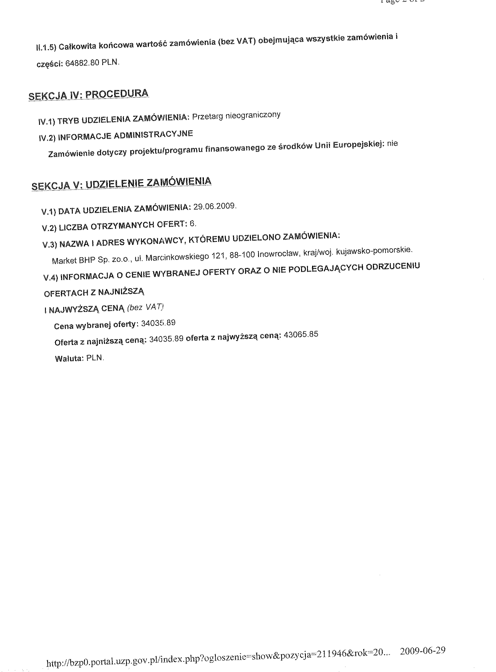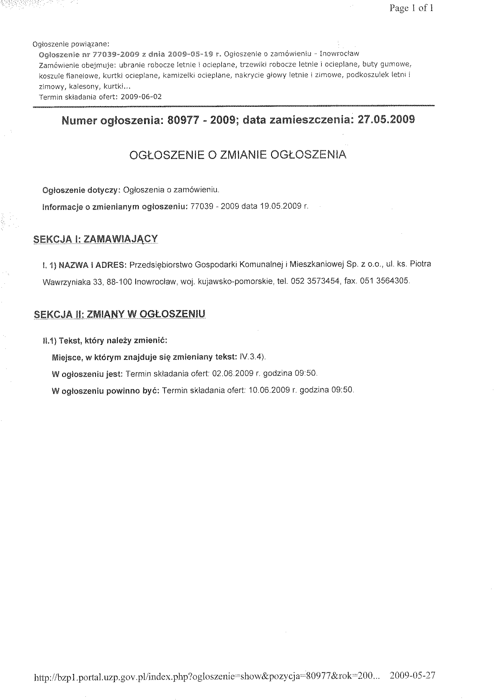 Numer og艂oszenia w BZP: 77039 - 2009, Data zamieszczenia 19/05/2009 聽 Zamieszczenie obowi膮zkowe Zam贸wienia publiczne 聽