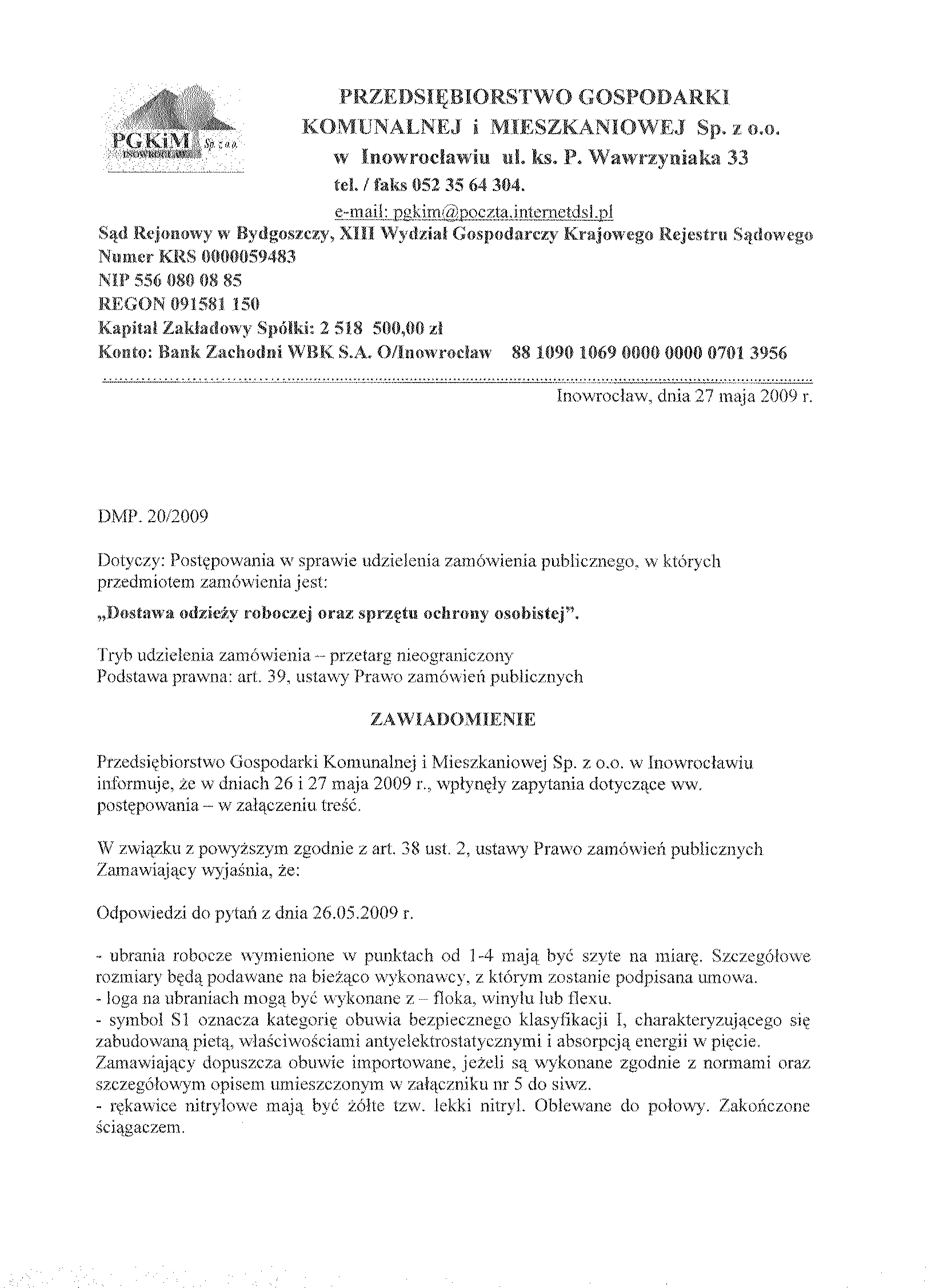 Zamawiaj膮cy: Przedsi臋biorstwo Gospodarki Komunalnej i Mieszkaniowej Sp. z o.o. w Inowroc艂awiu S膮d Rejonowy w Bydgoszczy, XIII Wydzia艂 Gospodarczy Krajowego Rejestru S膮dowego Numer KRS 0000059483 REGON: 091581150 NIP: 556-080-08-85 Kapita艂 Zak艂adowy Sp贸艂ki: 2聽518聽500, 00 z艂 Konto: Bank Zachodni WBK S. A.O/ Inowroc艂aw聽聽聽聽聽 88 1090 1069 0000 0000 0701 3956 聽
