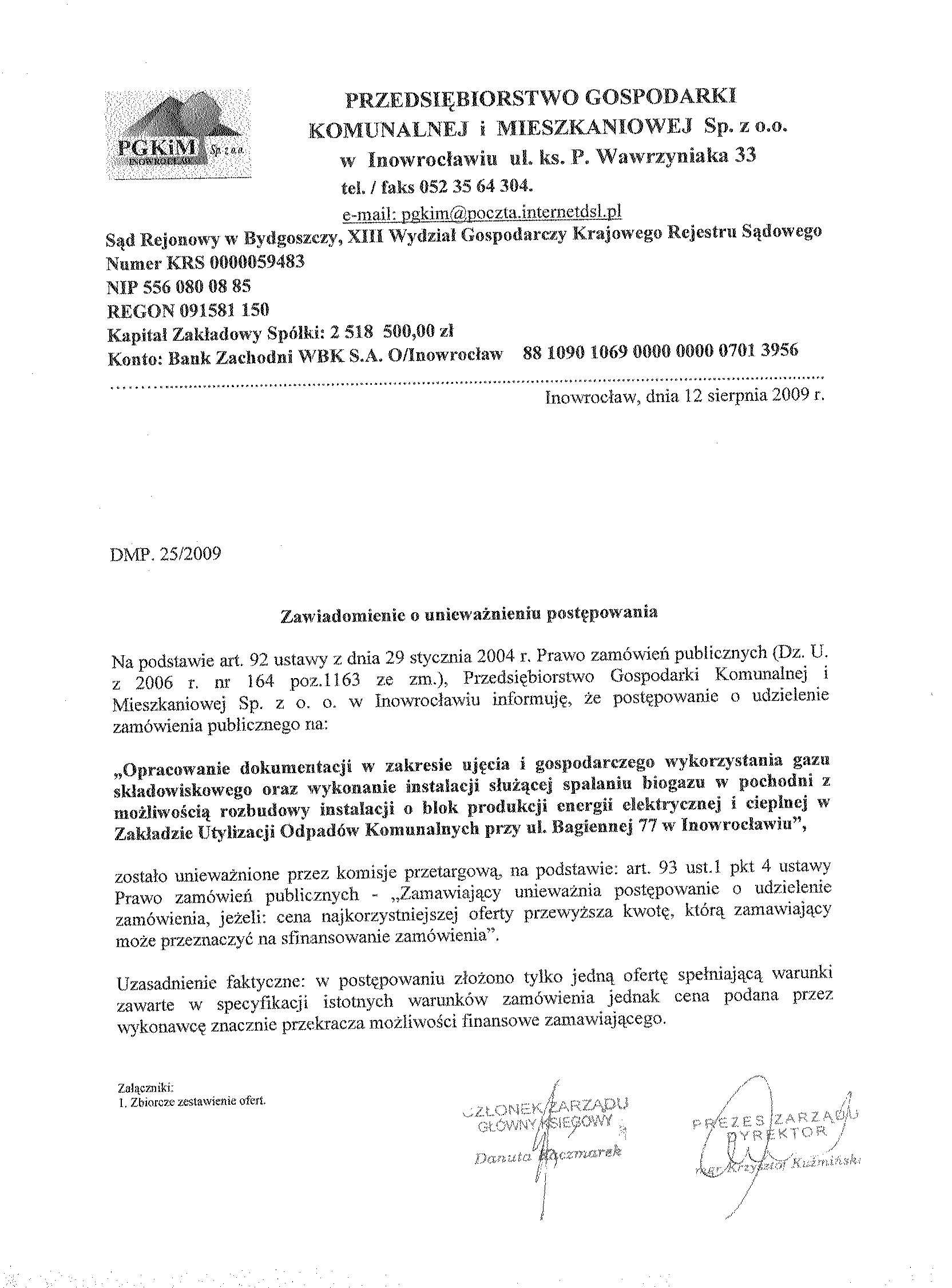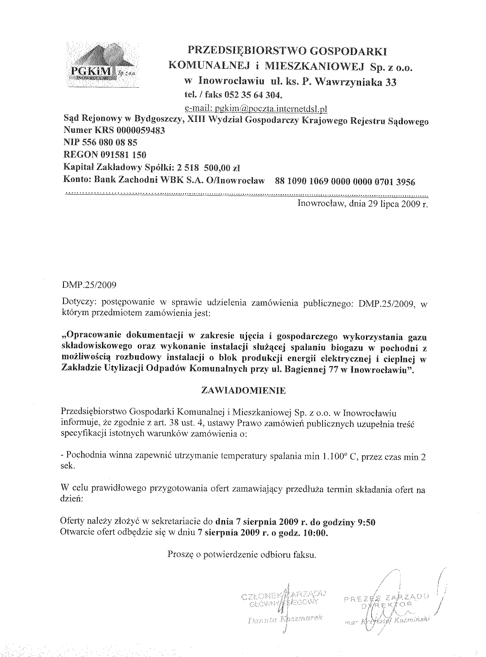 Numer sprawy: DMP.25/2009聽聽聽聽聽聽聽聽聽聽聽聽聽聽聽聽聽聽聽聽聽聽聽聽聽聽聽聽聽聽聽聽聽聽聽聽聽聽 聽Inowroc艂aw, dnia 9 lipca 2009 r.聽聽 聽OG艁OSZENIE O WSZCZ臉CIU POST臉POWANIA 聽 Numer og艂oszenia w BZP: 230326 - 2009; 聽 data zamieszczenia 09/07/2009 r. Zamieszczenie obowi膮zkowe 聽 Zam贸wienia publiczne 1. Zamawiaj膮cy:聽Miasto Inowroc艂aw ul. Roosevelta 36, w imieniu i na rzecz, kt贸rego dzia艂a na mocy umowy o administrowanie, Przedsi臋biorstwo Gospodarki Komunalnej i Mieszkaniowej Sp. z o.o. w Inowroc艂awiu, 聽 Adres pocztowy: 聽 Ulica: ks. Piotra Wawrzyniaka 33 Kod: 88-100, Miejscowo艣膰: Inowroc艂aw Telefon / faks 052 35 64聽304 Adres strony internetowej: www.pgkimino.pl e-mail: pgkim@poczta.internetdsl.pl聽 Adres strony internetowej, na kt贸rej dost臋pna jest specyfikacja istotnych warunk贸w zam贸wienia: http://pgkim-inowroclaw.samorzady.pl 聽 Rodzaj zamawiaj膮cego: Sp贸艂ka z o. o. - w艂asno艣膰 samorz膮dowa, zarz膮dzanie nieruchomo艣ciami 聽 1.1. Osobami uprawnionymi do kontakt贸w z Wykonawcami s膮: 聽 a) w cz臋艣ci formalnej zam贸wienia - Krystyna Glonek, tel./ faks 052 35 64 304, b) w cz臋艣ci merytorycznej zam贸wienia - Lidia Owedyk, tel. 052聽352 76 13. 聽1.2. Op艂ata za otrzymanie specyfikacji istotnych warunk贸w zam贸wienia b臋dzie pokrywa膰 jedynie koszty jej druku oraz przekazania. 1.3. Wykonawca zainteresowany post臋powaniem powinien z艂o偶y膰 wniosek u zamawiaj膮cego z podaniem wszystkich danych firmy - niezb臋dnych do przekazywania zmian i zapyta艅 dotycz膮cych powy偶szego post臋powania. 聽2. Nazwa nadana zam贸wieniu: "Opracowanie dokumentacji w zakresie uj臋cia i gospodarczego wykorzystania gazu sk艂adowiskowego oraz wykonanie instalacji s艂u偶膮cej spalaniu biogazu w pochodni z mo偶liwo艣ci膮 rozbudowy instalacji o blok produkcji energii elektrycznej i cieplnej w Zak艂adzie Utylizacji Odpad贸w Komunalnych przy ul. Bagiennej 77 w Inowroc艂awiu". Rodzaj zam贸wienia: robota budowlana 聽 2.1. Zam贸wienie sk艂ada si臋 z: przygotowania dokumentacji projektowo-kosztorysowej i wykonawczej wraz z uzyskaniem wszelkich niezb臋dnych decyzji i zezwole艅, w zakresie transportu przygotowanie do spalania, spalanie w pochodni oraz po uzasadnieniu ekonomicznym biogazu energetycznego do spalania, budowy instalacji ujmuj膮cej, transportuj膮cej i przygotowuj膮cej gaz do spalania, budowa pochodni spalaj膮cej gaz sk艂adowiskowy. 聽 聽2.2. Przedmiotem zam贸wienia jest: a) wykonanie bilansu gazu sk艂adowiskowego i wskazanie na ew. mo偶liwo艣膰 energetycznego聽 wykorzystania biogazu, ekonomiczne uzasadnienie decyzji,聽 b) opracowanie dokumentacji - wszystkich bran偶, w zakresie uj臋cia, przesy艂u, przygotowania gazu sk艂adowiskowego, ew. gospodarczego wykorzystania gazu sk艂adowiskowego c) wykonanie w oparciu o przygotowan膮 dokumentacj臋 instalacji do uj臋cia, przesy艂u przygotowania do spalania biogazu, d) wykonanie instalacji s艂u偶膮cej spalaniu biogazu w pochodni z mo偶liwo艣ci膮 rozbudowy instalacji o blok produkcji energii elektrycznej i cieplnej w Zak艂adzie Utylizacji Odpad贸w Komunalnych przy ul. Bagiennej 77 w Inowroc艂awiu, (budowa bloku energetycznego b臋dzie przedmiotem odr臋bnego post臋powania) e) uzyskanie wszystkich uzgodnie艅, decyzji, pozwole艅 niezb臋dnych dla realizacji zadania. f) opracowanie instrukcji eksploatacji zrealizowanej instalacji, bhp i p.po偶, g) przeszkolenie za艂ogi w zakresie obs艂ugi instalacji, h) w okresie gwarancji wykonawca zapewni serwis naprawczy. Czas reakcji do 24 godzin od momentu zg艂oszenia usterki. 2.3.Wsp贸lny S艂ownik Zam贸wie艅 (CPV):聽45230000-5 - Roboty budowlane w zakresie budowy ruroci膮g贸w, ci膮g贸w komunikacyjnych i linii energetycznych. 聽 71320000-7 - Us艂ugi in偶ynieryjne w zakresie projektowania 聽Nie dopuszcza si臋 sk艂adania ofert cz臋艣ciowych. Nie dopuszcza si臋 sk艂adania ofert wariantowych. Zamawiaj膮cy nie przewiduje zawarcia umowy ramowej, jak r贸wnie偶 nie dokona wyboru oferty najkorzystniejszej z zastosowaniem aukcji elektronicznej. Zamawiaj膮cy nie przewiduje mo偶liwo艣ci ustanowienia dynamicznego systemu zakup贸w. 聽2.3. Termin (okres) realizacji zam贸wienia:聽30.04.2010 r. cz臋艣膰 dotycz膮ca instalacji ssawy Dokumentacj臋 nale偶y przygotowa膰 do 30.09.2009 r. Budowa instalacji uj臋cia, przesy艂u, spalania - 30.11.2009 r. 3. O udzielenie zam贸wienia mog膮 ubiega膰 si臋 wy艂膮cznie Wykonawcy, kt贸rzy: 聽 a) posiadaj膮 uprawnienia do wykonywania okre艣lonej dzia艂alno艣ci lub czynno艣ci, je偶eli ustawy nak艂adaj膮 obowi膮zek posiadania takich uprawnie艅, b) posiadaj膮 niezb臋dn膮 wiedz臋 i do艣wiadczenie oraz dysponuj膮 potencja艂em techniczny i osobami zdolnymi do wykonania zam贸wienia lub przedstawi膮 pisemne zobowi膮zanie innych podmiot贸w do udost臋pnienia potencja艂u technicznego i os贸b zdolnych do wykonania zam贸wienia, c) znajduj膮 si臋 w sytuacji ekonomicznej i finansowej zapewniaj膮cej wykonanie zam贸wienia, d) nie podlegaj膮 wykluczeniu z post臋powania o udzielenie zam贸wienia. 聽Zamawiaj膮cy oceni spe艂nienie warunk贸w wymienionych w niniejszym rozdziale na podstawie z艂o偶onych przez Wykonawc臋 do oferty, o艣wiadcze艅 i dokument贸w. 聽聽聽聽聽聽聽聽聽聽聽聽聽聽聽聽聽聽Ocena spe艂niania warunk贸w dokonana zostanie na zasadzie: 聽聽聽聽聽聽聽聽聽聽聽聽聽聽聽聽聽聽聽聽聽聽聽聽聽聽聽聽聽聽聽聽聽聽聽聽聽聽聽聽聽聽聽聽聽聽 spe艂nia/ nie spe艂nia 4. W celu potwierdzenia, 偶e Wykonawca posiada uprawnienie do wykonywania okre艣lonej dzia艂alno艣ci lub czynno艣ci oraz nie podlega wykluczeniu na podstawie art. 24 ustawy z dnia 29 stycznia 2004 r. - Prawo zam贸wie艅 publicznych, zamawiaj膮cy 偶膮da, nast臋puj膮cych dokument贸w: 聽 a) aktualnego odpisu z w艂a艣ciwego rejestru