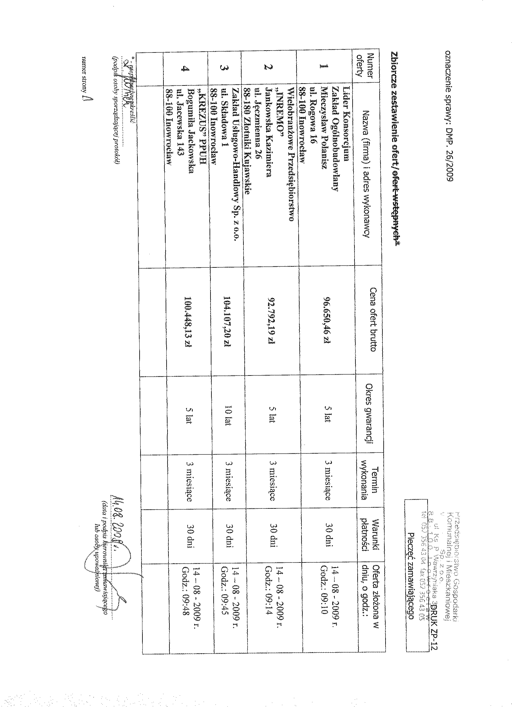 13. Miejsce i termin sk艂adania ofert: oferty nale偶y z艂o偶y膰 w sekretariacie Przedsi臋biorstwa Gospodarki Komunalnej i Mieszkaniowej Sp. z o.o., ul. ks. Piotra Wawrzyniaka 33, 88-100 Inowroc艂aw, do dnia 14 sierpnia 2009 r. do godziny 9:50. 聽 14. Kryteria wyboru ofert: 聽聽聽 聽a)聽 cena wykonania zam贸wienia聽 80 聽聽聽聽 b) gwarancja聽 20 聽