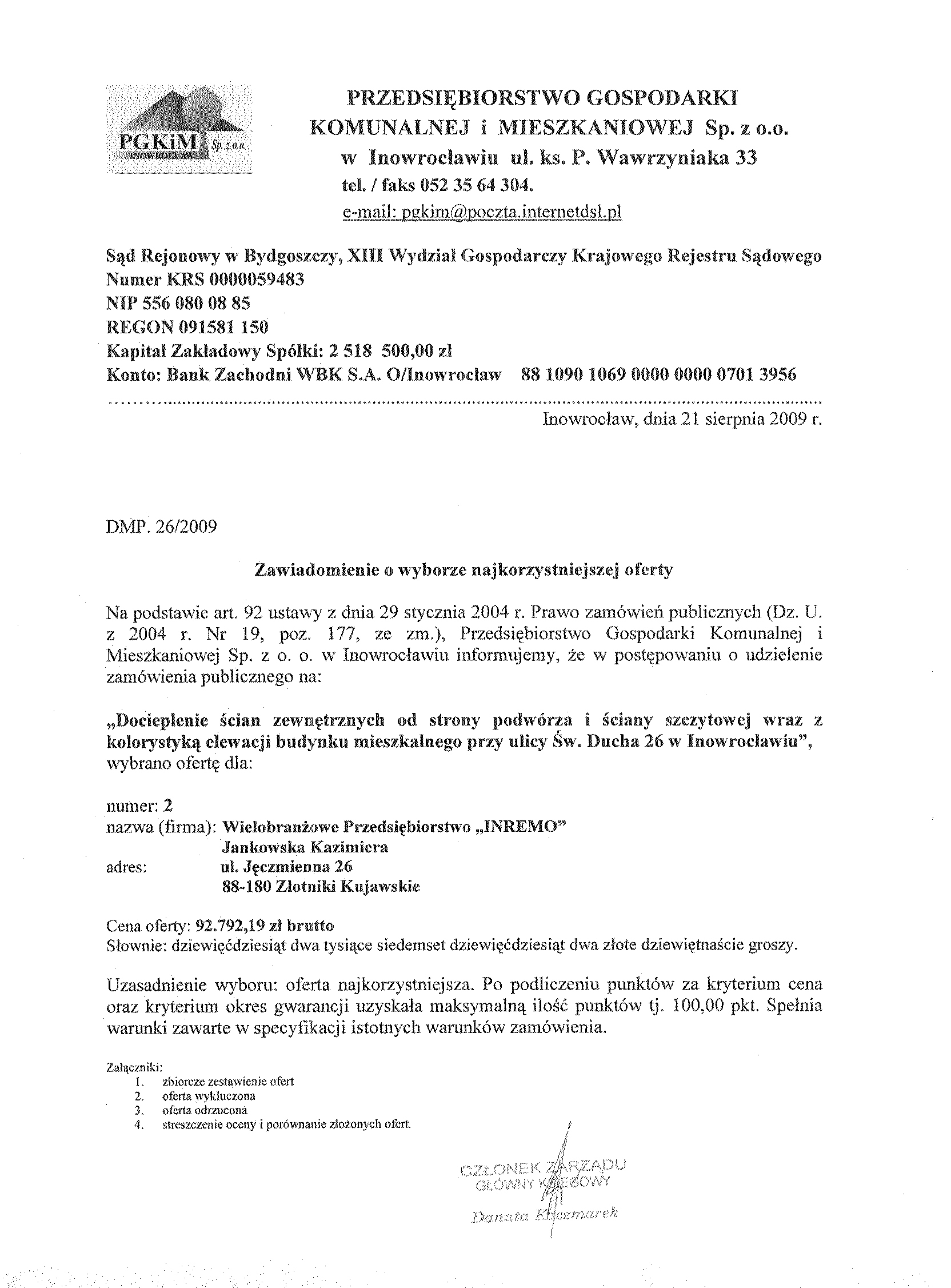 聽 Nazwa: Wsp贸lnota Mieszkaniowa przy ulicy 艢w. Ducha 26 w Inowroc艂awiu w imieniu i na rzecz, kt贸rej dzia艂a na mocy umowy powierzenia, Przedsi臋biorstwo Gospodarki Komunalnej i Mieszkaniowej Sp. z o.o. w Inowroc艂awiu