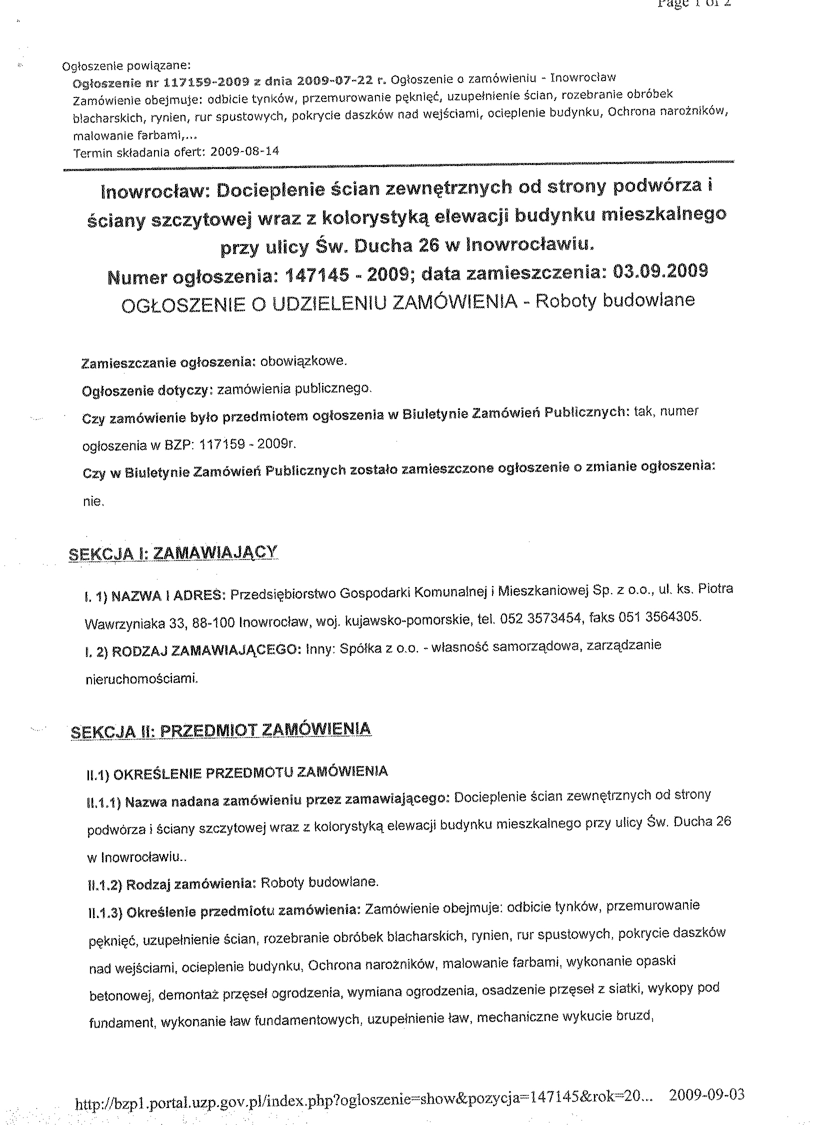 Nazwa nadana zam贸wieniu: "Docieplenie 艣cian zewn臋trznych od strony podw贸rza i 艣ciany szczytowej wraz z kolorystyk膮 elewacji budynku mieszkalnego przy ulicy 艢w. Ducha 26 w Inowroc艂awiu". 聽