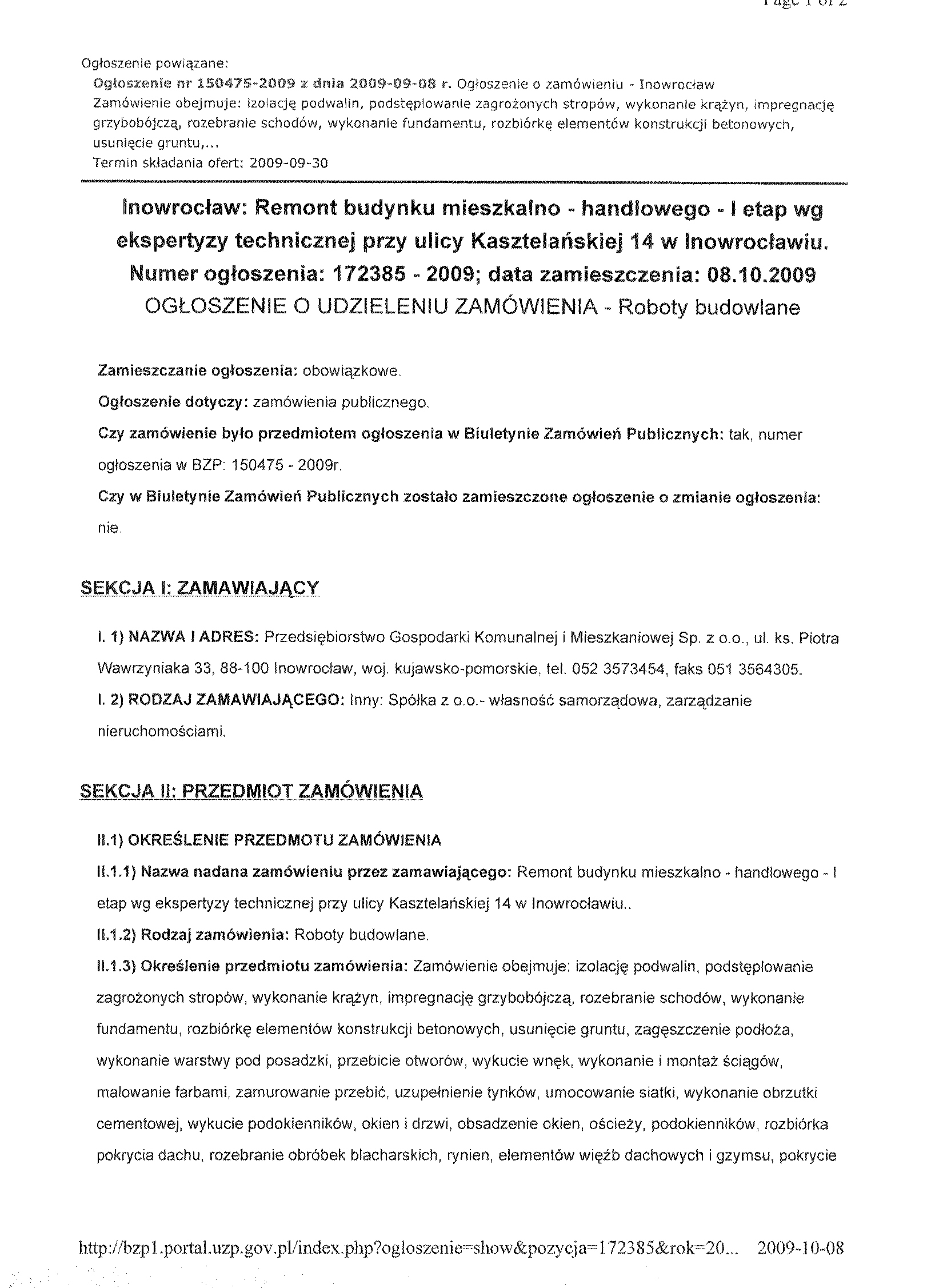 Nazwa nadana zam贸wieniu: "Remont budynku mieszkalno - handlowego - I etap wg ekspertyzy technicznej przy ulicy Kasztela艅skiej 14 w Inowroc艂awiu". 聽 Zam贸wienie obejmuje: izolacj臋 podwalin, podst臋plowanie zagro偶onych strop贸w, wykonanie kr膮偶yn, impregnacj臋 grzybob贸jcz膮, rozebranie schod贸w, wykonanie fundamentu, rozbi贸rk臋 element贸w konstrukcji betonowych, usuni臋cie gruntu, zag臋szczenie pod艂o偶a, wykonanie warstwy pod posadzki, przebicie otwor贸w, wykucie wn臋k, wykonanie i monta偶 艣ci膮g贸w, malowanie farbami, zamurowanie przebi膰, uzupe艂nienie tynk贸w, umocowanie siatki, wykonanie obrzutki cementowej, wykucie podokiennik贸w, okien i drzwi, obsadzenie okien, o艣cie偶y, podokiennik贸w, rozbi贸rka pokrycia dachu, rozebranie obr贸bek blacharskich, rynien, element贸w wi臋藕b dachowych i gzymsu, pokrycie dachu pap膮 termozgrzewaln膮, impregnacj臋 grzybob贸jcz膮, wywiezienie i utylizacj臋 gruzu. 聽 5. Nie dopuszcza si臋 sk艂adania ofert cz臋艣ciowych. 6. Nie dopuszcza si臋 sk艂adania ofert wariantowych. 7. Zamawiaj膮cy nie przewiduje zawarcia umowy ramowej, jak r贸wnie偶 nie dokona wyboru oferty najkorzystniejszej z zastosowaniem aukcji elektronicznej. 8. Zamawiaj膮cy nie przewiduje mo偶liwo艣ci ustanowienia dynamicznego systemu zakup贸w. 聽 9. Osobami uprawnionymi do kontakt贸w z wykonawcami s膮: a) w cz臋艣ci formalnej zam贸wienia - Krystyna Glonek, tel.052 3564 304, b) w cz臋艣ci merytorycznej zam贸wienia聽-Anna Nawrocka, tel. 052 35 64聽325. 聽 10. Po偶膮dany termin realizacji zam贸wienia: do 30 listopada 2009 r. 聽